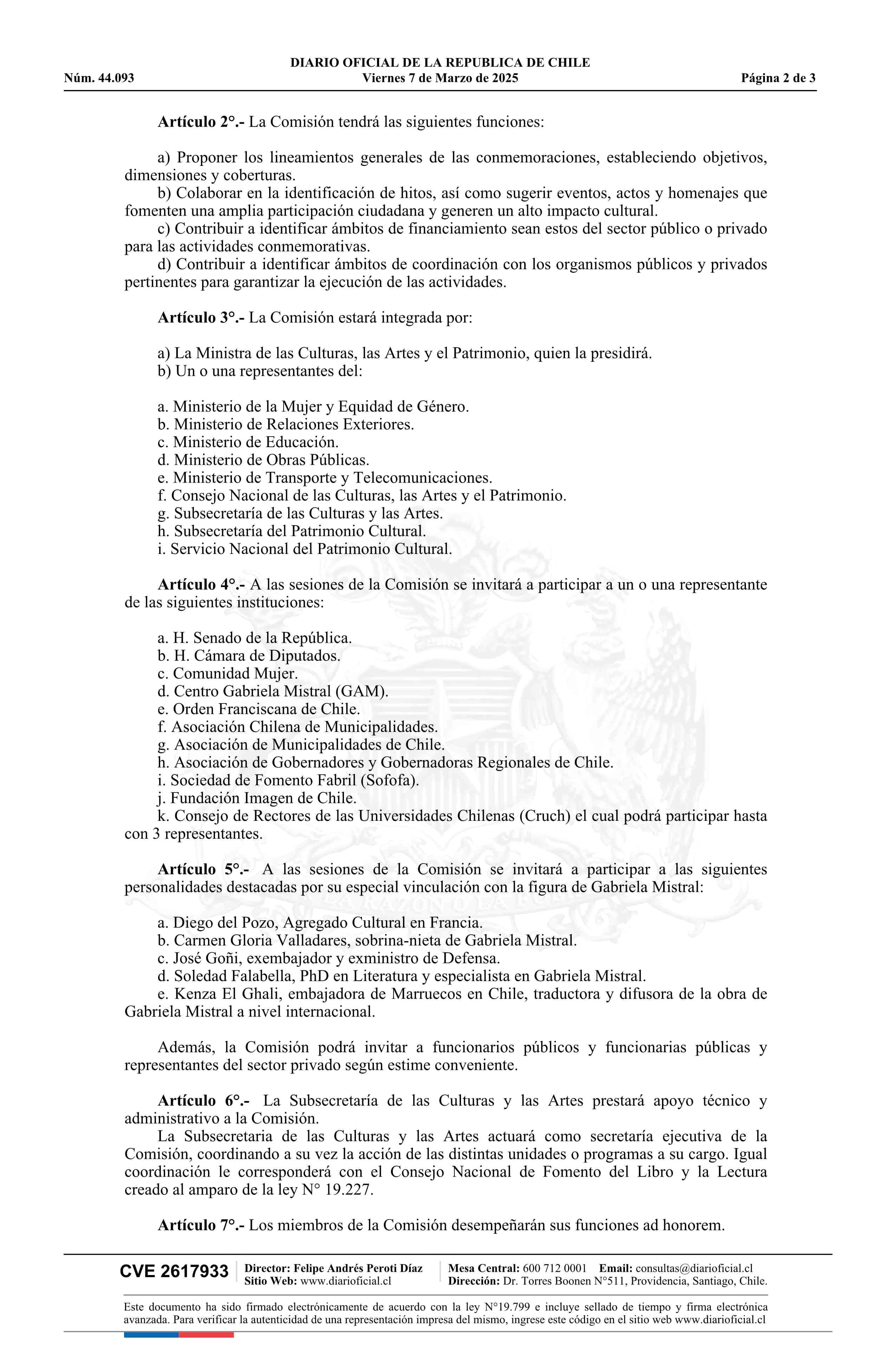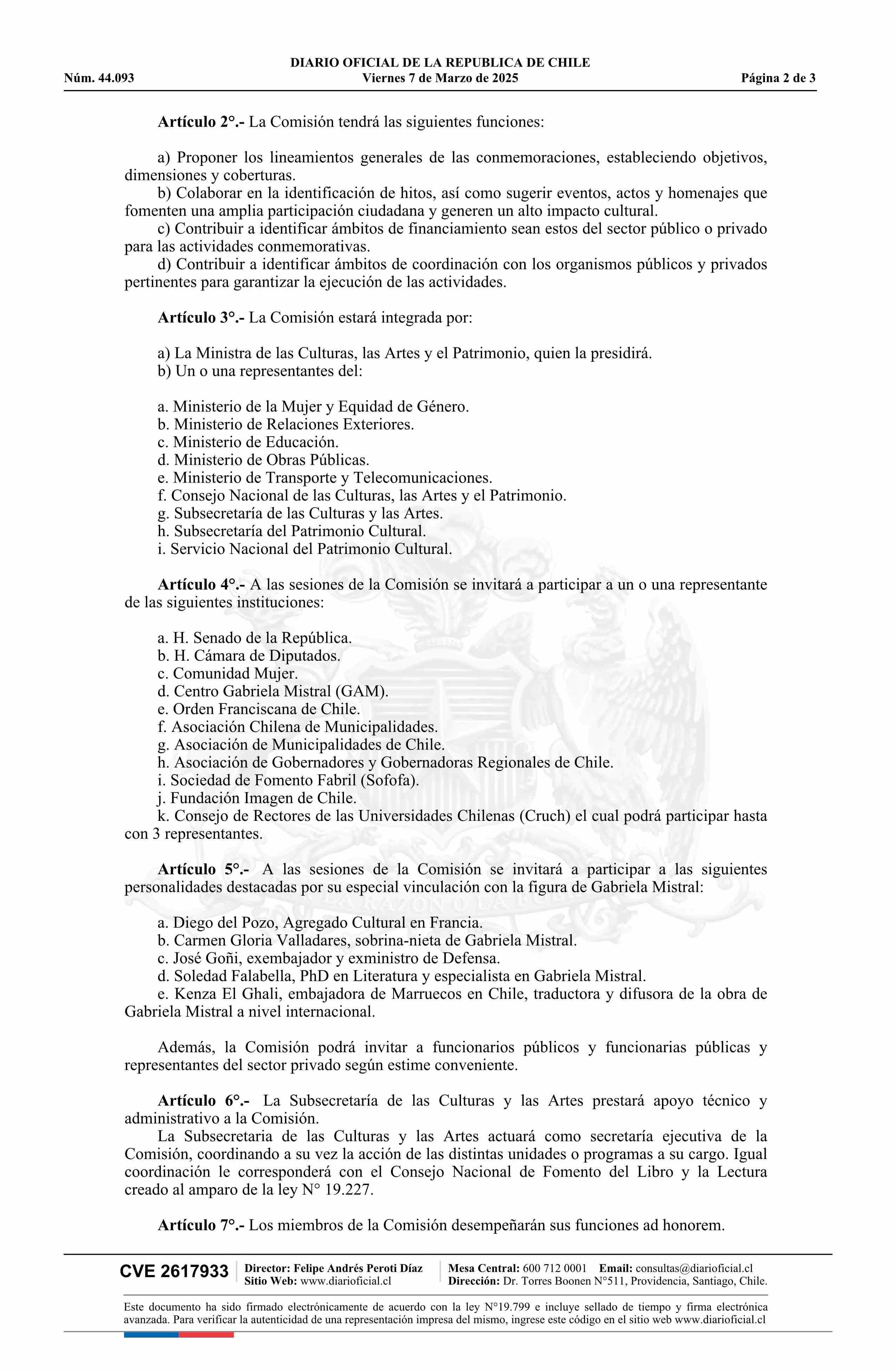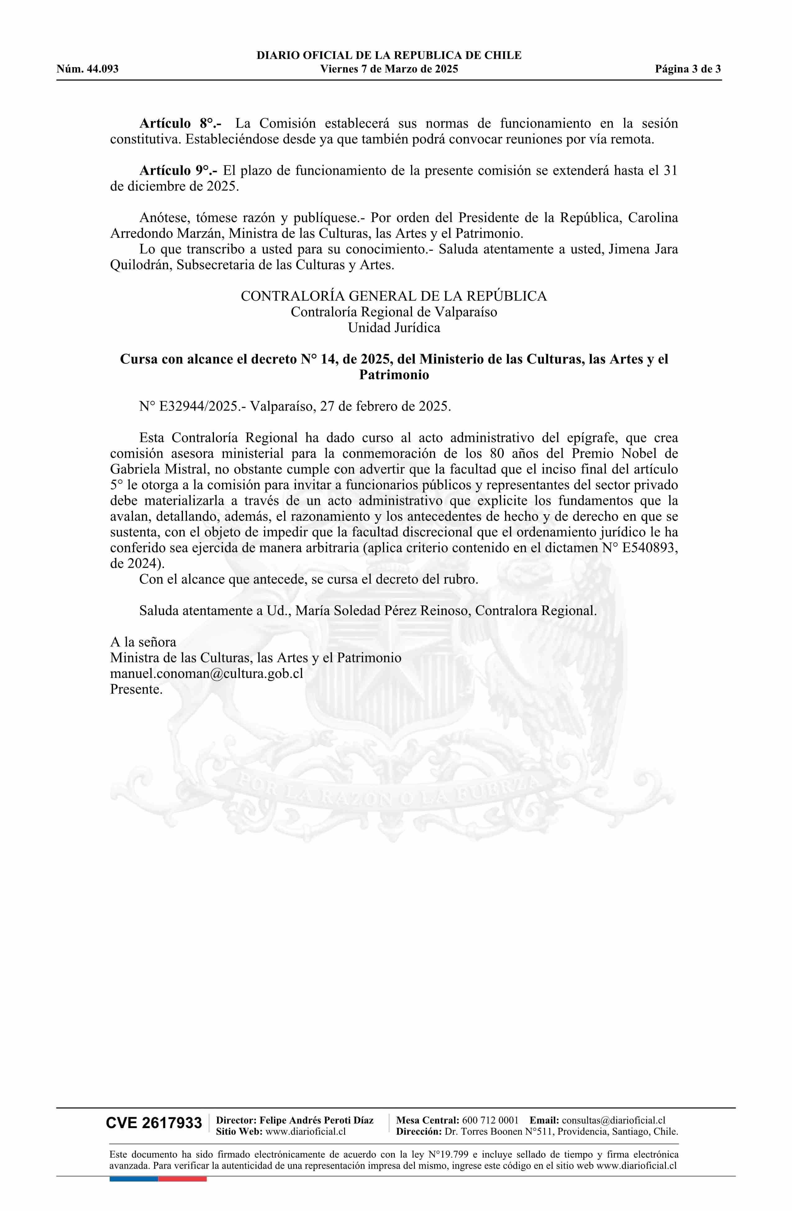 Decreto número 14, de 2025.- Crea Comisión Asesora Ministerial para la conmemoración de los 80 años del Premio Nobel de Gabriela Mistral 07-03-2025 Diario Oficial Edición Electrónica |