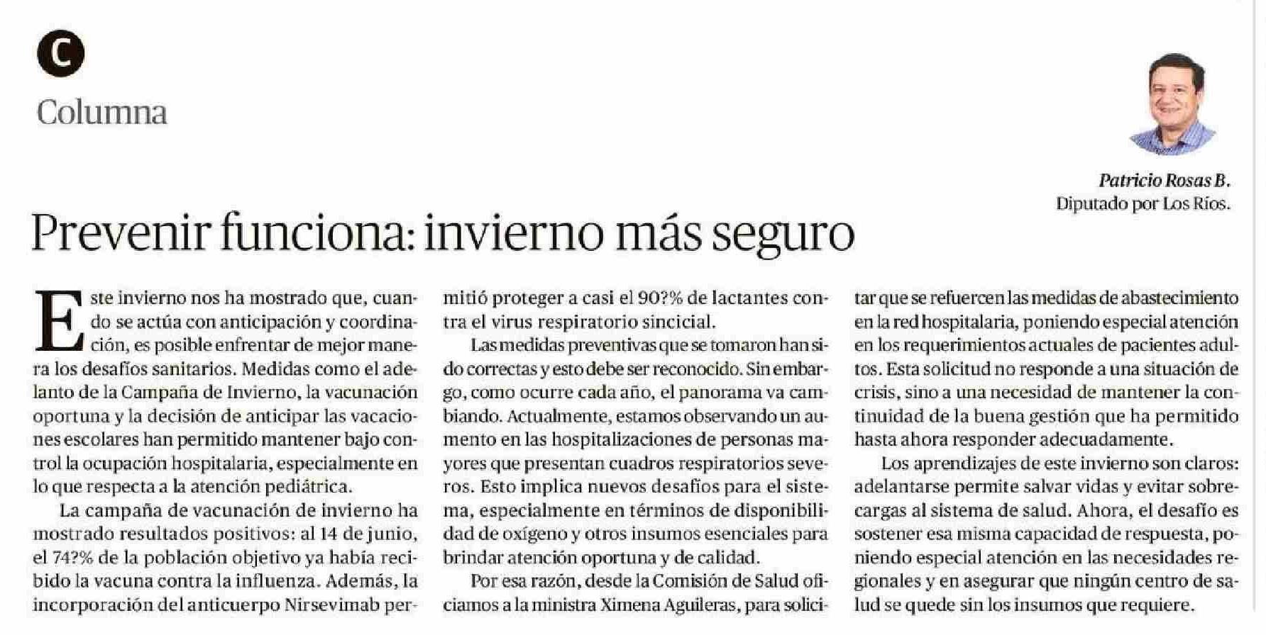 Columnas de Opinión: Prevenir funciona: invierno más seguro 21-06-2025 Diario Austral Región de Los Ríos |