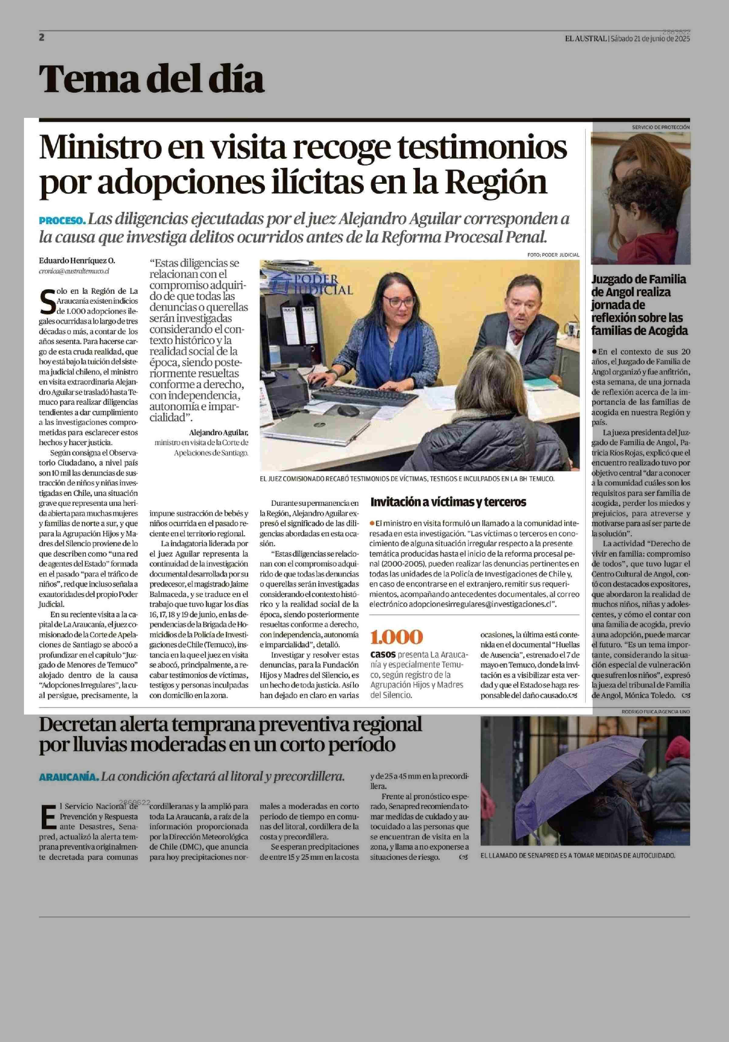 Ministro en visita recoge testimonios por adopciones ilícitas en la Región 21-06-2025 El Austral de la Araucanía |