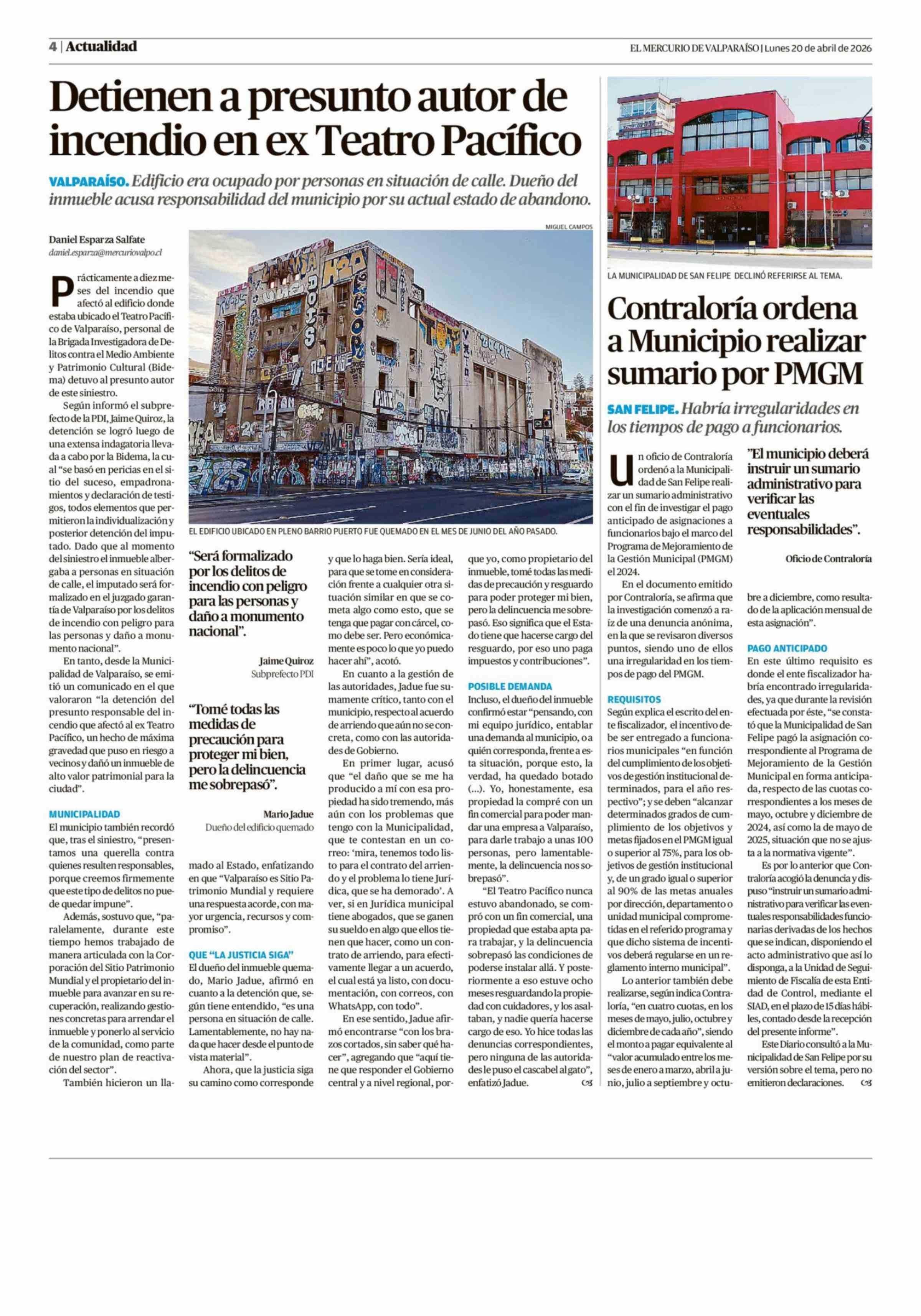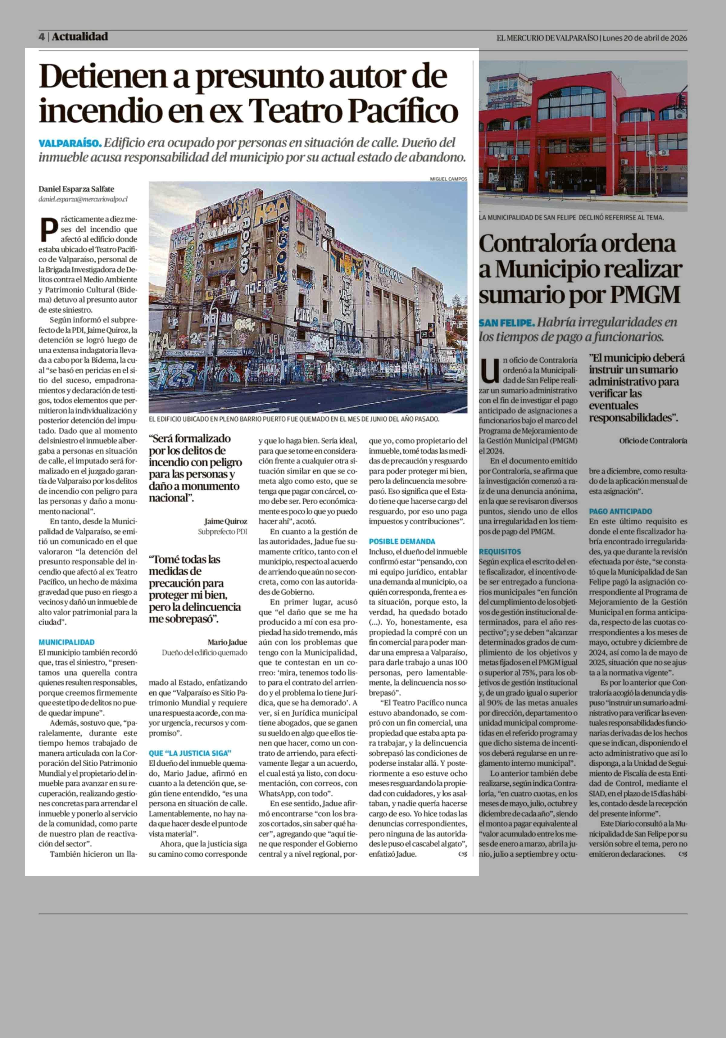 Detienen a presunto autor de incendio en ex Teatro Pacífico 20-04-2026 El Mercurio de Valparaíso |