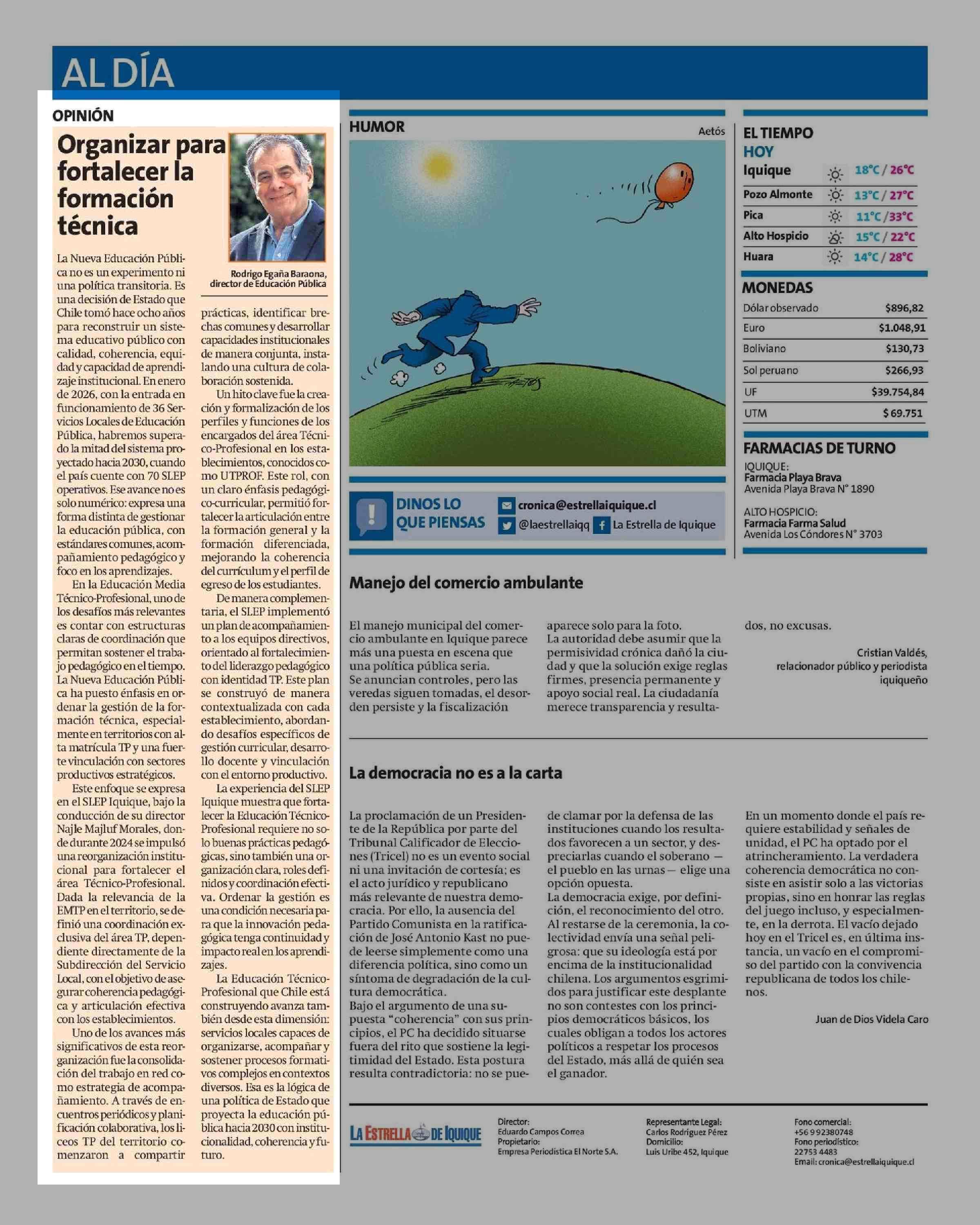 Columnas de Opinión: Organizar para fortalecer la formación técnica 07-01-2026 La Estrella de Iquique |