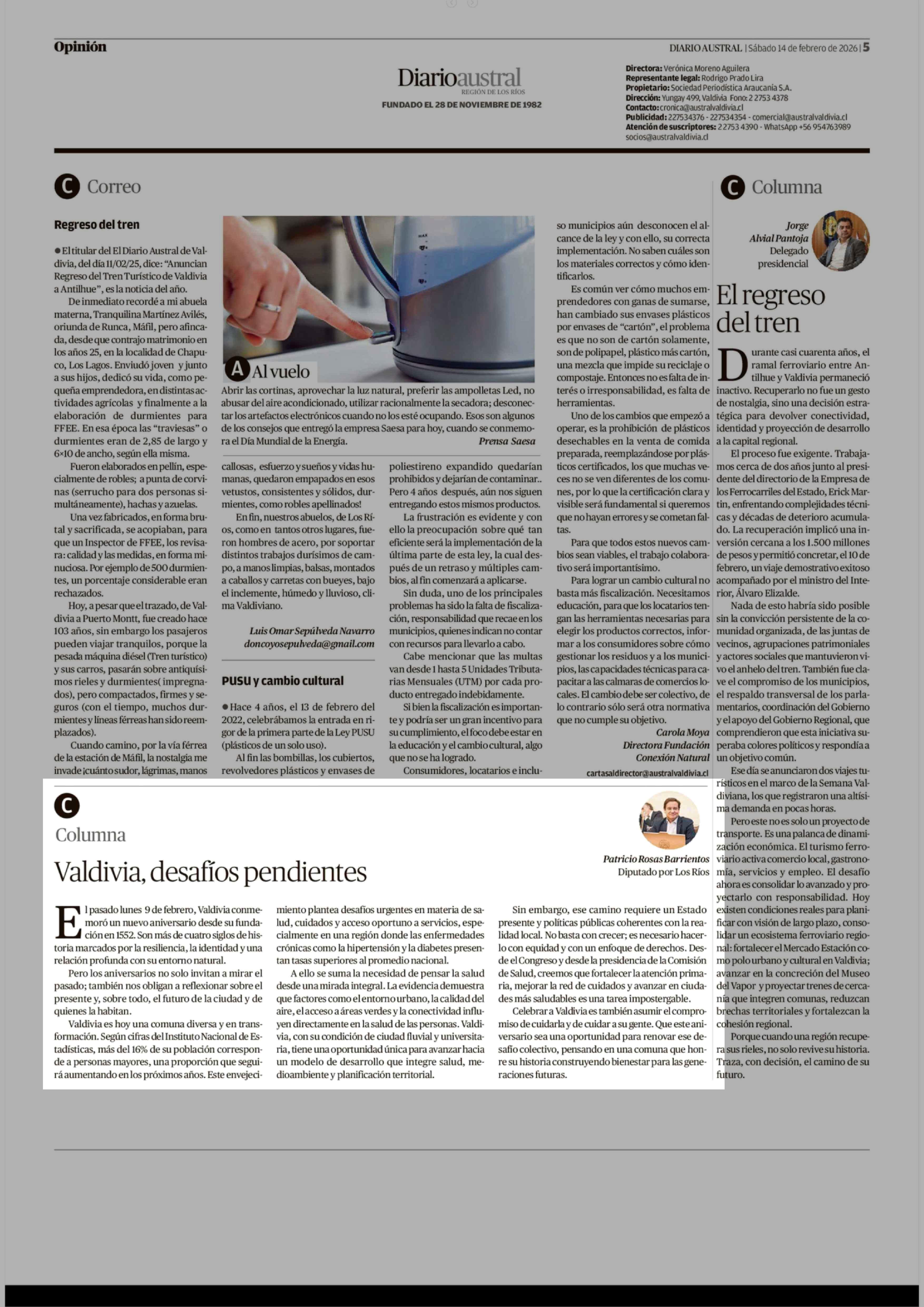 Columnas de Opinión: Valdivia, desafíos pendientes 14-02-2026 Diario Austral Región de Los Ríos |
