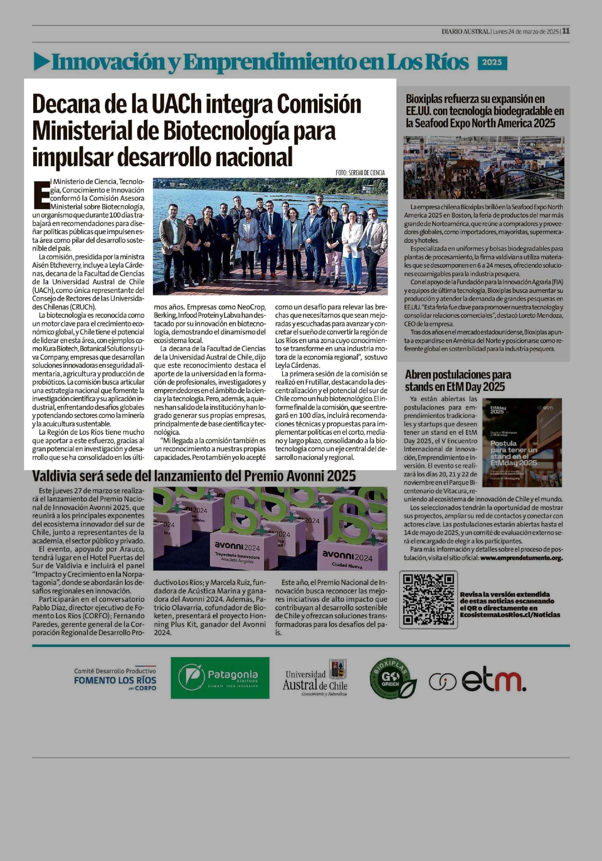 Decana de la UACh integra Comisión Ministerial de Biotecnología para impulsar desarrollo nacional 24-03-2025 Diario Austral Región de Los Ríos |