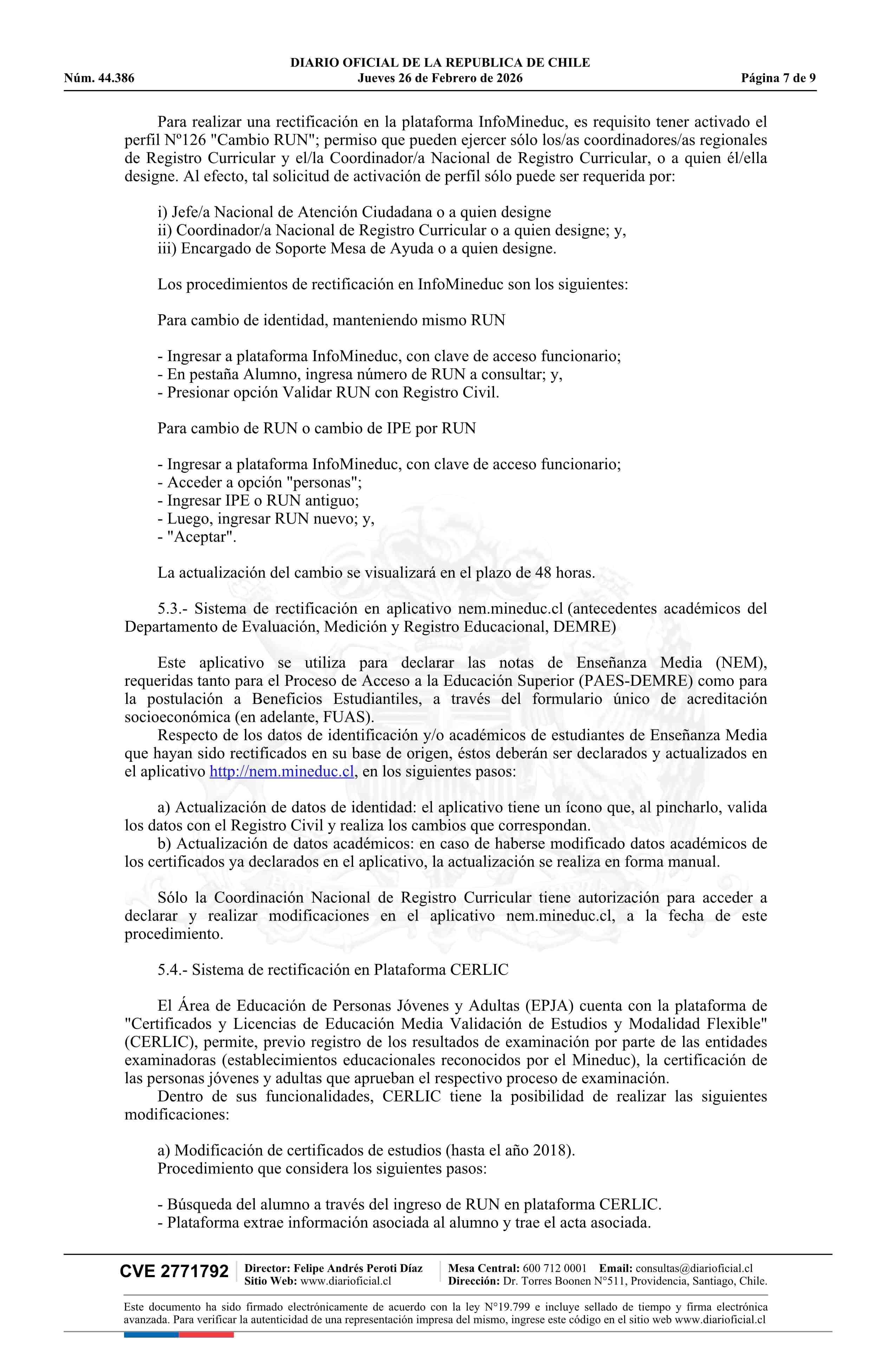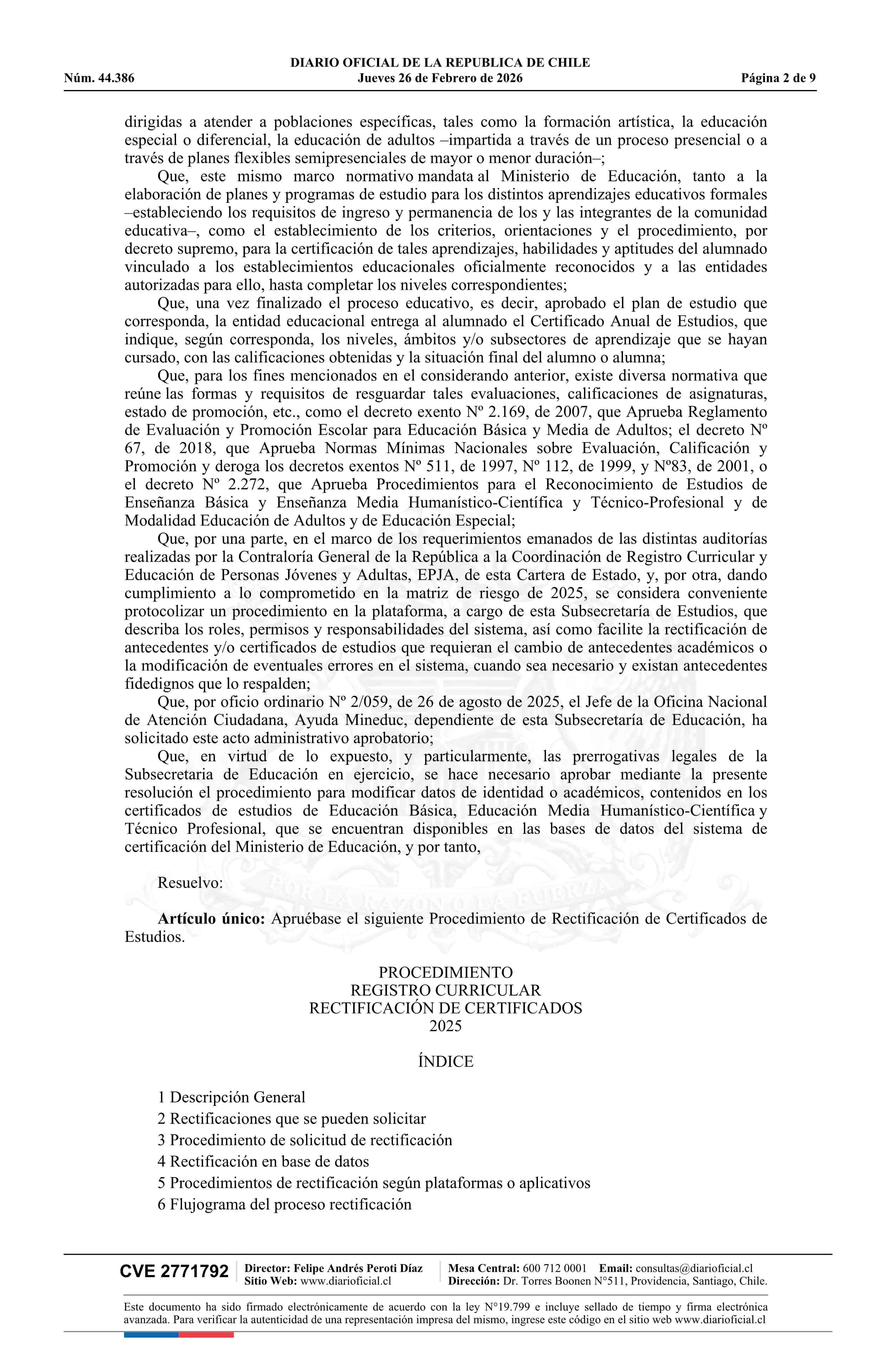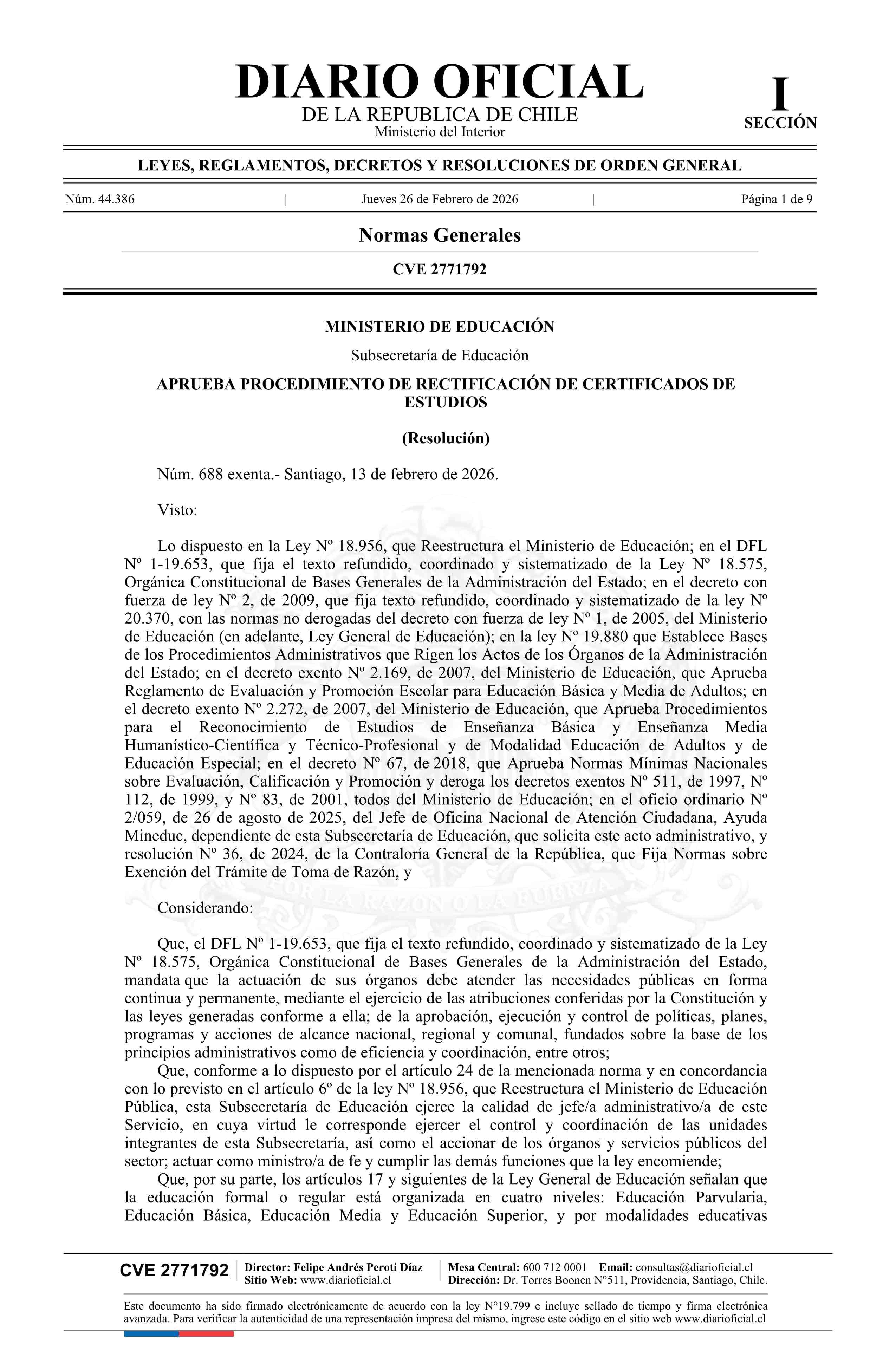 | Título: | Resolución exenta número 688, de 2026.- Aprueba procedimiento de rectificación de certificados de estudios |