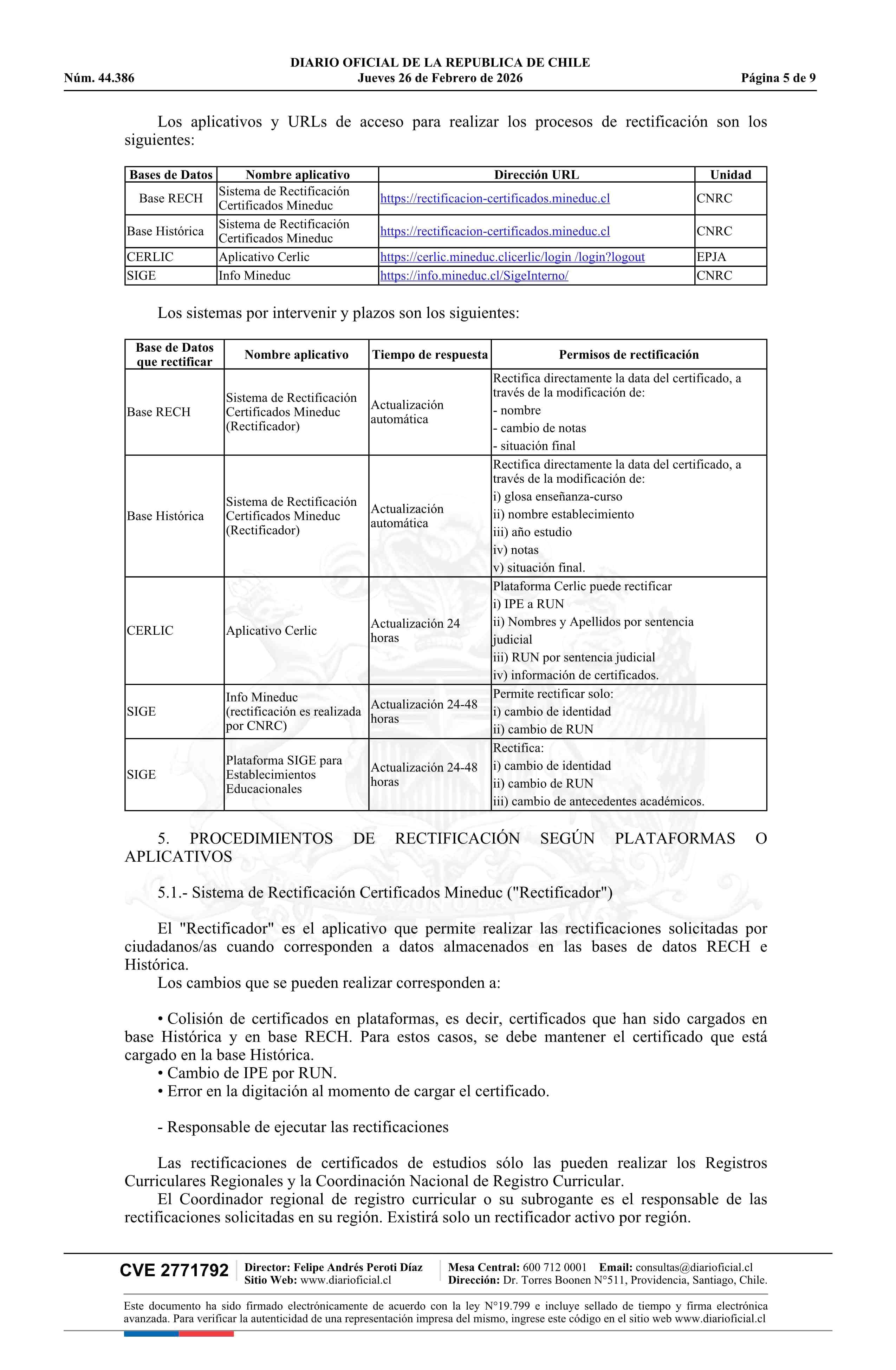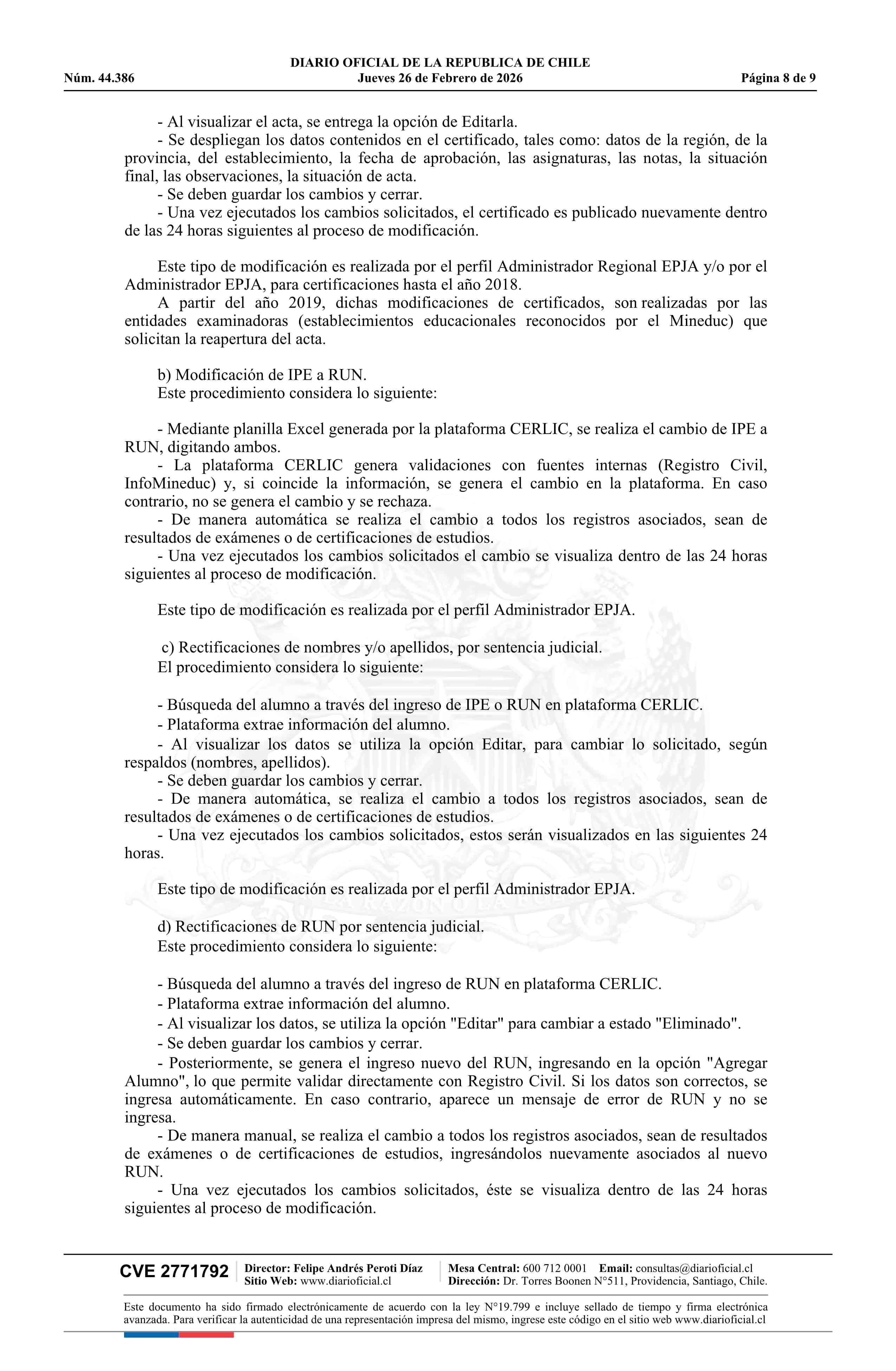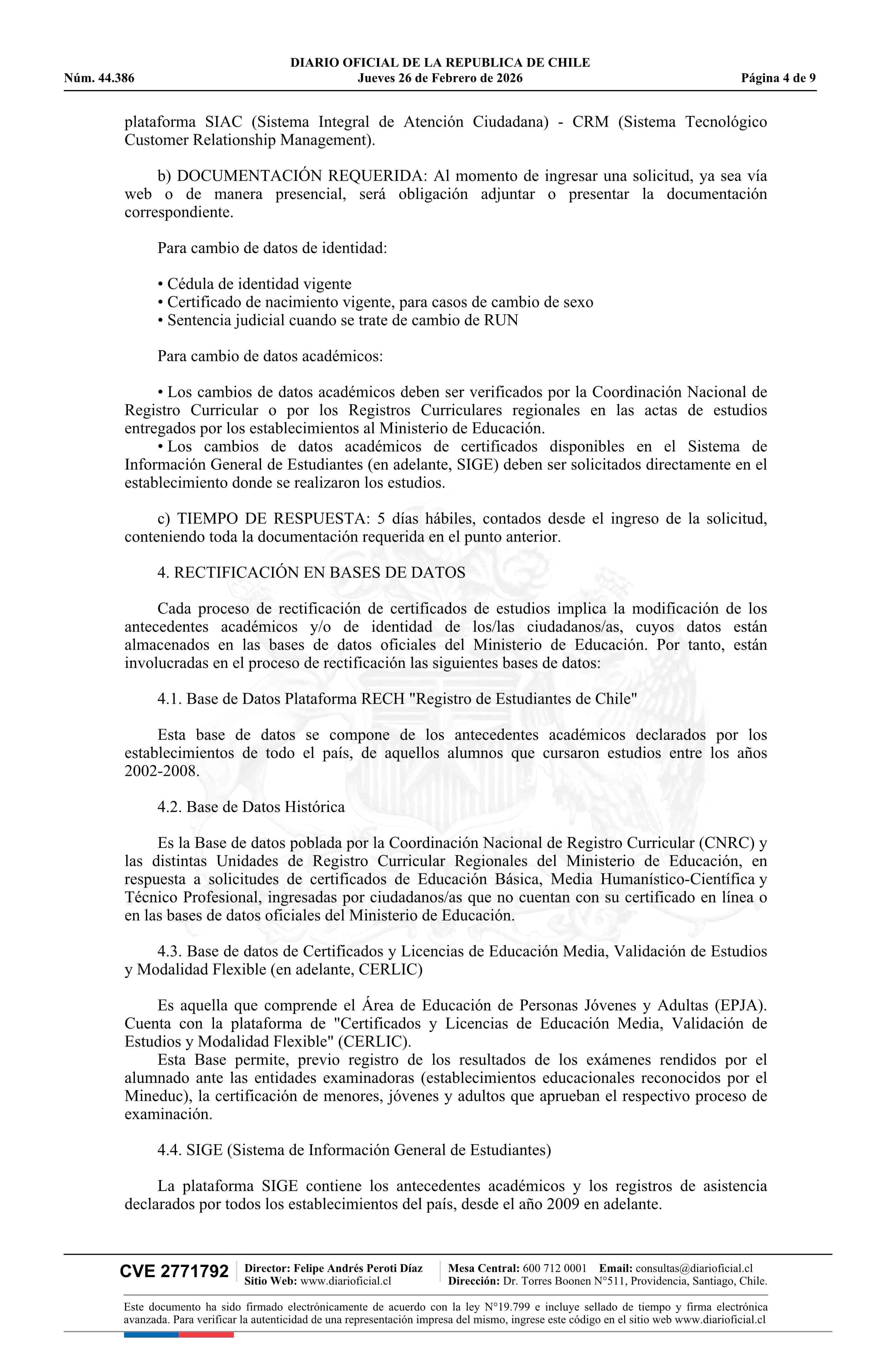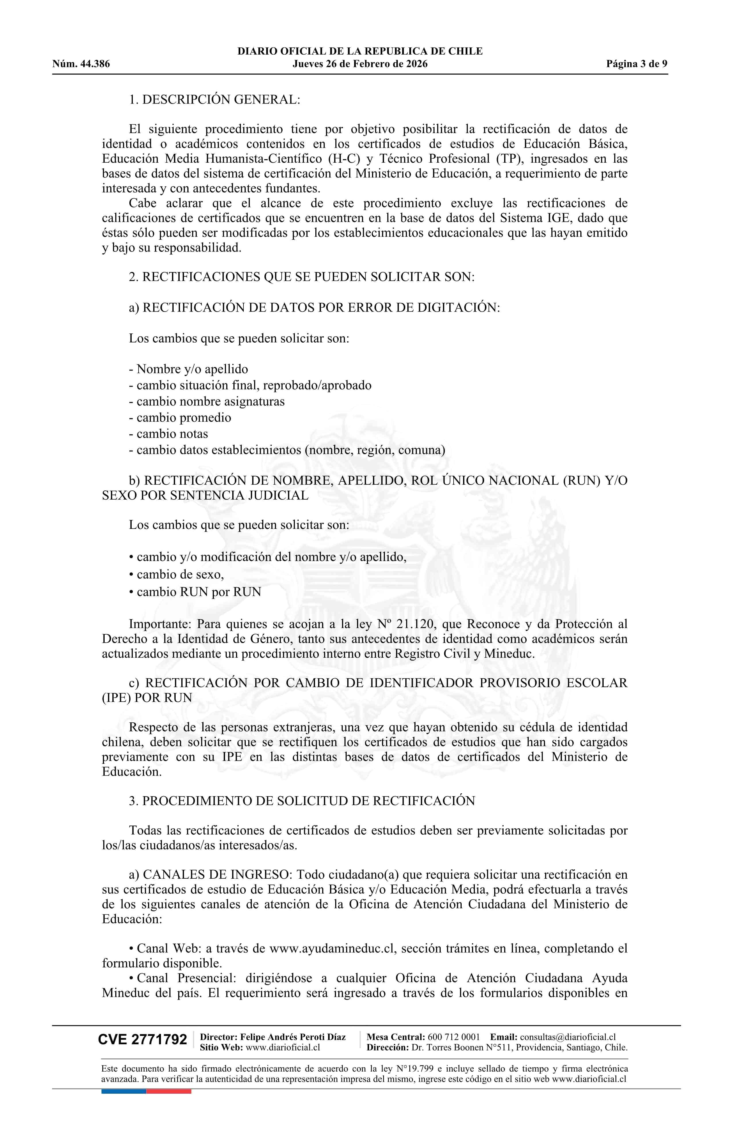 | Título: | Resolución exenta número 688, de 2026.- Aprueba procedimiento de rectificación de certificados de estudios |