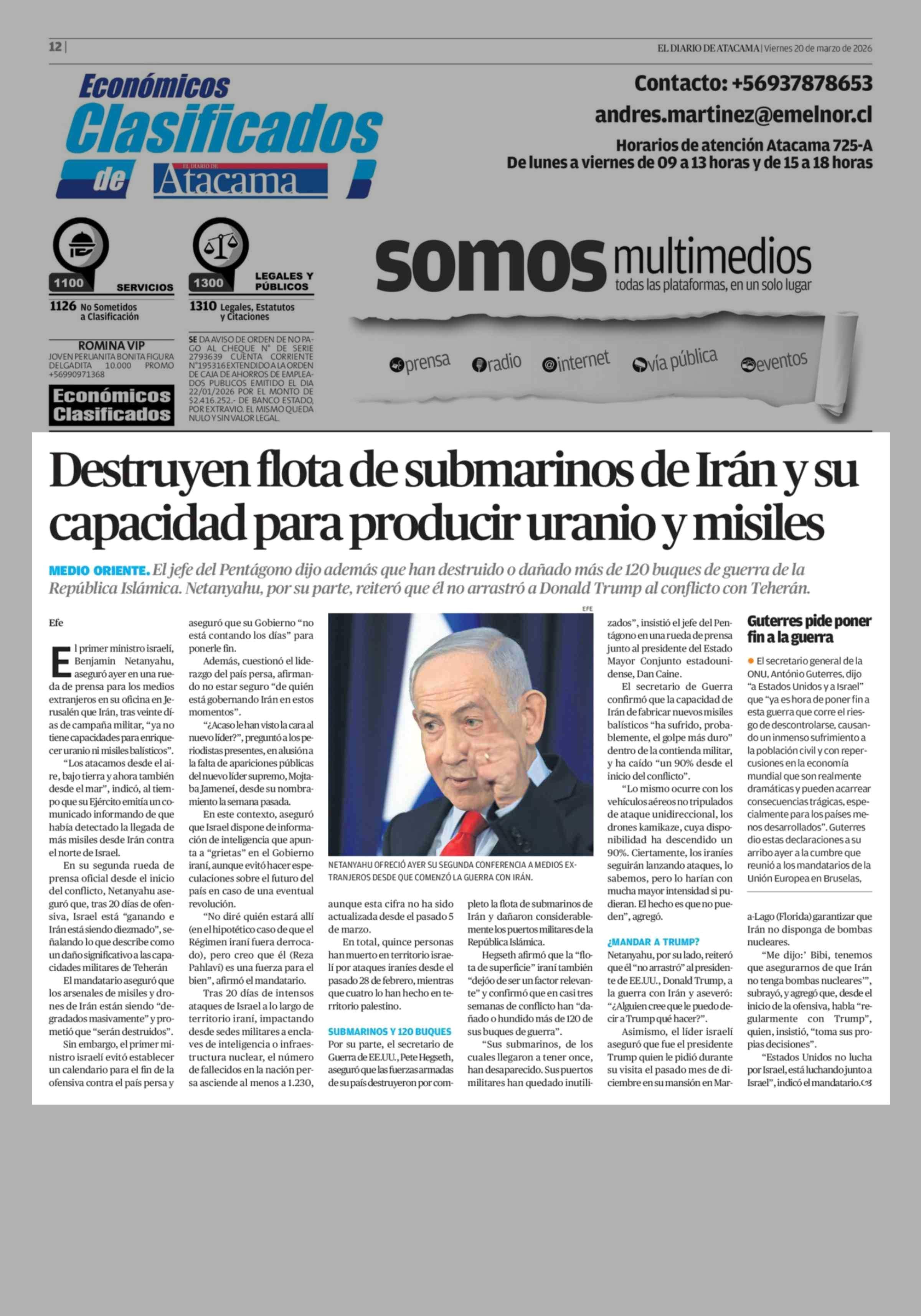 Destruyen flota de submarinos de Irán y su capacidad para producir uranio y misiles 20-03-2026 El Diario de Atacama |
