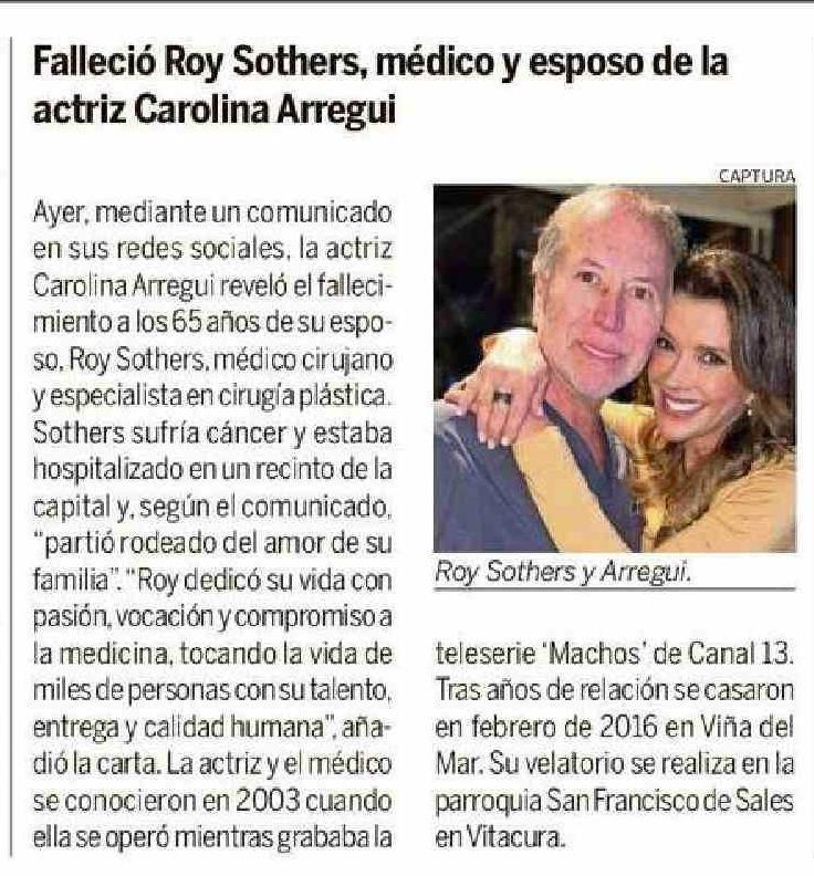 | Título: | Falleció Roy Sothers, médico y esposo de la actriz Carolina Arregui |