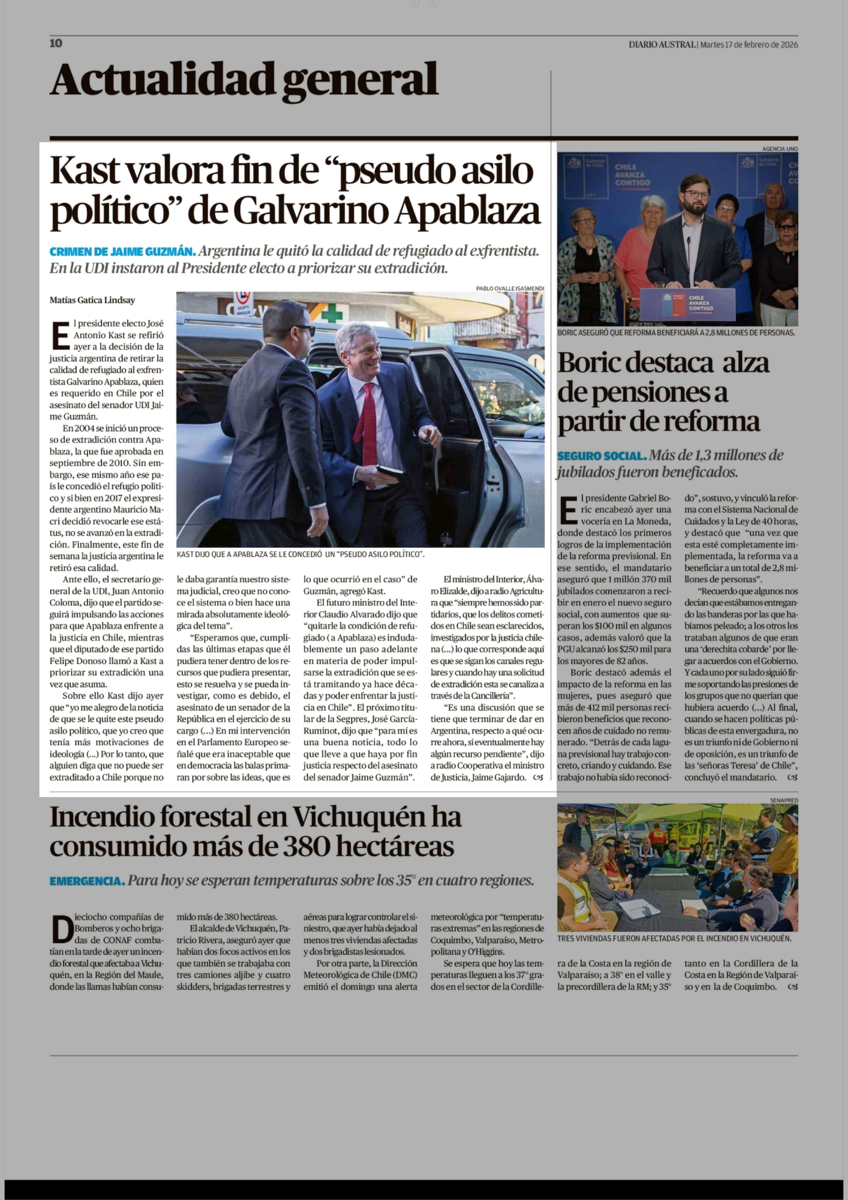 Kast valora fin de "pseudo asilo político" de Galvarino Apablaza 17-02-2026 Diario Austral Región de Los Ríos |