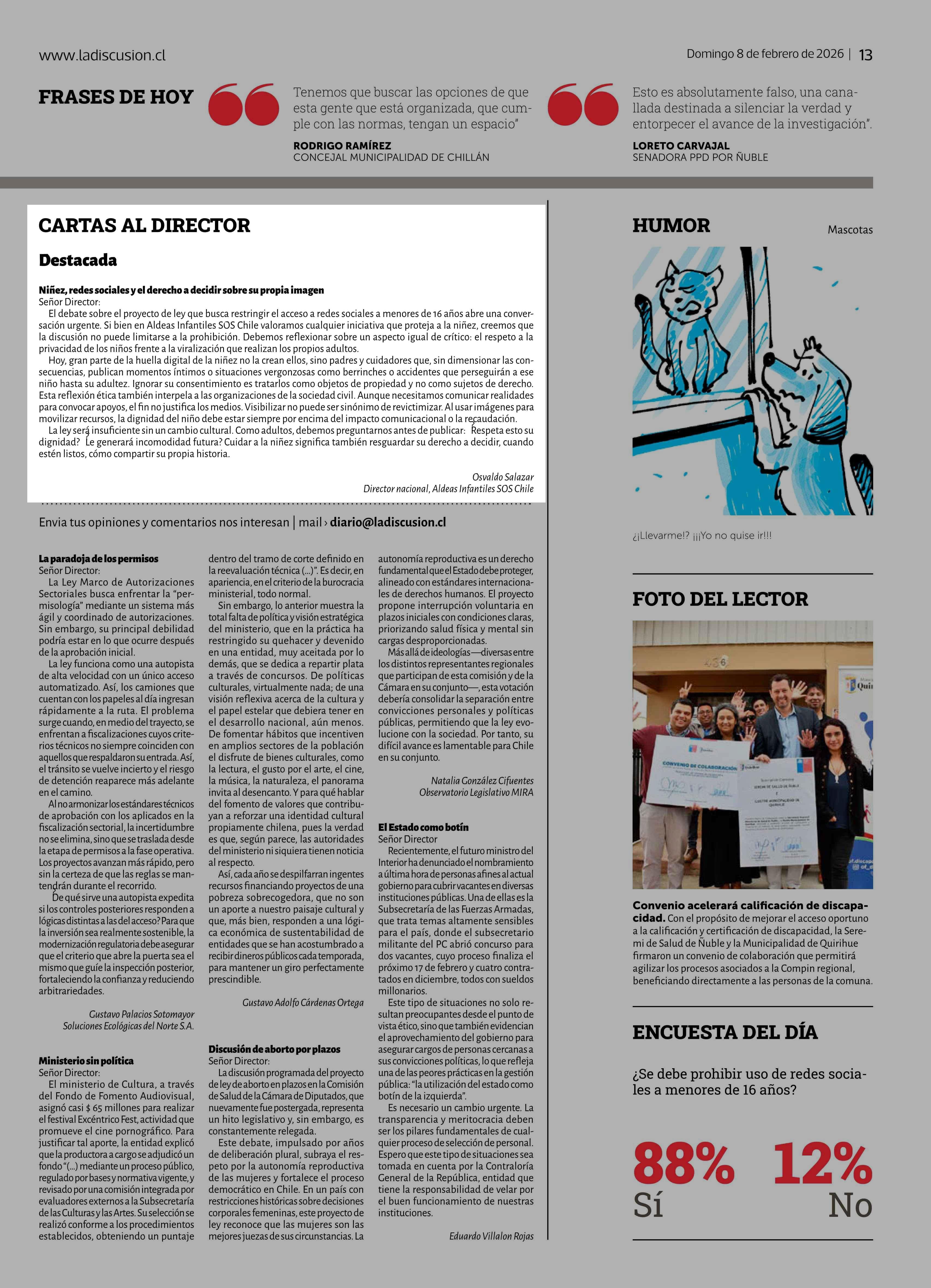 | Título: | Cartas: Niñez, redes sociales y el derecho a decidir sobre su propia imagen Señor Director: El debate sobre el proyecto de ley que busca restringir el acceso a redes sociales a menores de 16 años abre una conversación urgente. Si bien en Aldeas Infantiles SOS Chile valoramos cualquier iniciativa que |