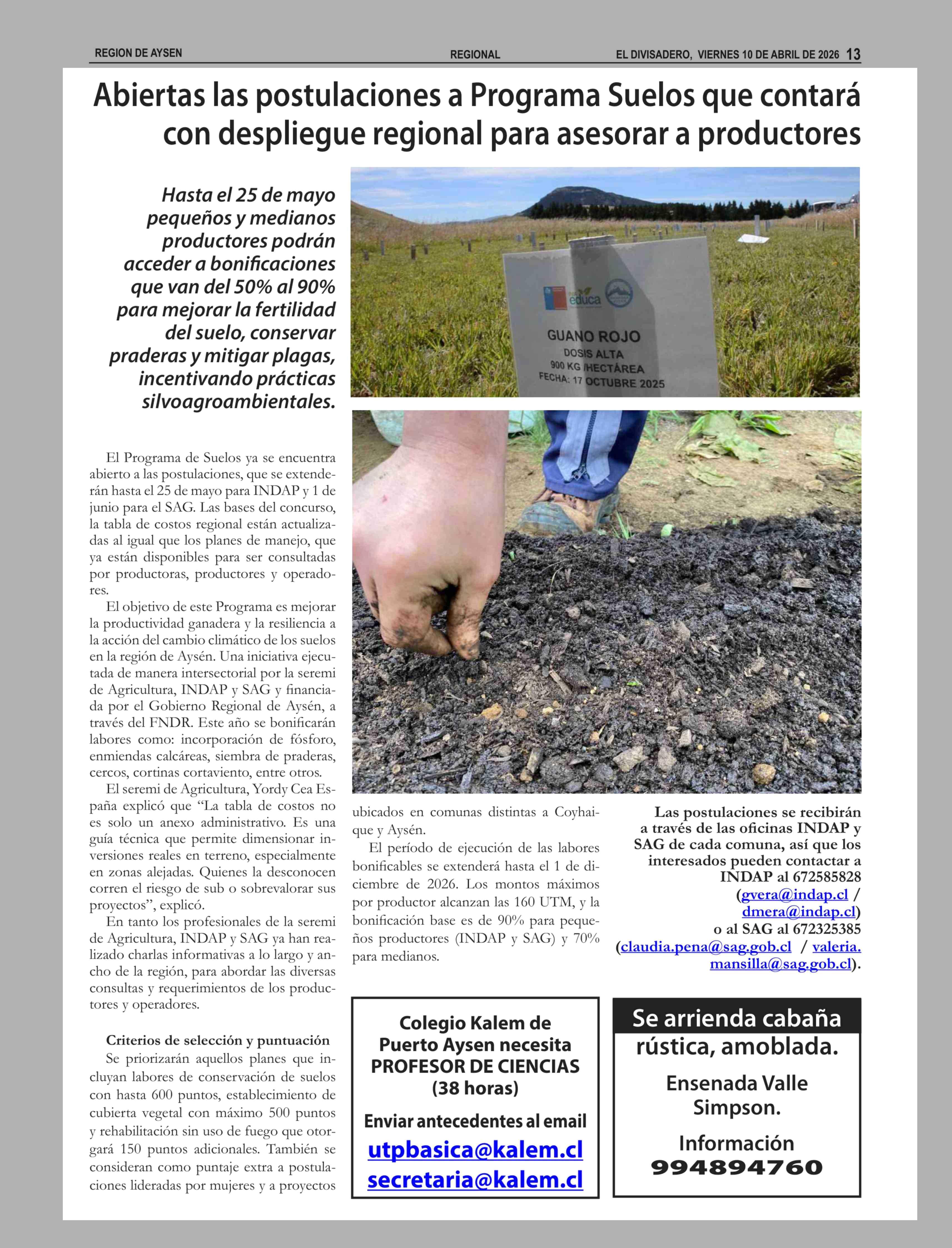 Abiertas las postulaciones a Programa Suelos que contará con despliegue regional para asesorar a productores 10-04-2026 El Divisadero |