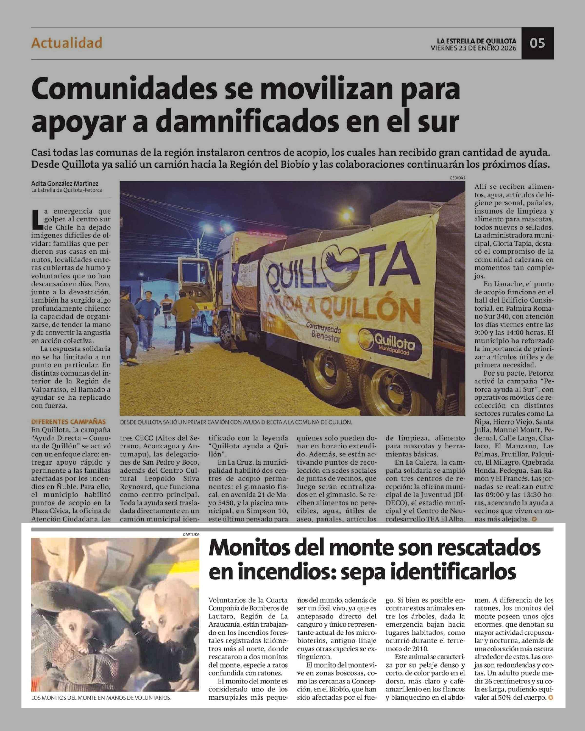 Monitos del monte son rescatados en incendios: sepa identificarlos 23-01-2026 La Estrella de Quillota |