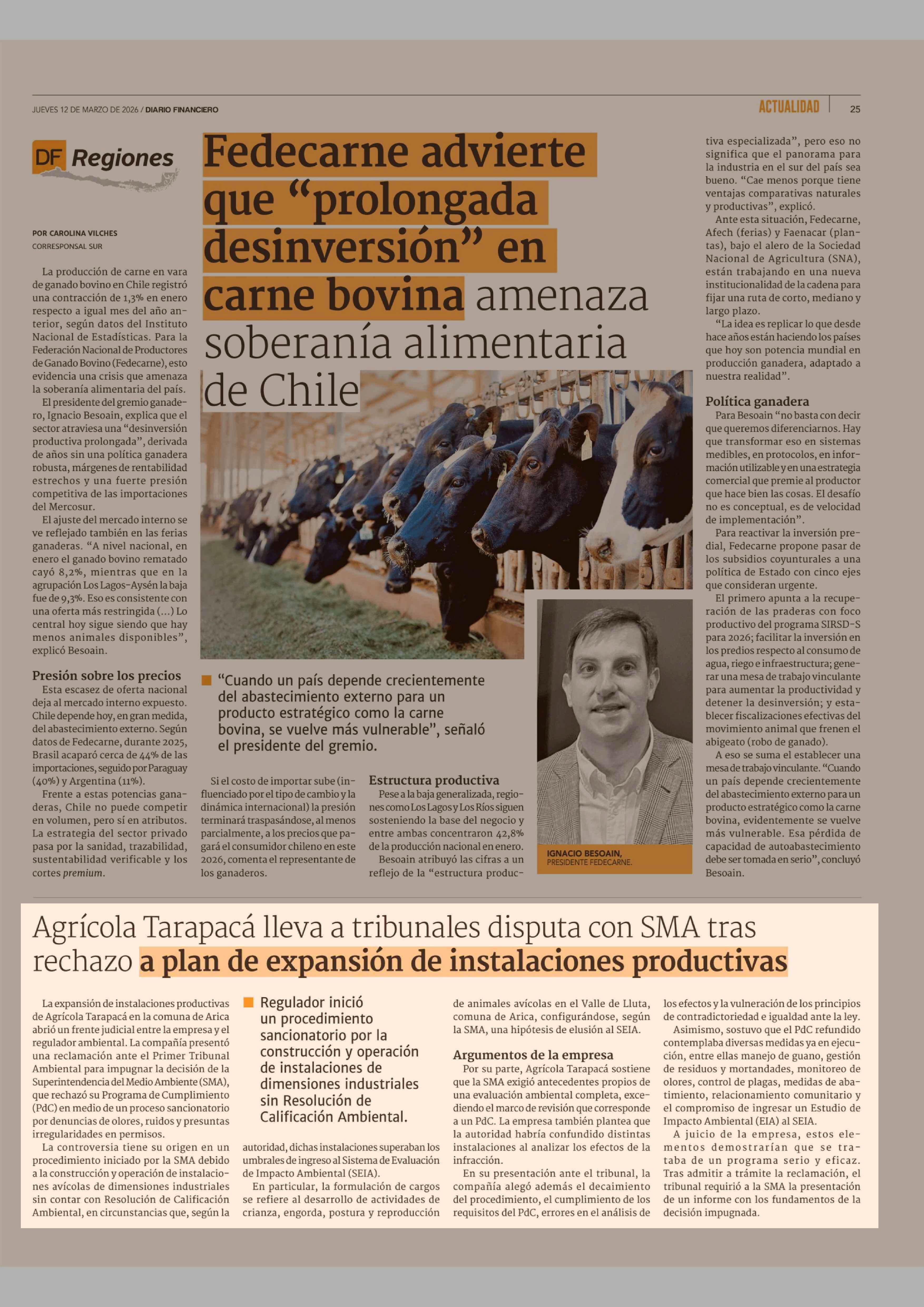 Agrícola Tarapacá lleva a tribunales disputa con SMA tras rechazo a plan de expansión de instalaciones productivas 12-03-2026 Diario Financiero |