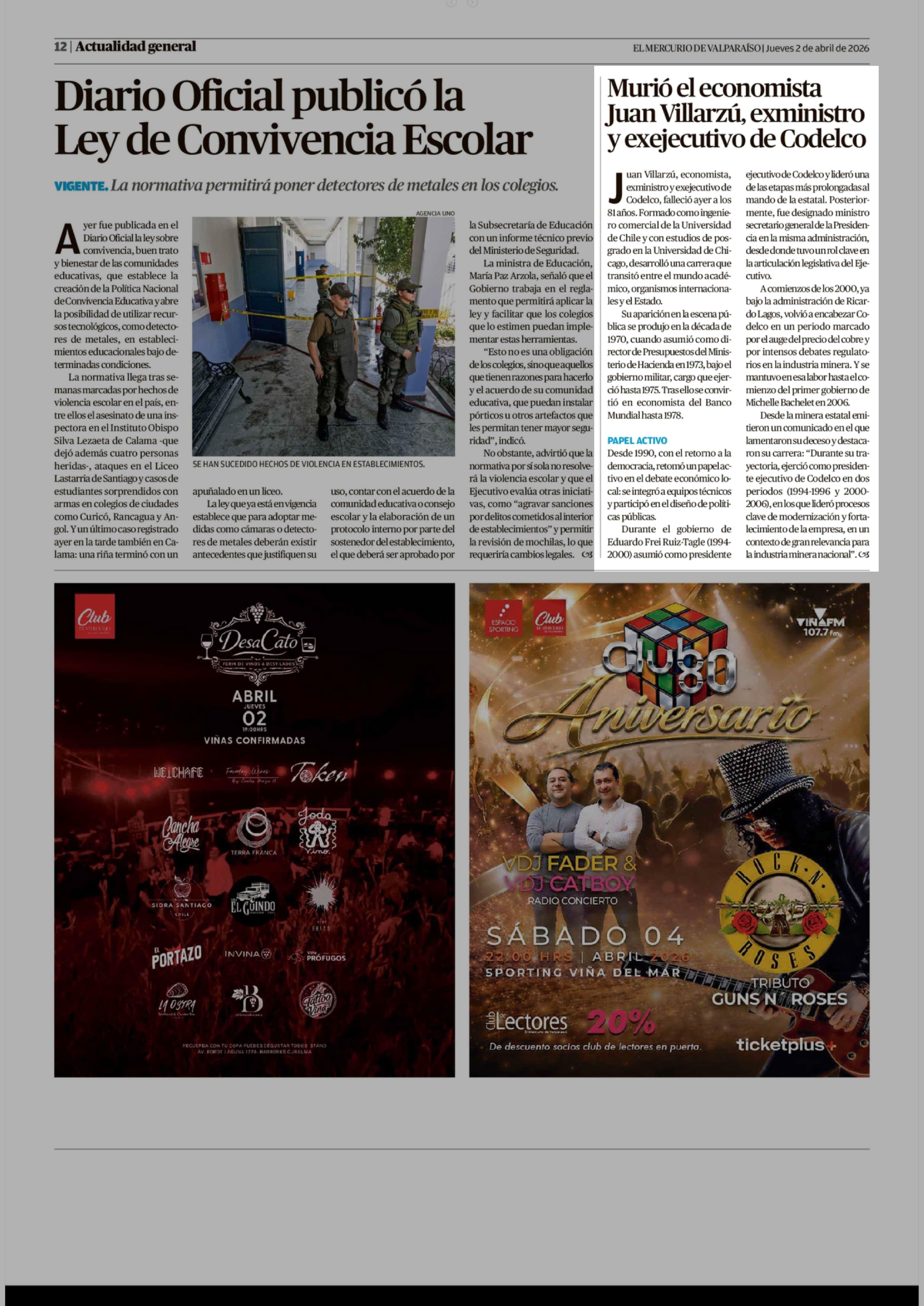 Murió el economista Juan Villarzú, exministro y exejecutivo de Codelco 02-04-2026 El Mercurio de Valparaíso |