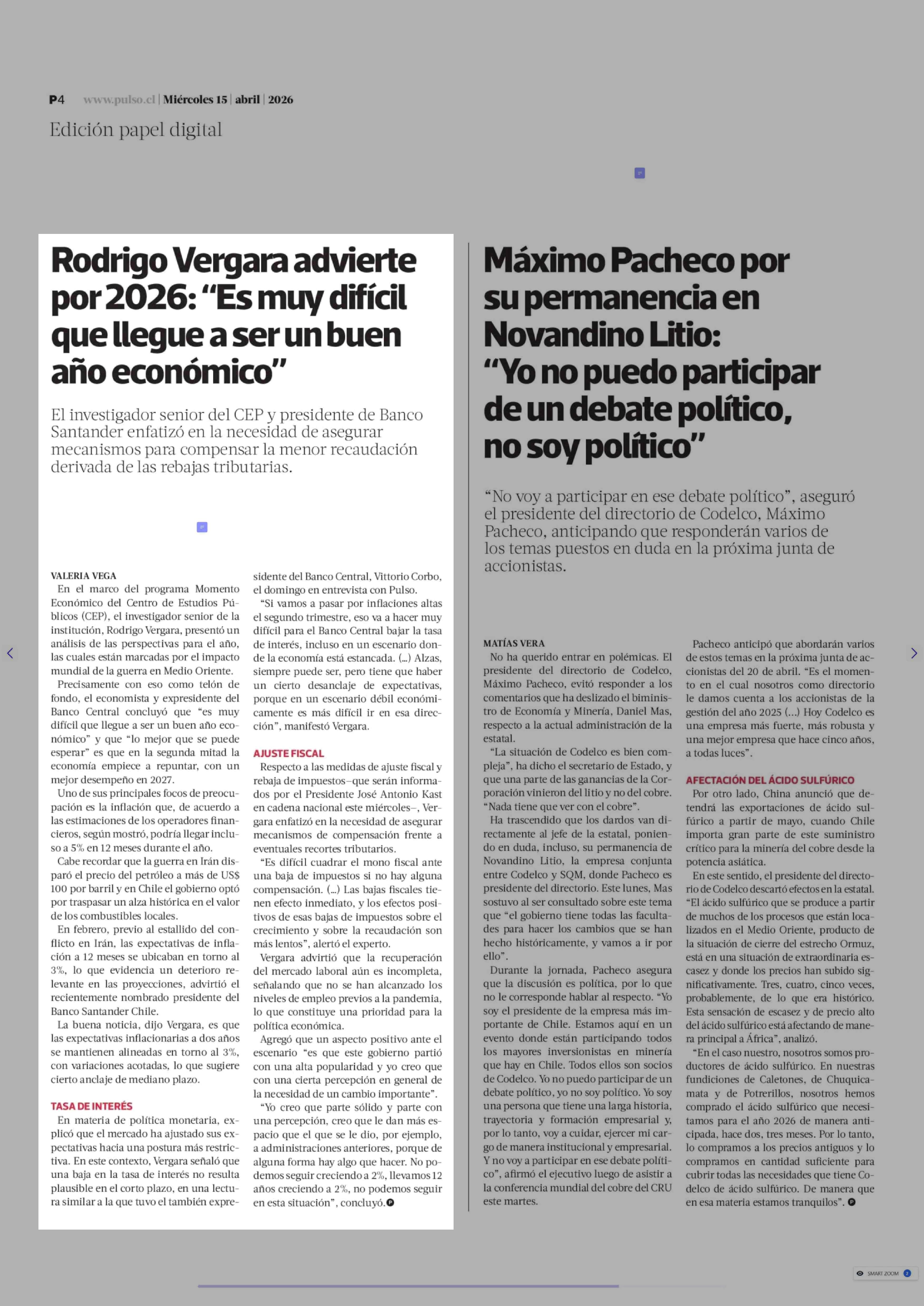 Rodrigo Vergara advierte por 2026: "Es muy difícil que llegue a ser un buen año económico" 15-04-2026 La Tercera |