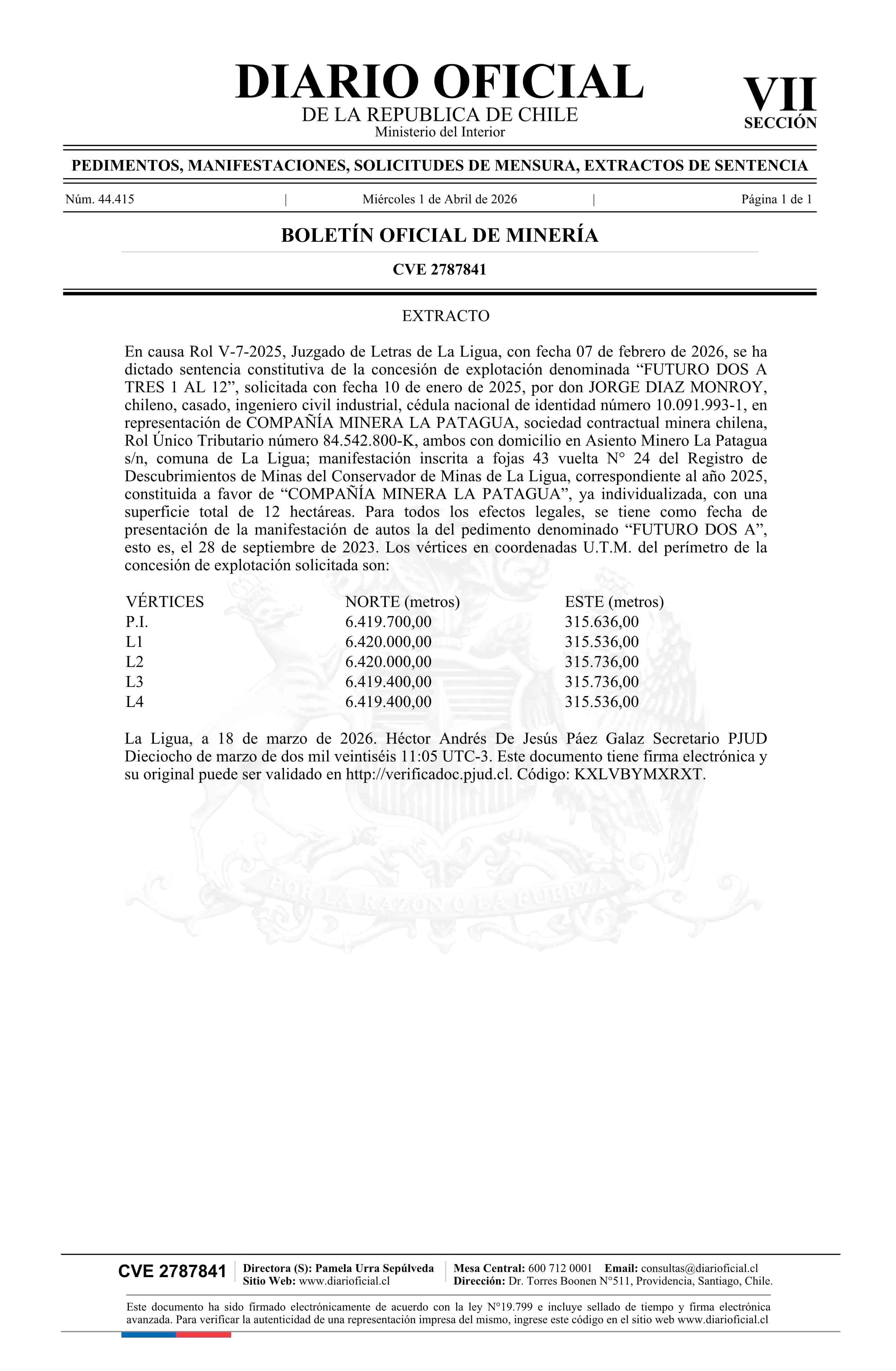 FUTURO DOS A TRES 1 AL 12 / Compañía Minera La Patagua 01-04-2026 DIARIO OFICIAL CHILE - BOLETÍN OFICIAL DE MINERÍA |