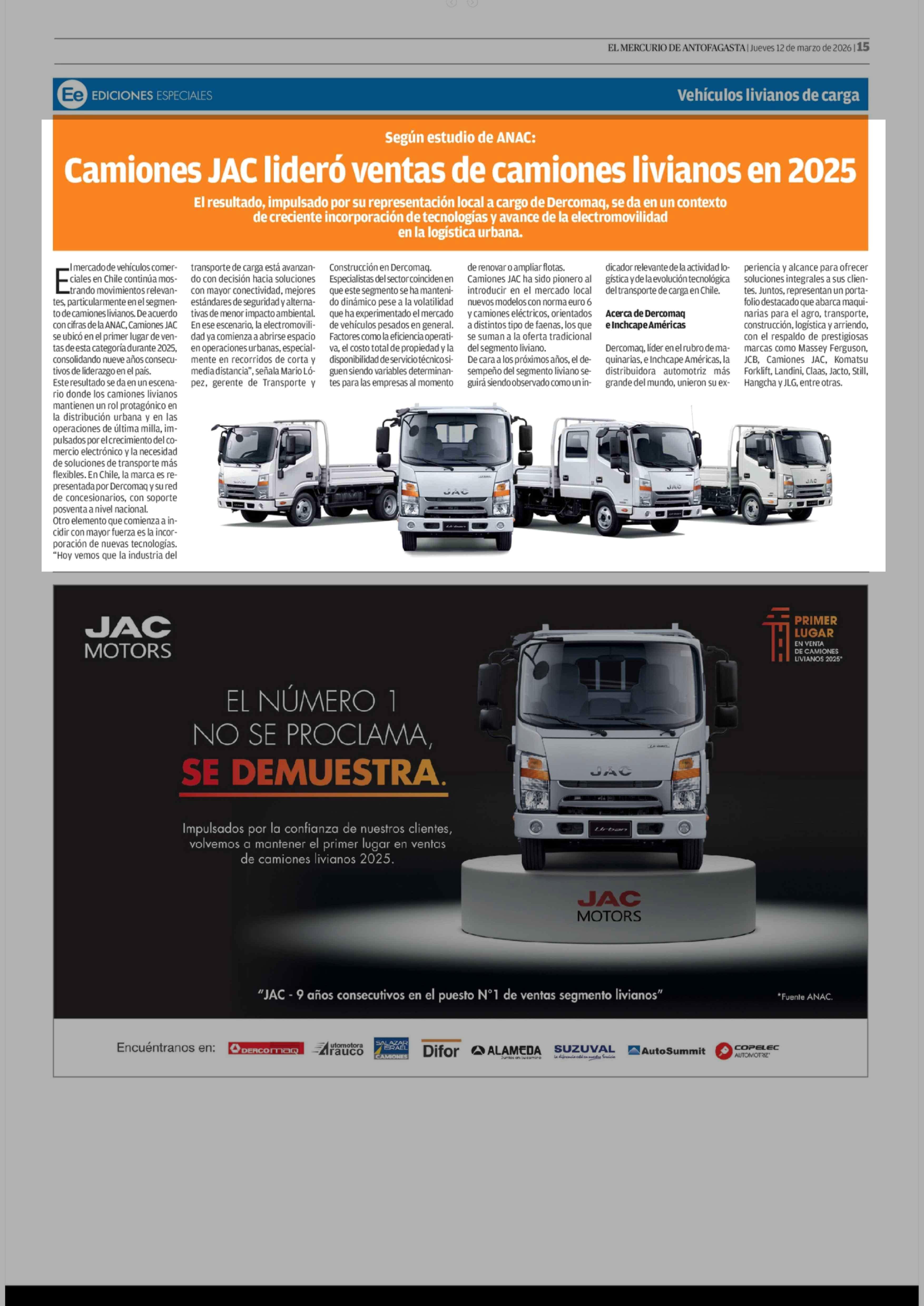 Camiones JAC lideró ventas de camiones livianos en 2025 12-03-2026 El Mercurio de Antofagasta |