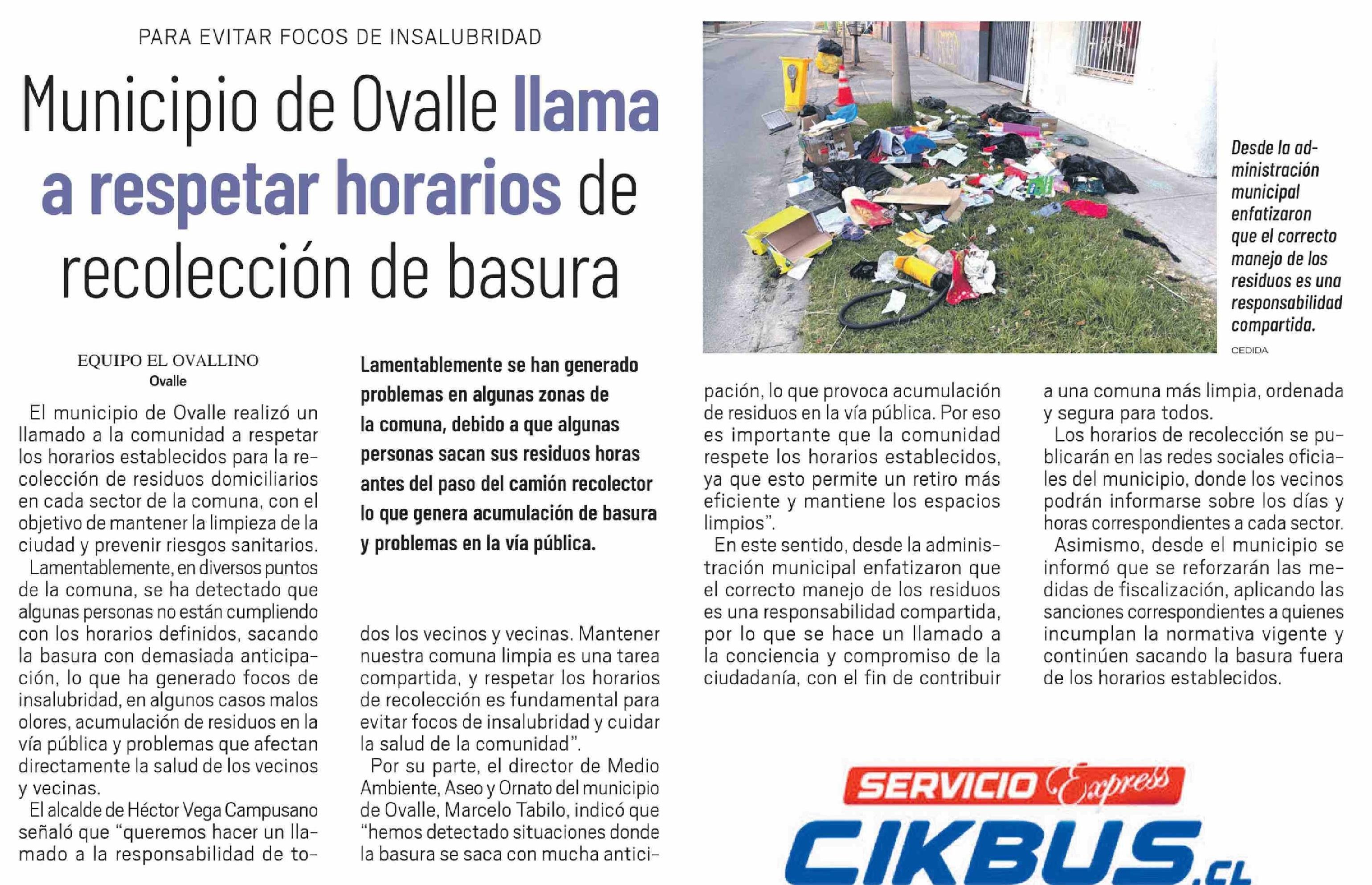 Municipio de Ovalle llama a respetar horarios de recolección de basura 25-03-2026 El Ovallino |