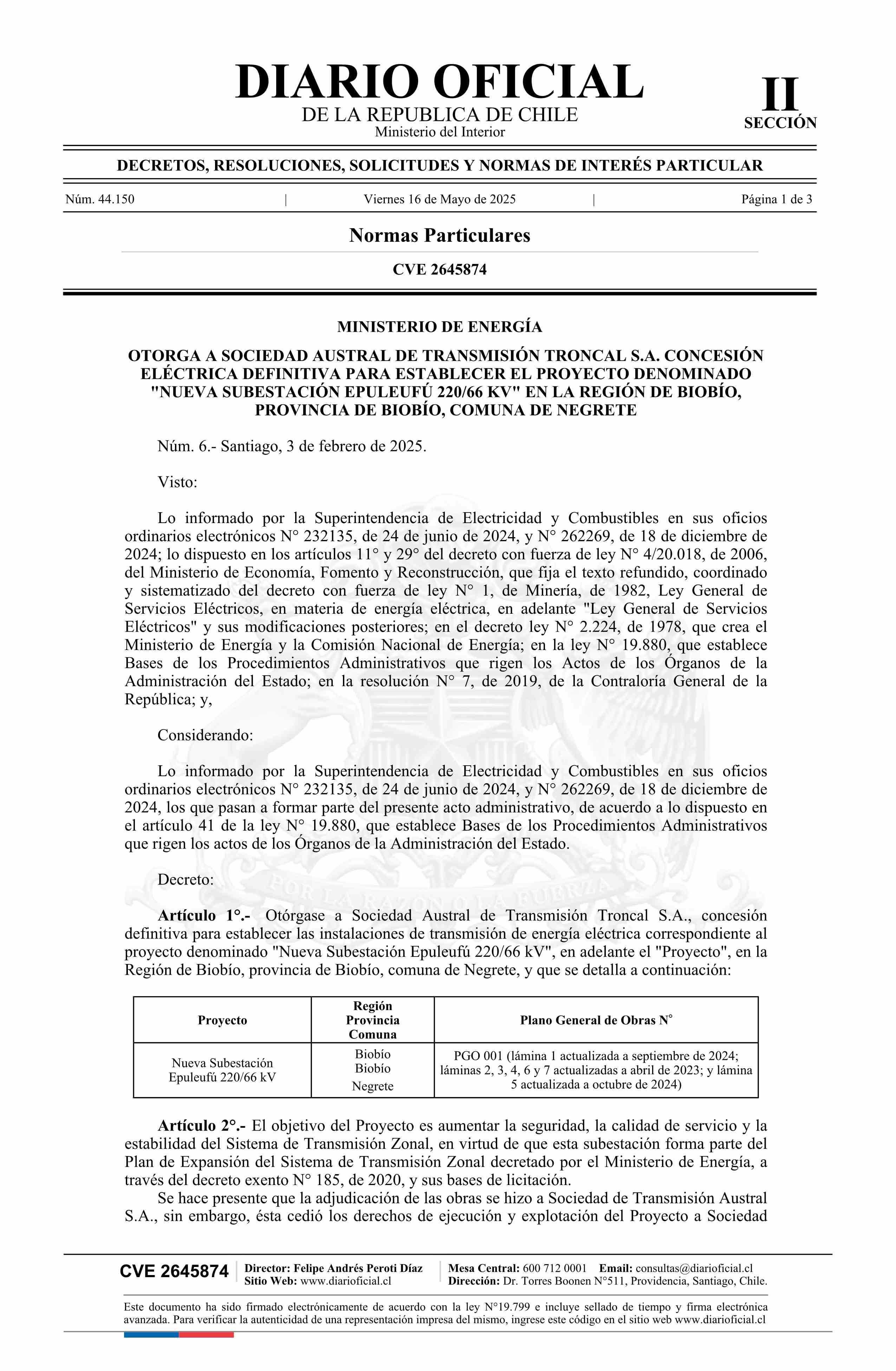 | Título: | Decreto número 6, de 2025.- Otorga a Sociedad Austral de Transmisión Troncal S.A. concesión eléctrica definitiva para establecer el proyecto denominado Nueva Subestación Epuleufú 220/66 kV, en la Región del Biobío, provincia de Biobío, comuna de Negrete |