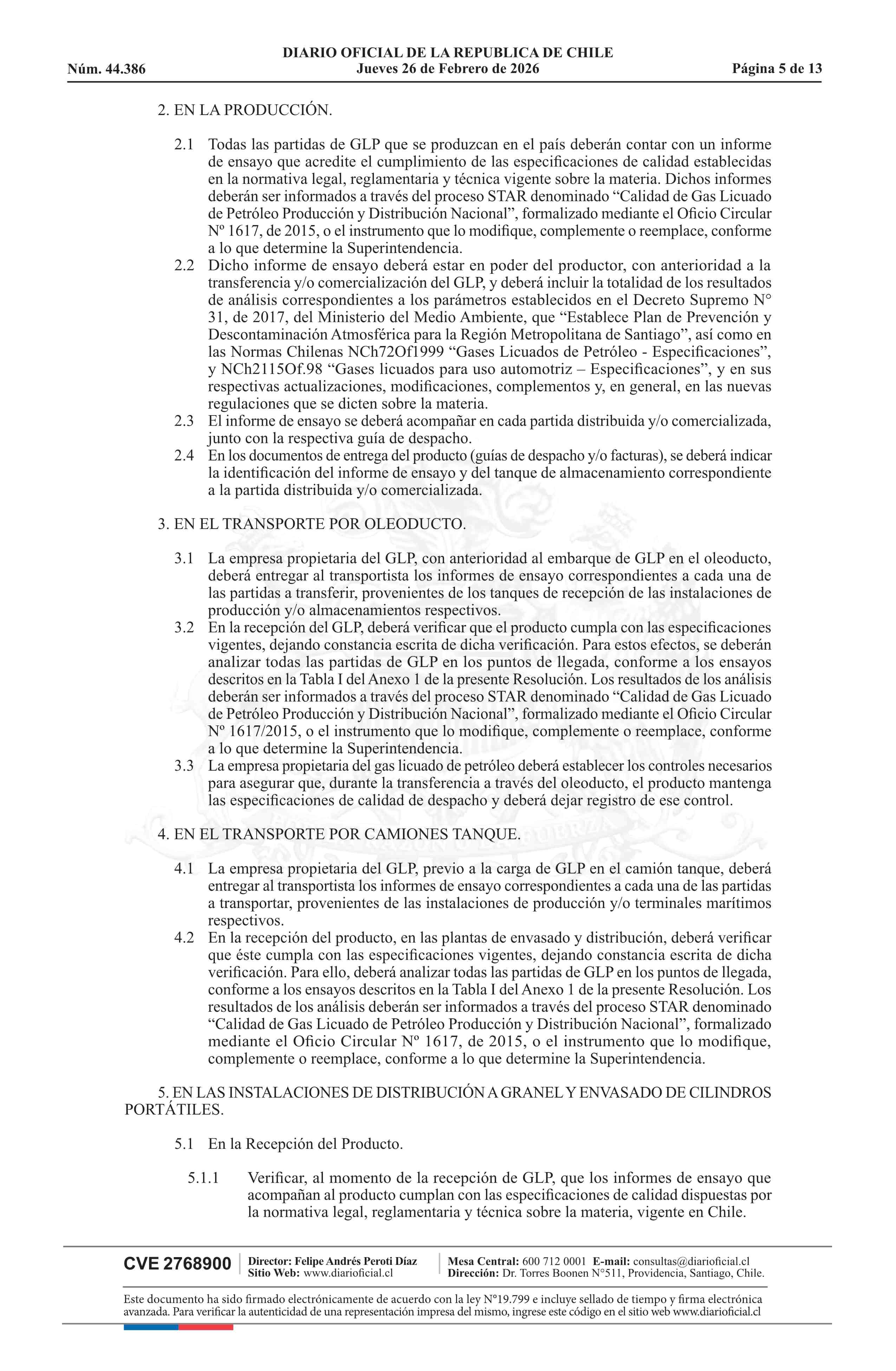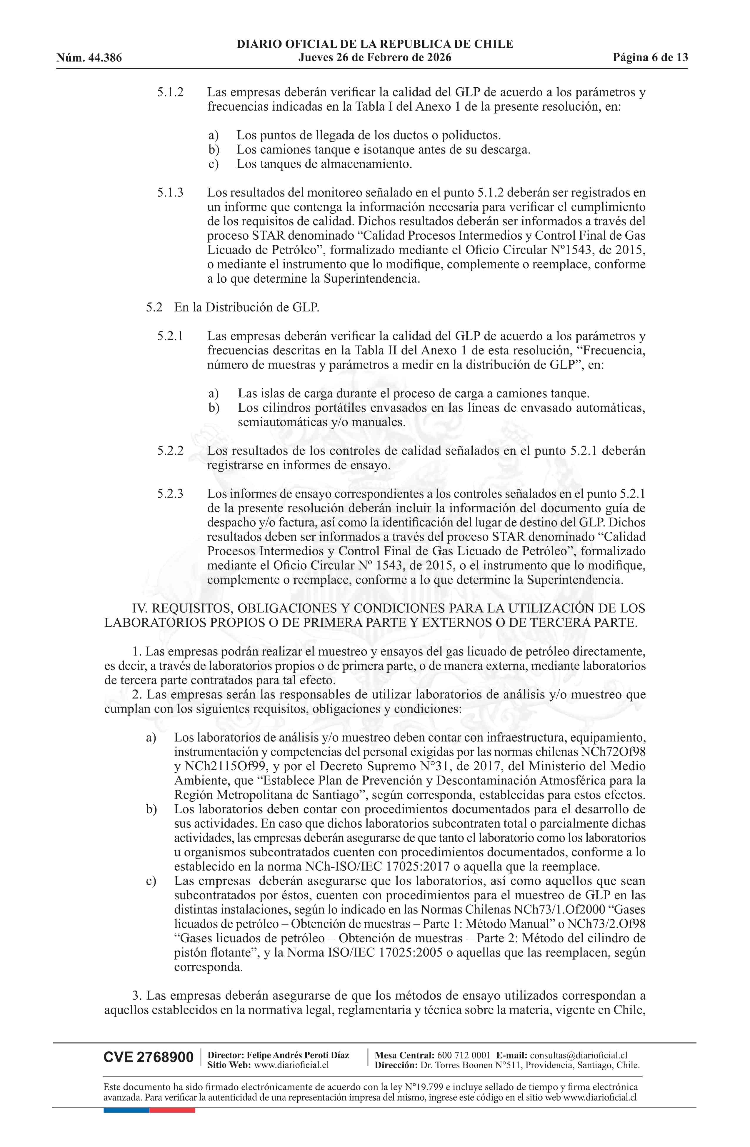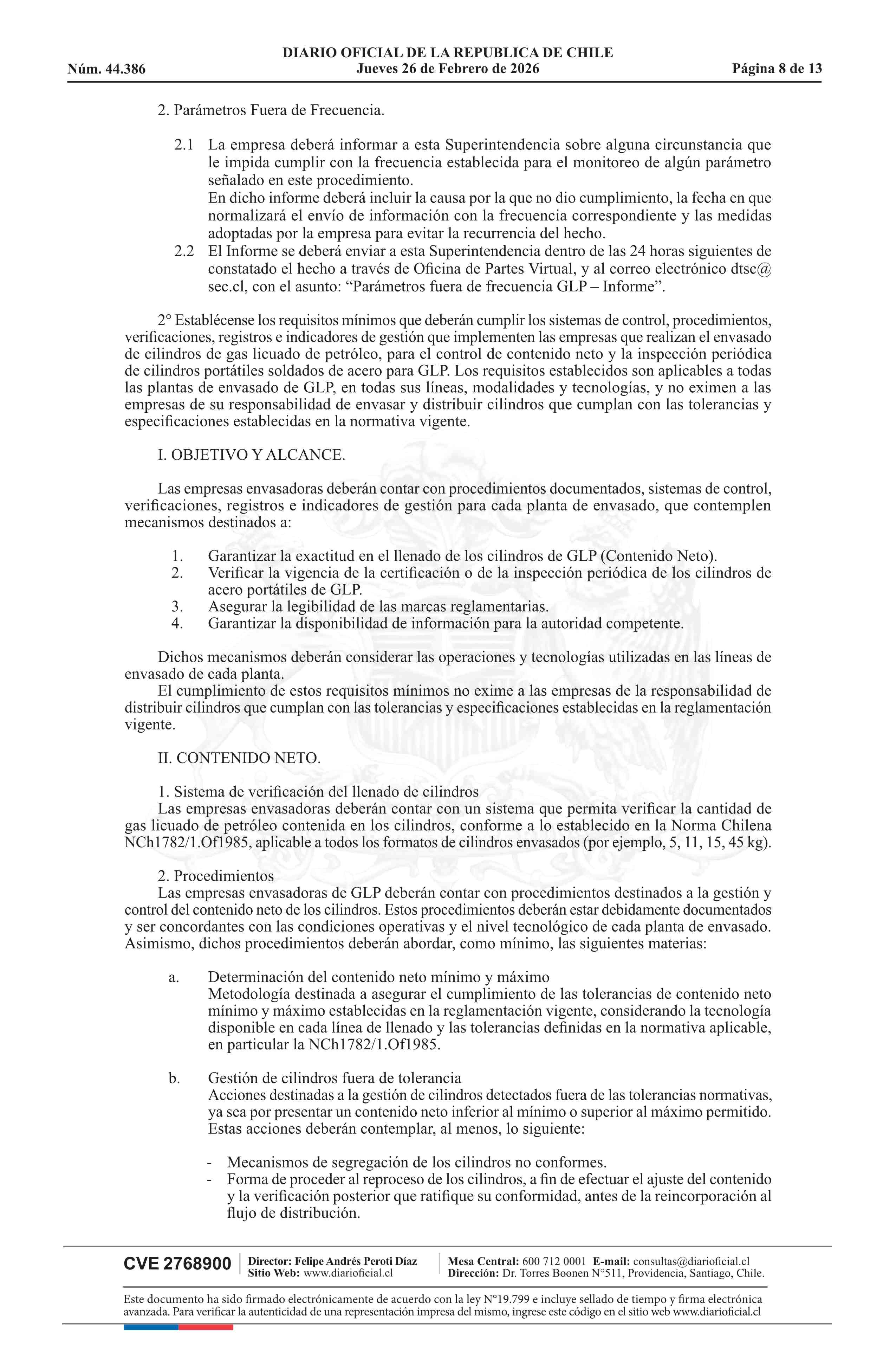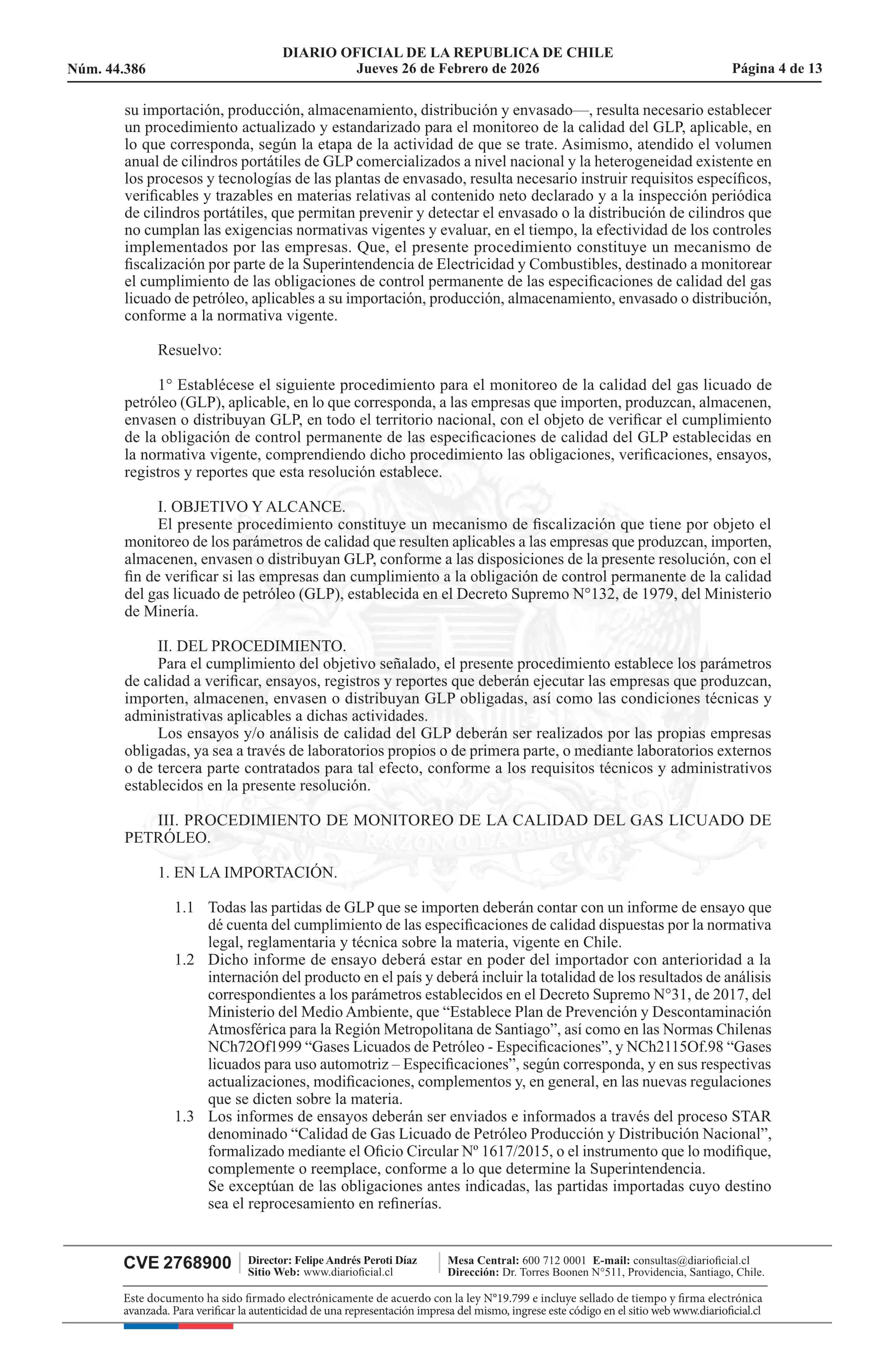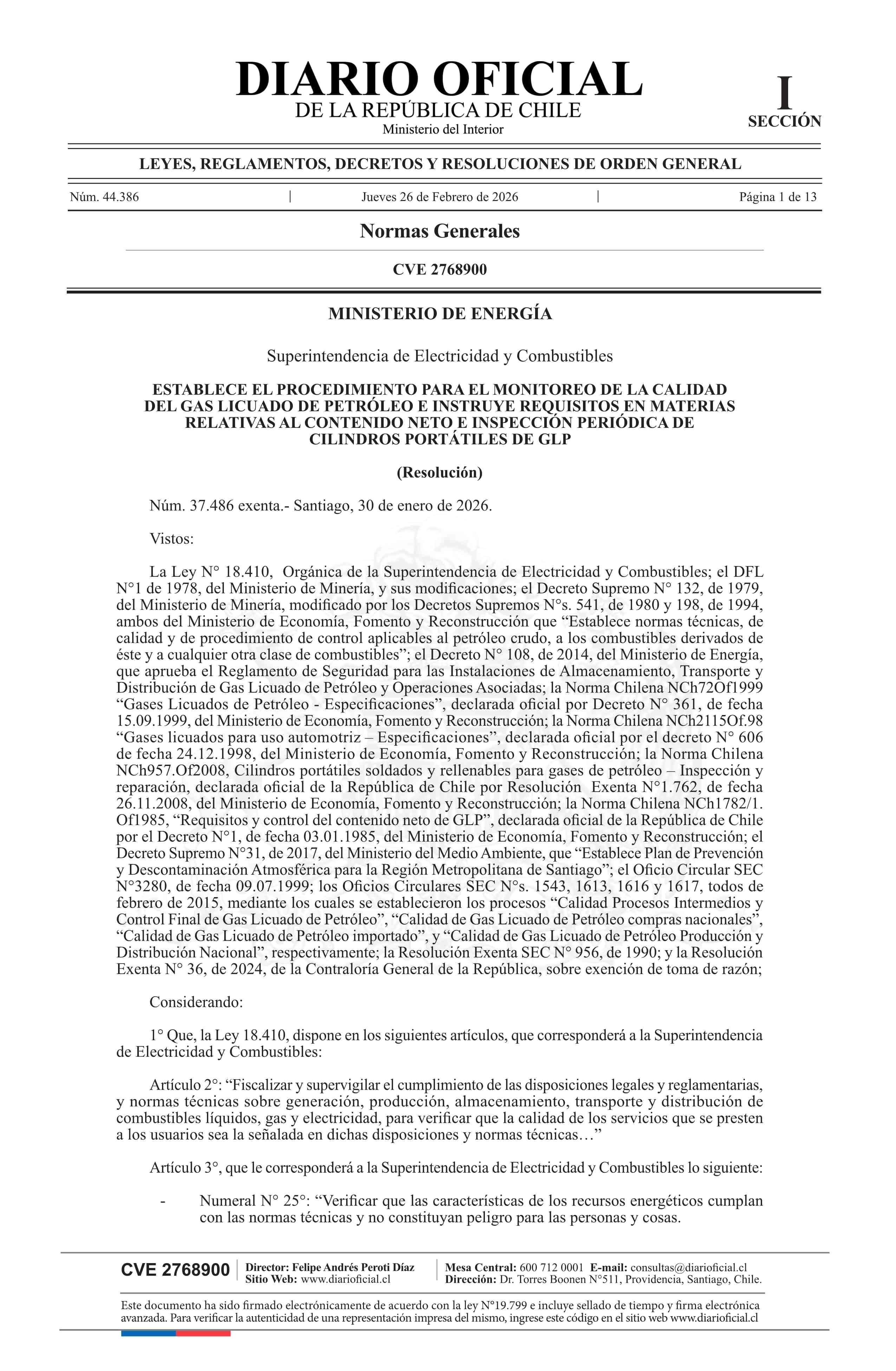 | Título: | Resolución exenta número 37.486, de 2026.- Establece procedimiento para el monitoreo de la calidad del gas licuado de petróleo e instruye requisitos en materias relativas al contenido neto e inspección periódica de cilindros portátiles de GLP |