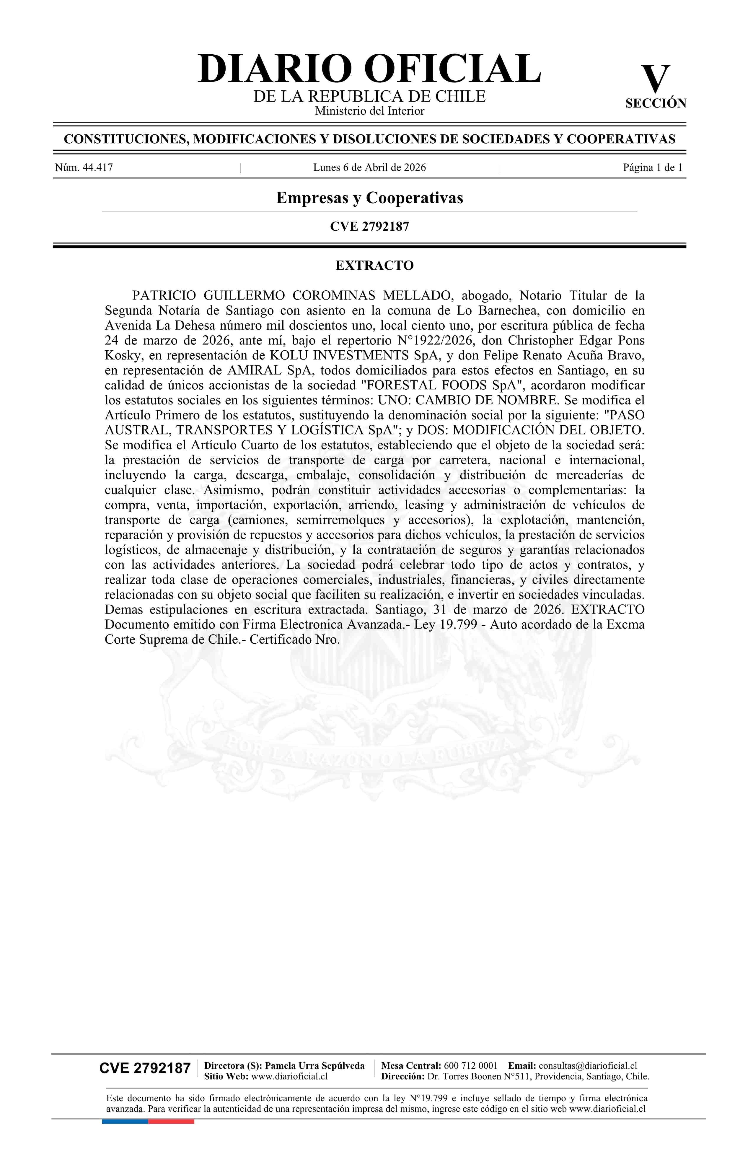 Paso Austral, Transportes y Logística SpA 78.163.699-1* 06-04-2026 Diario Oficial Edición Electrónica |