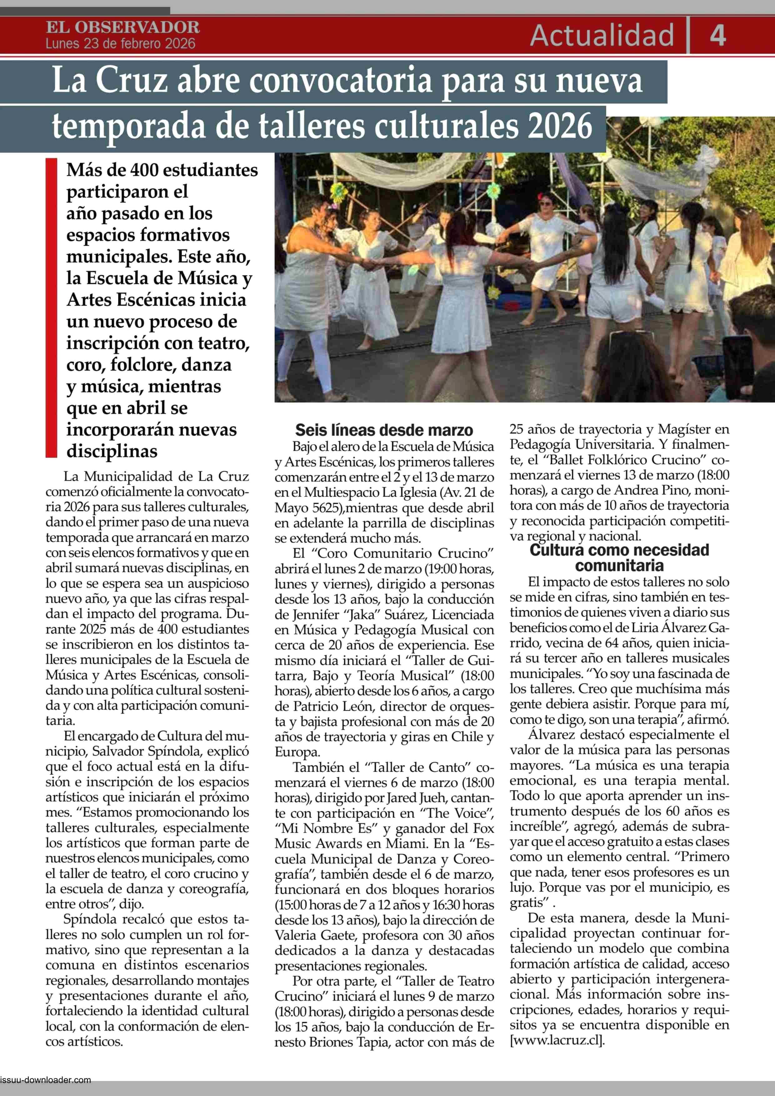 La Cruz abre convocatoria para su nueva temporada de talleres culturales 2026 23-02-2026 El Observador Vespertino |