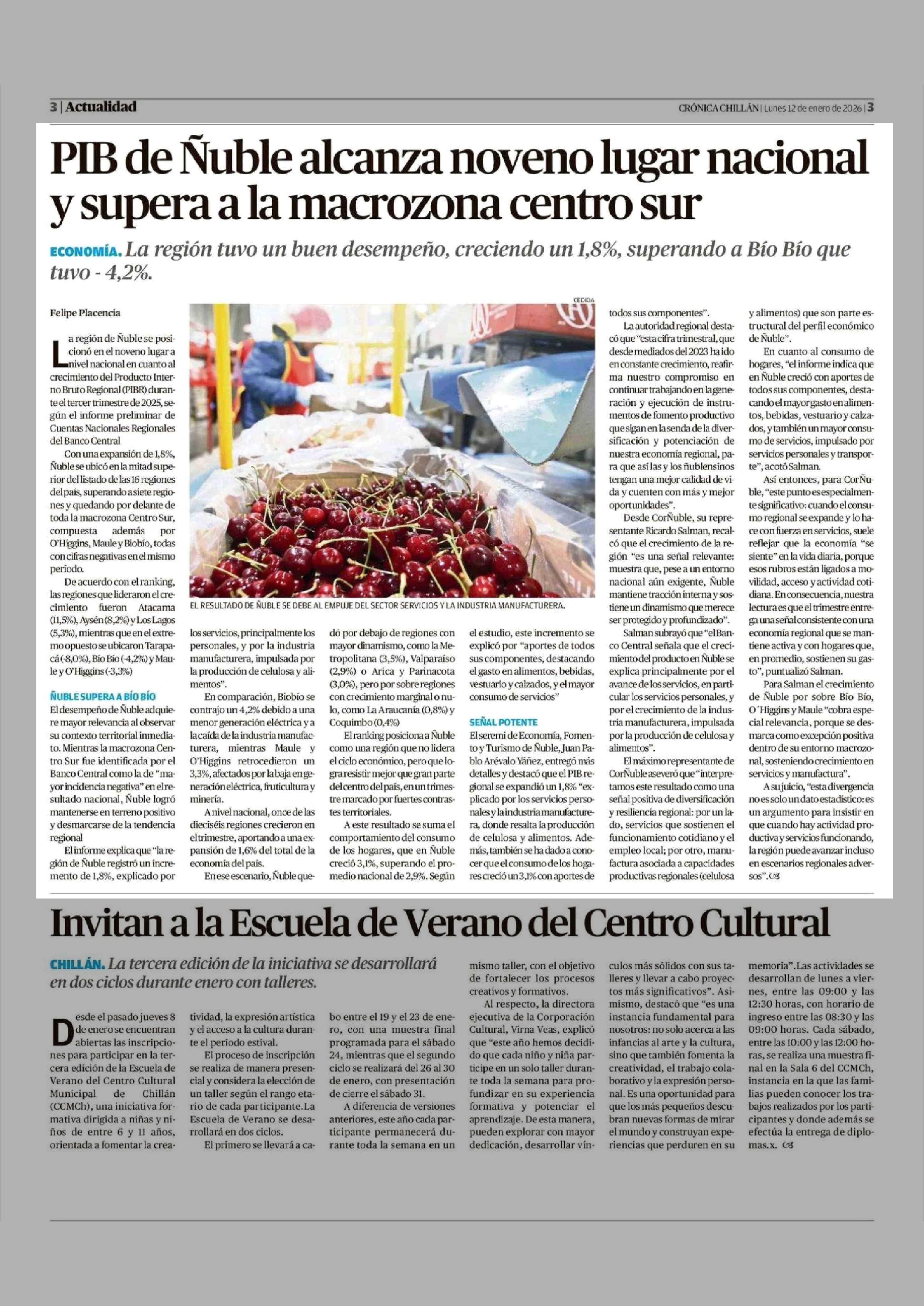PIB de Ñuble alcanza noveno lugar nacional y supera a la macrozona centro sur 12-01-2026 Crónica de Chillán |