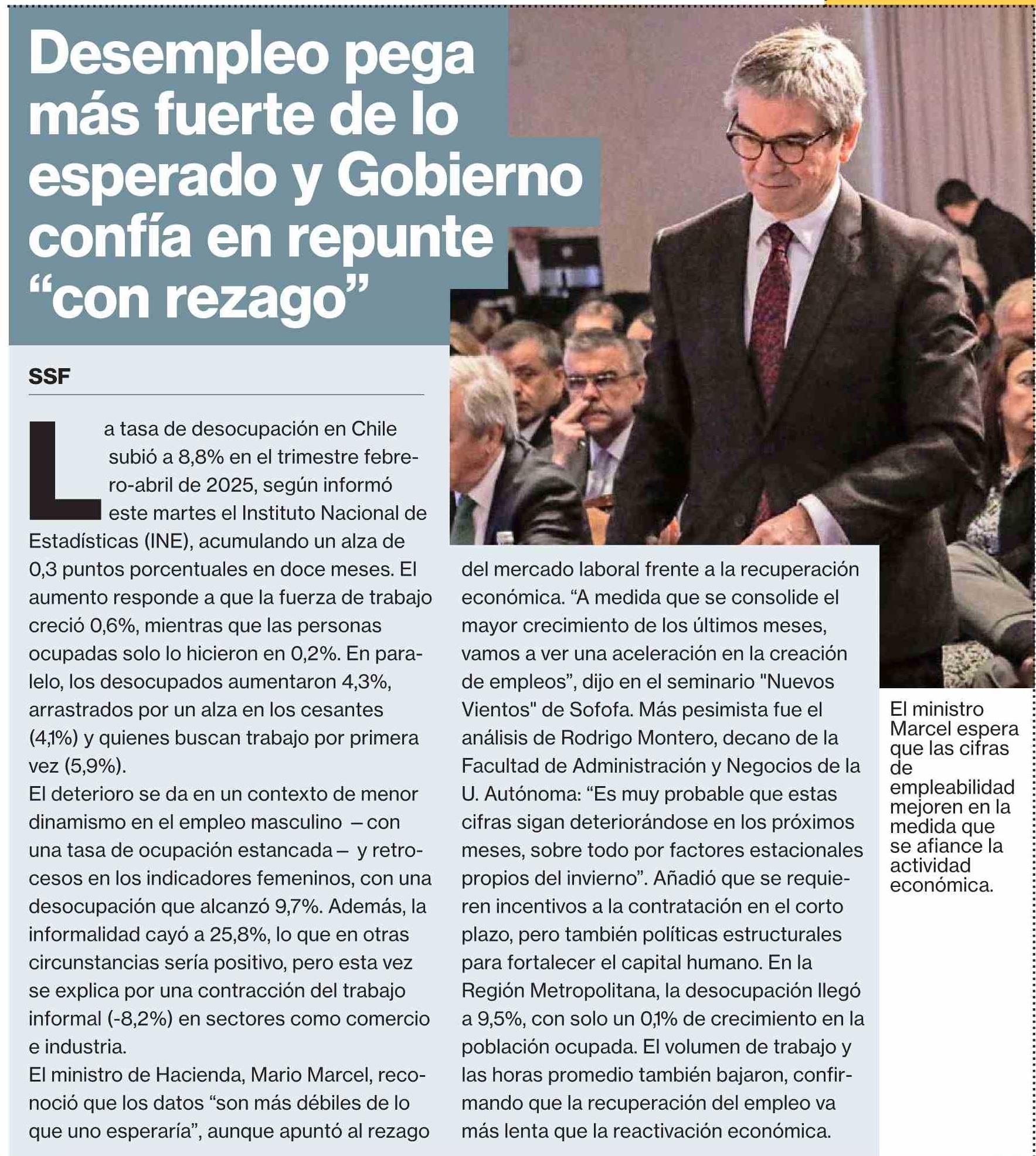 Desempleo pega más fuerte de lo esperado y Gobierno confía en repunte "con rezago" 29-05-2025 La Segunda |