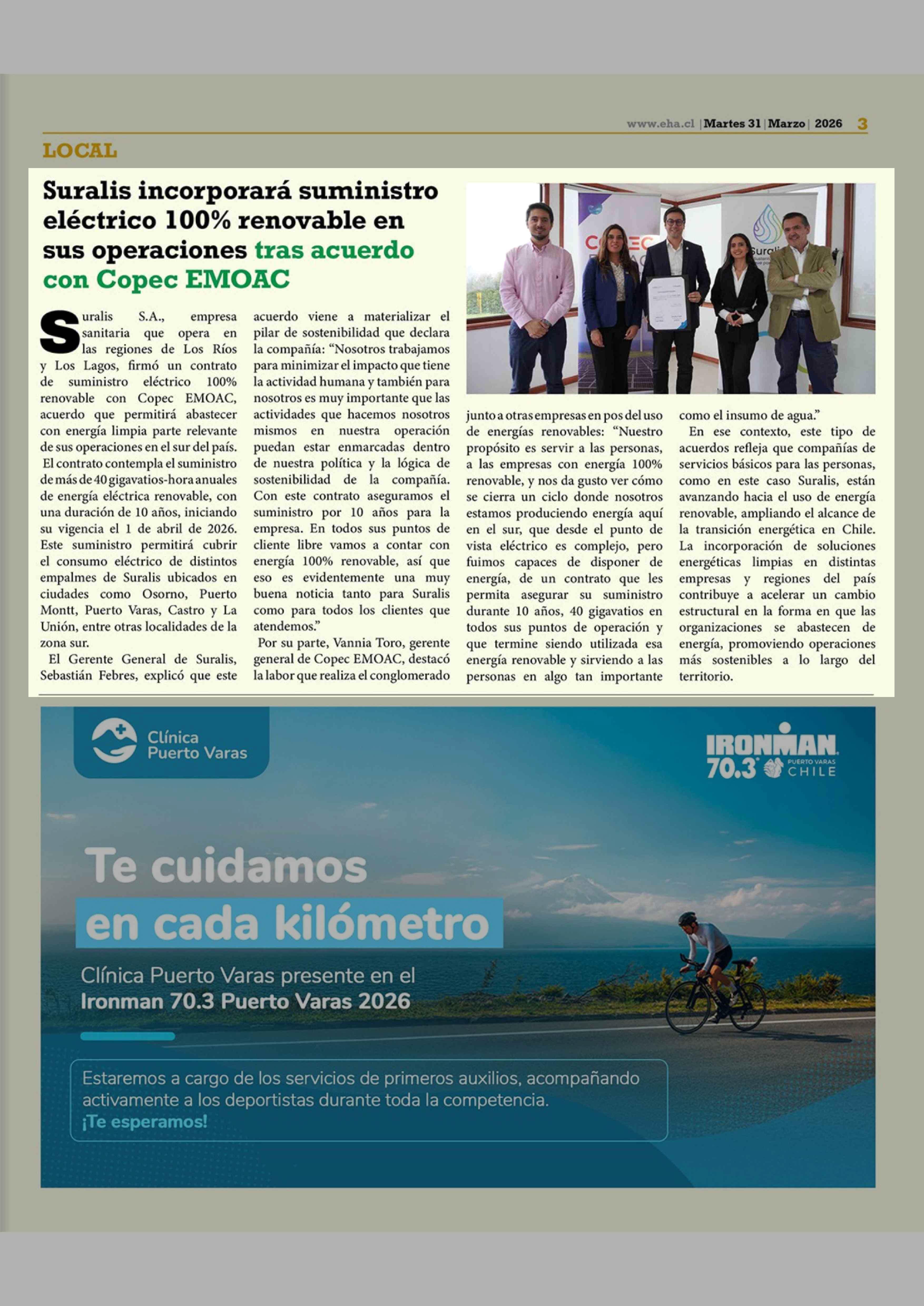 Suralis incorporará suministro eléctrico 100% renovable en sus operaciones tras acuerdo con Copec EMOAC 31-03-2026 El Heraldo Austral |