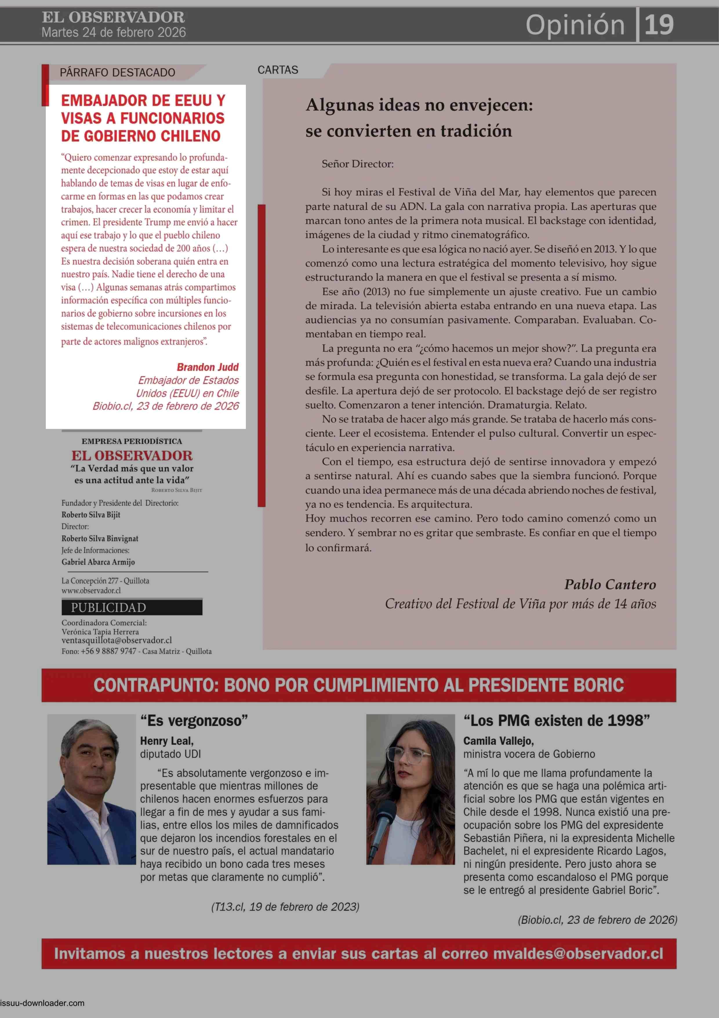 CARTAS: EMBAJADOR DE EEUU Y VISAS A FUNCIONARIOS DE GOBIERNO CHILENO 24-02-2026 El Observador Vespertino |
