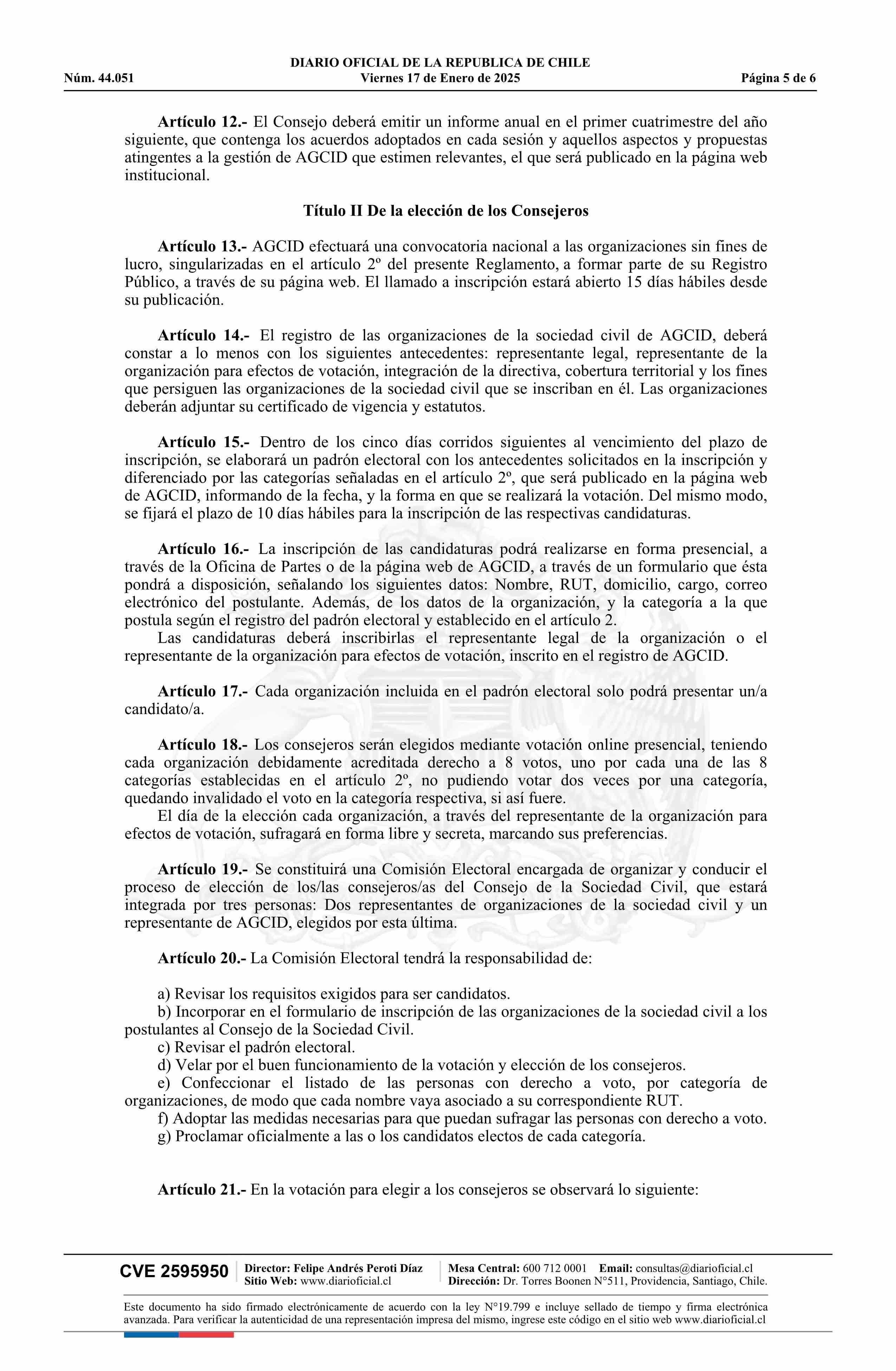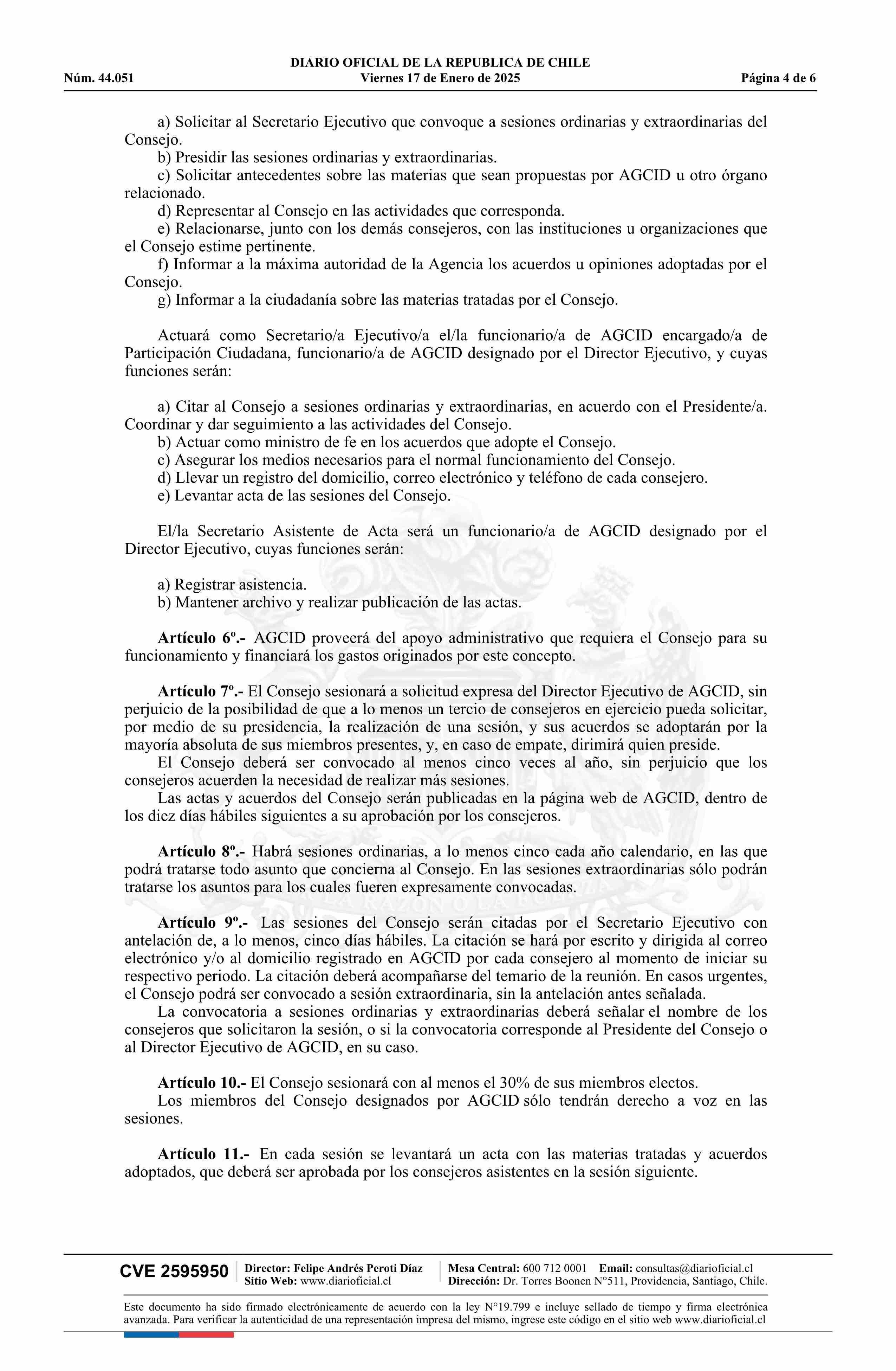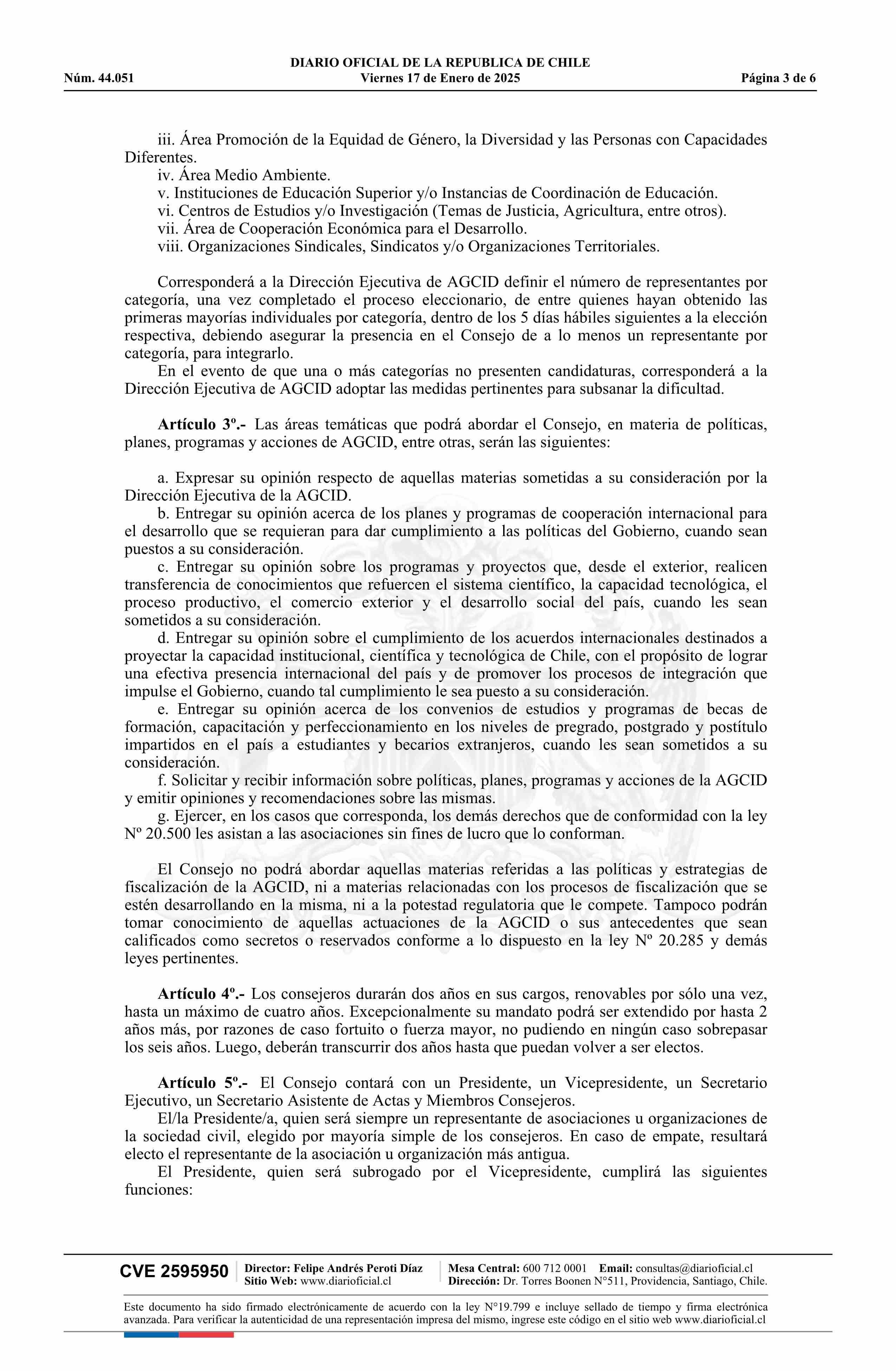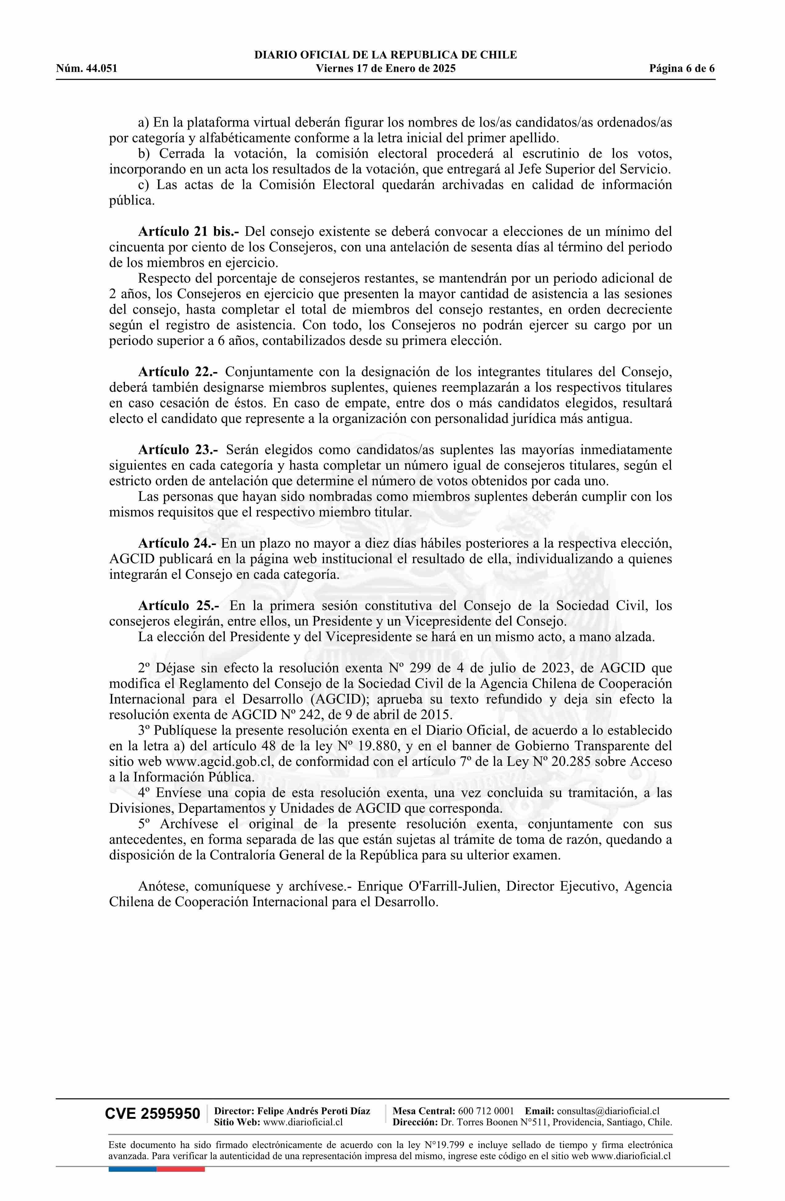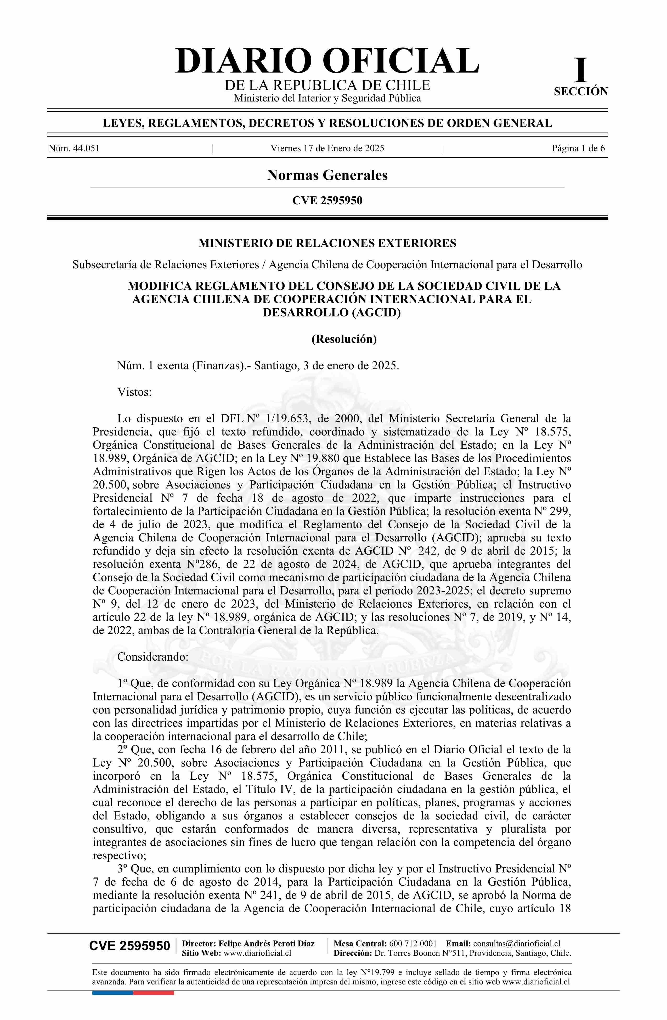 | Título: | Resolución exenta número 1, de 2025.- Modifica Reglamento del Consejo de la Sociedad Civil de la Agencia Chilena de Cooperación Internacional para el Desarrollo |