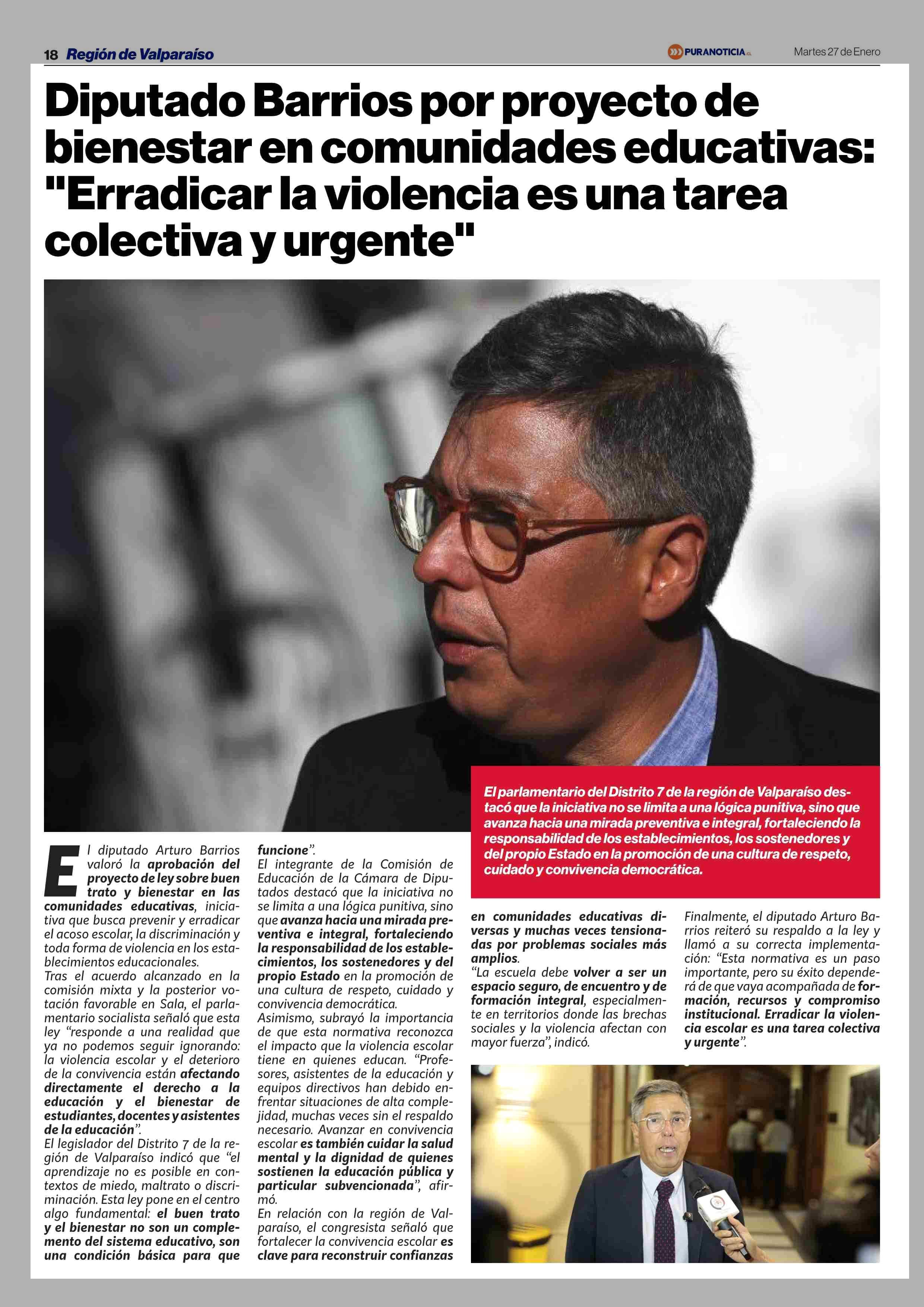 Diputado Barrios por proyecto de bienestar en comunidades educativas: "Erradicar la violencia es una tarea colectiva y urgente” 27-01-2026 Puranoticia.cl |
