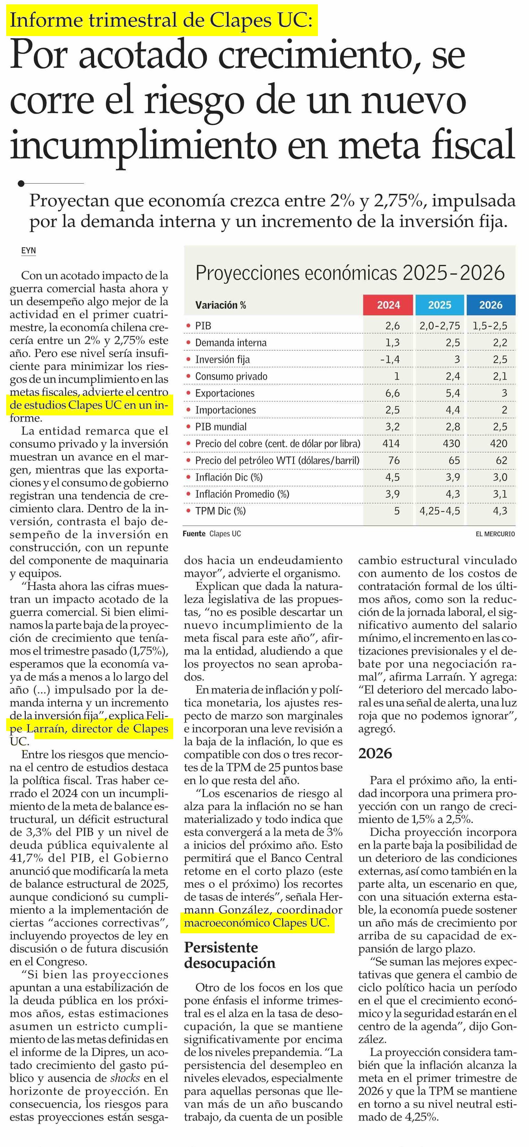 Por acotado crecimiento, se corre el riesgo de un nuevo incumplimiento en meta fiscal 17-06-2025 El Mercurio |