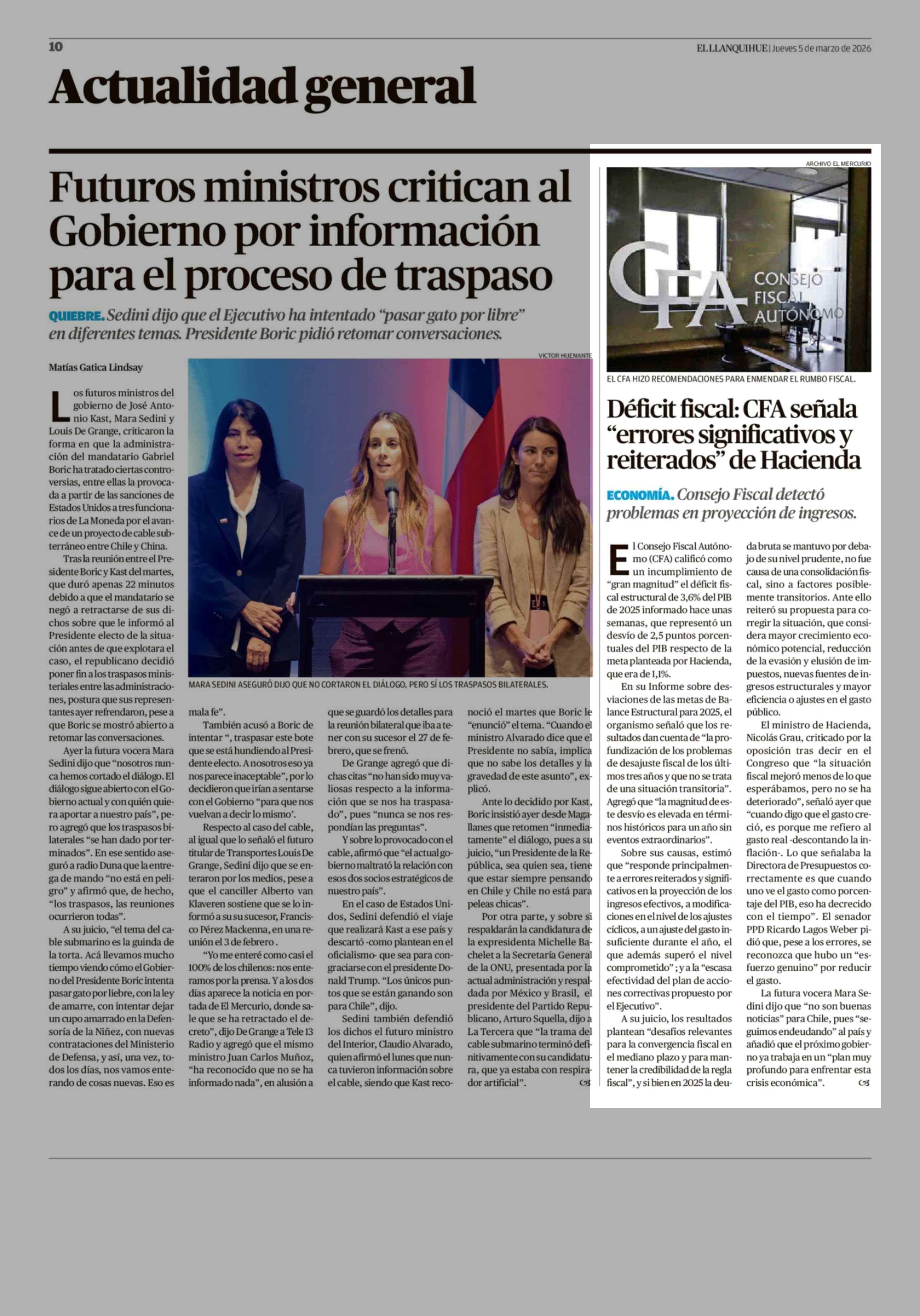 Déficit fiscal: CFA señala "errores significativos y reiterados" de Hacienda 05-03-2026 El Llanquihue |