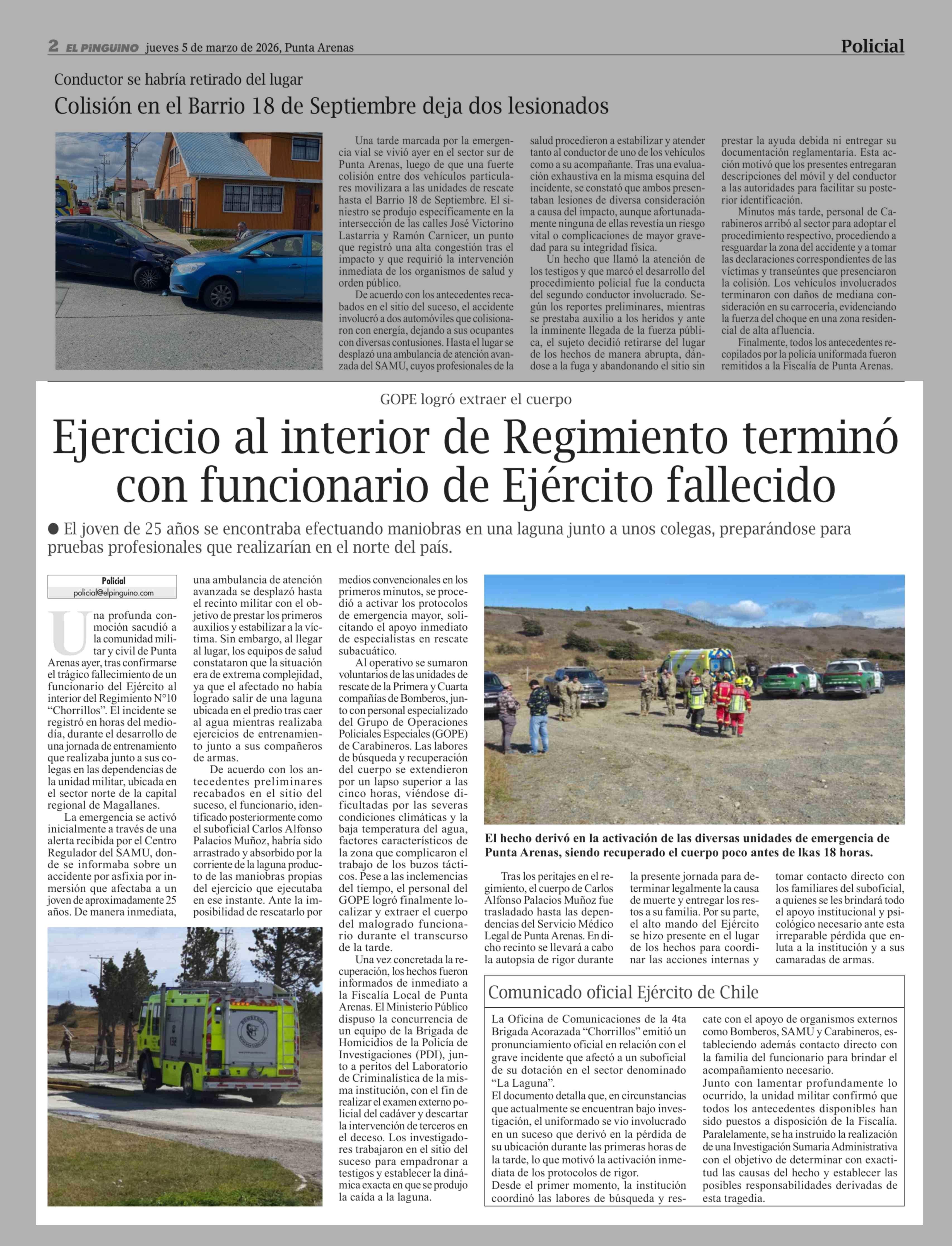Ejercicio al interior de Regimiento terminó con funcionario de Ejército fallecido 05-03-2026 El Pingüino |
