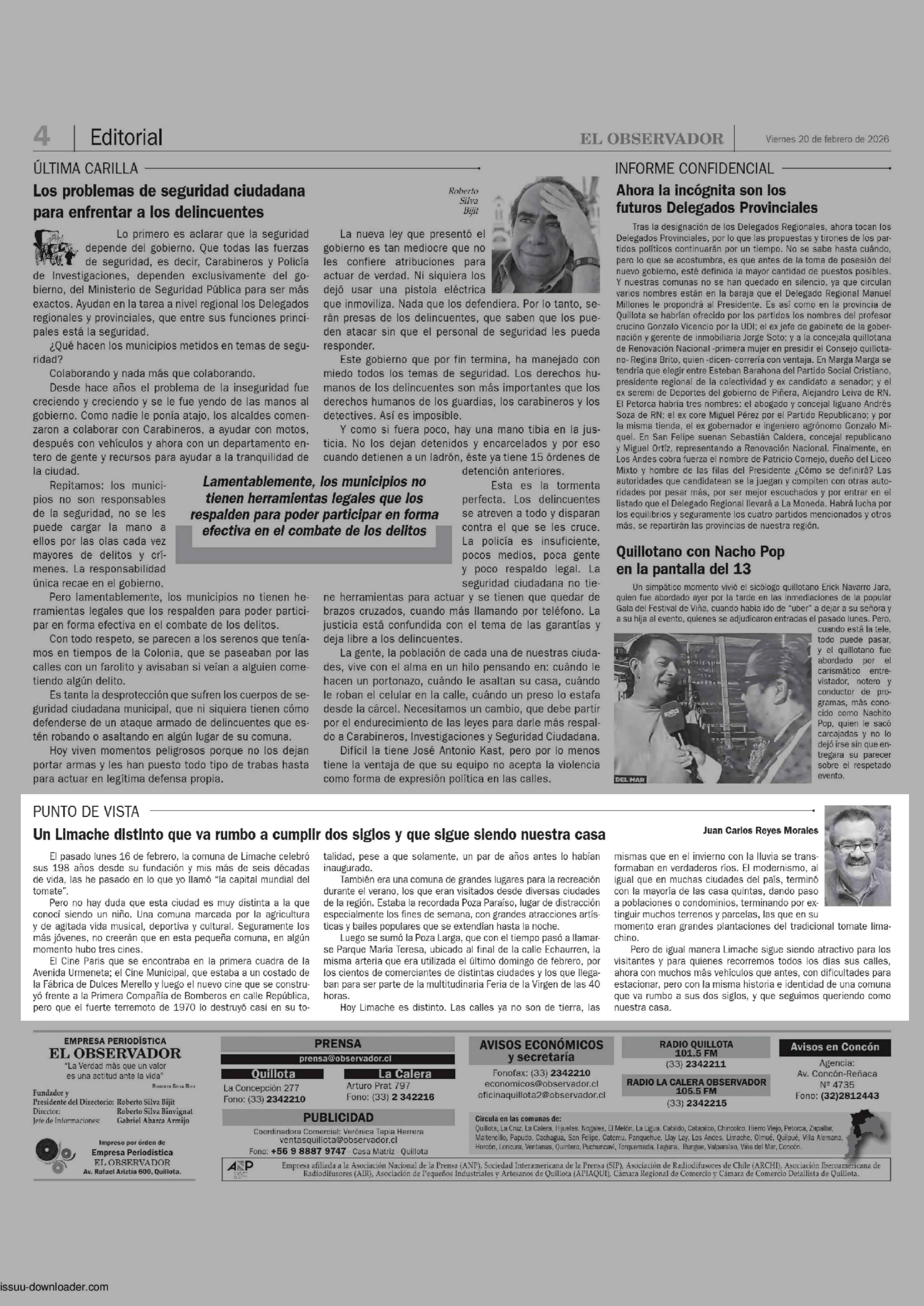 Columnas de Opinión: Un Limache distinto que va rumbo a cumplir dos siglos y que sigue siendo nuestra casa 20-02-2026 El Observador |