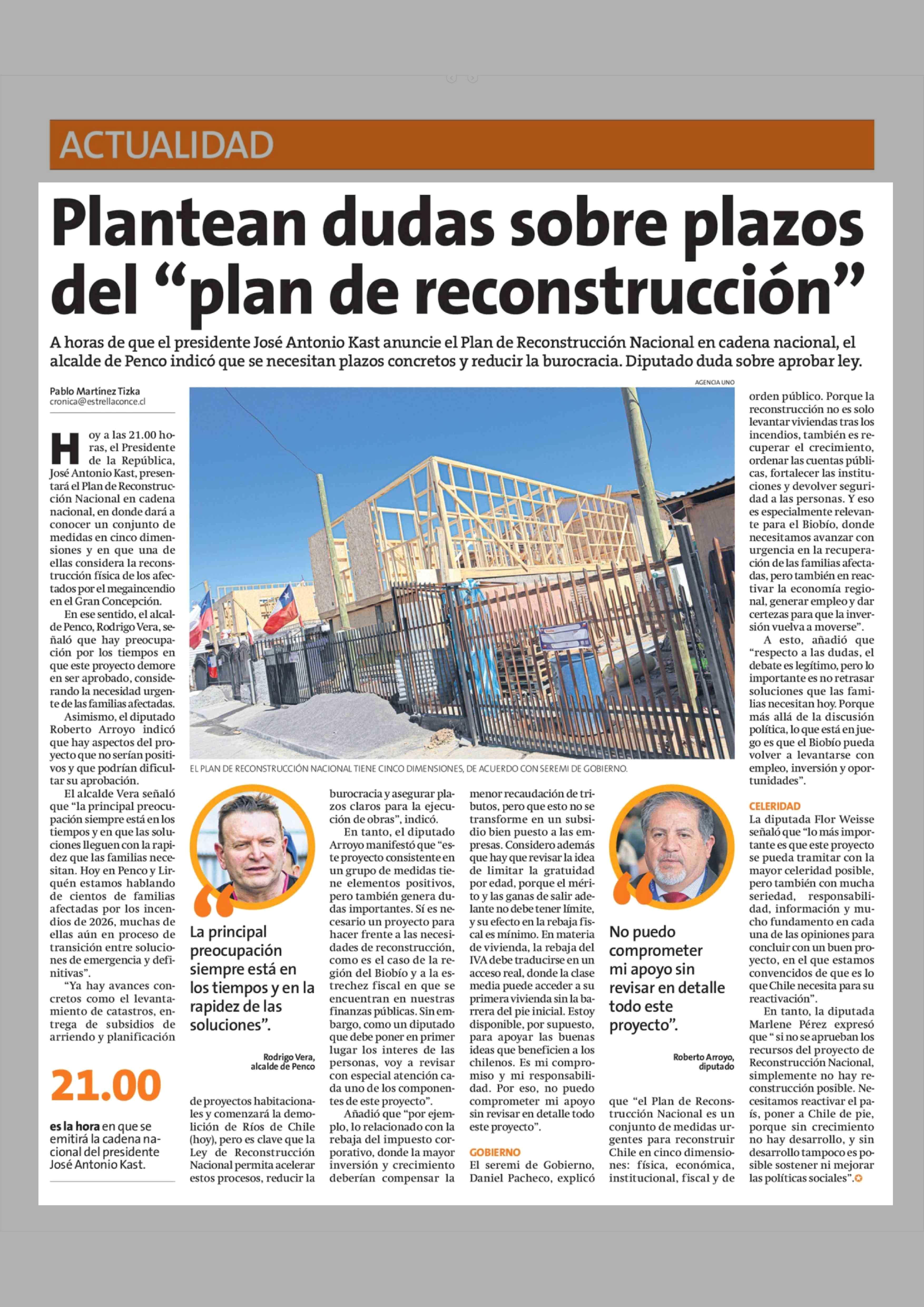 Plantean dudas sobre plazos del "plan de reconstrucción" 15-04-2026 La Estrella de Concepción |