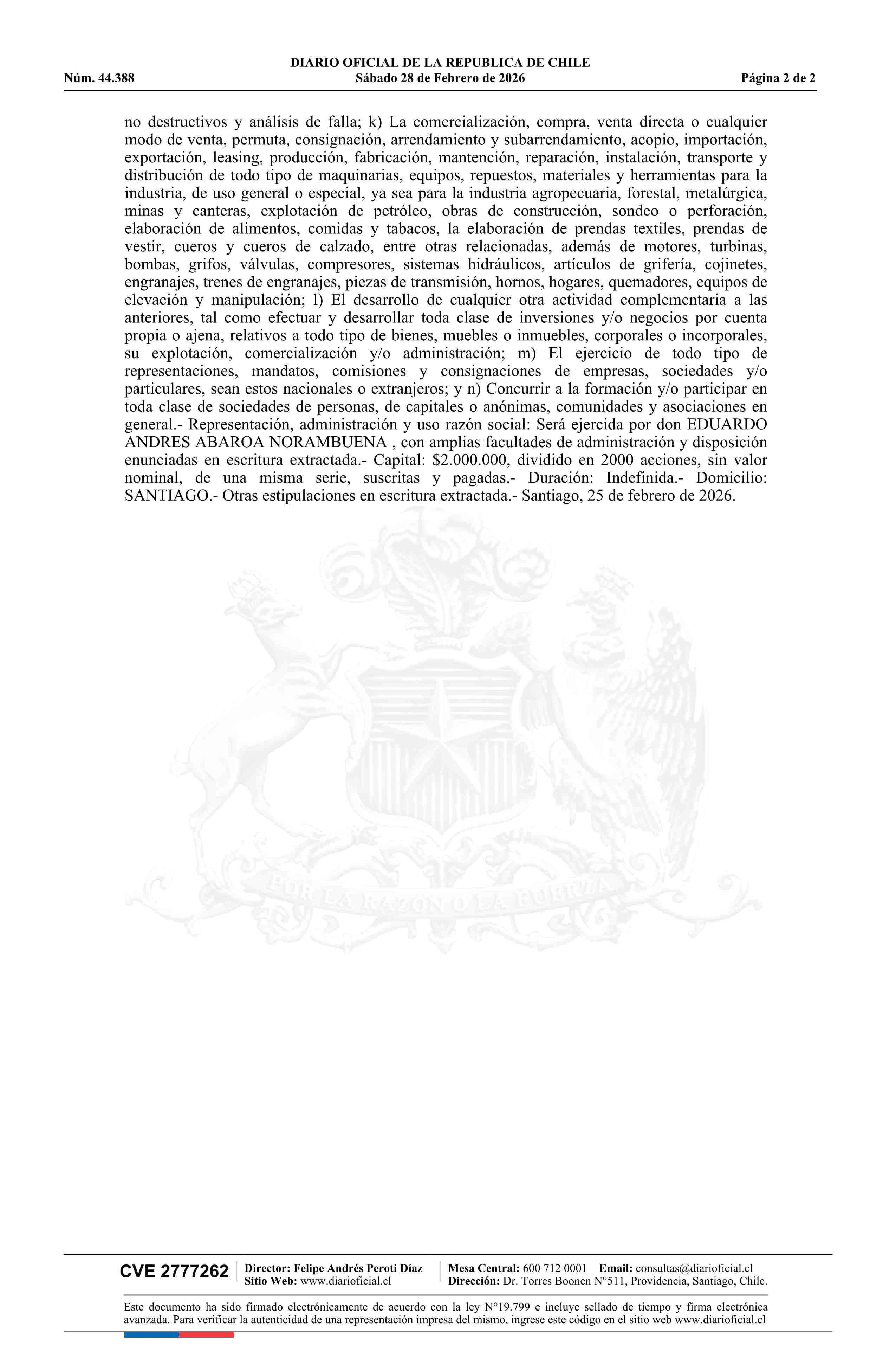 ABAROA SpA 28-02-2026 Diario Oficial Edición Electrónica |