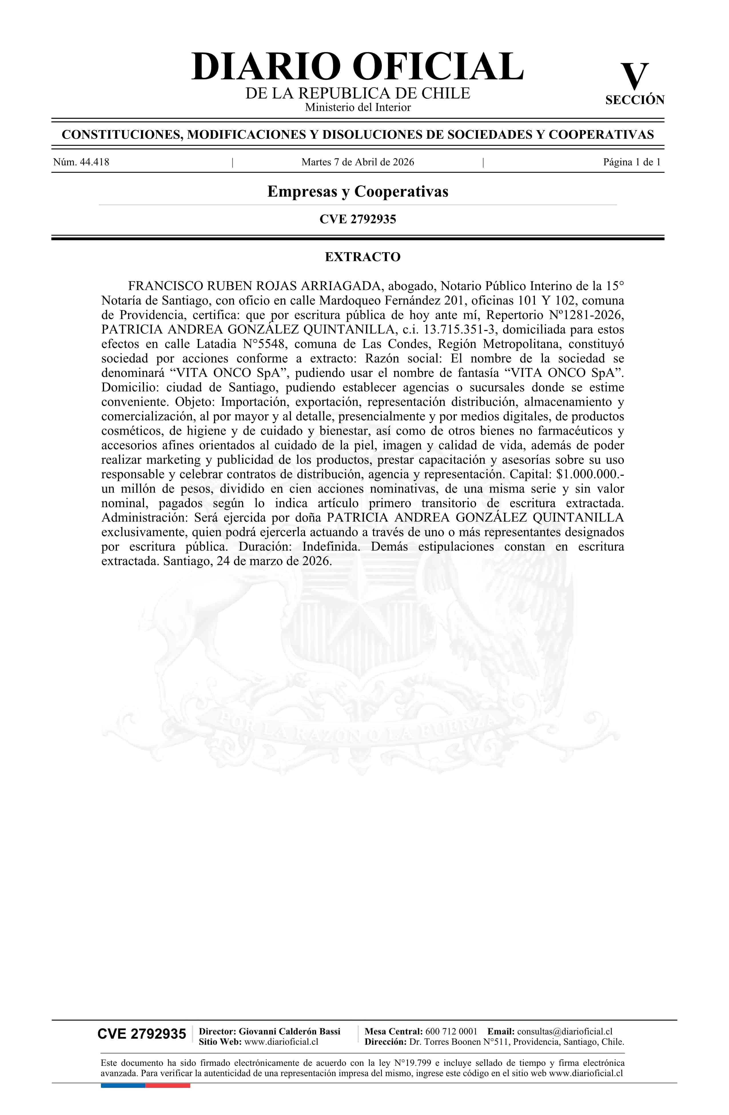Vita Onco SpA 07-04-2026 Diario Oficial Edición Electrónica |