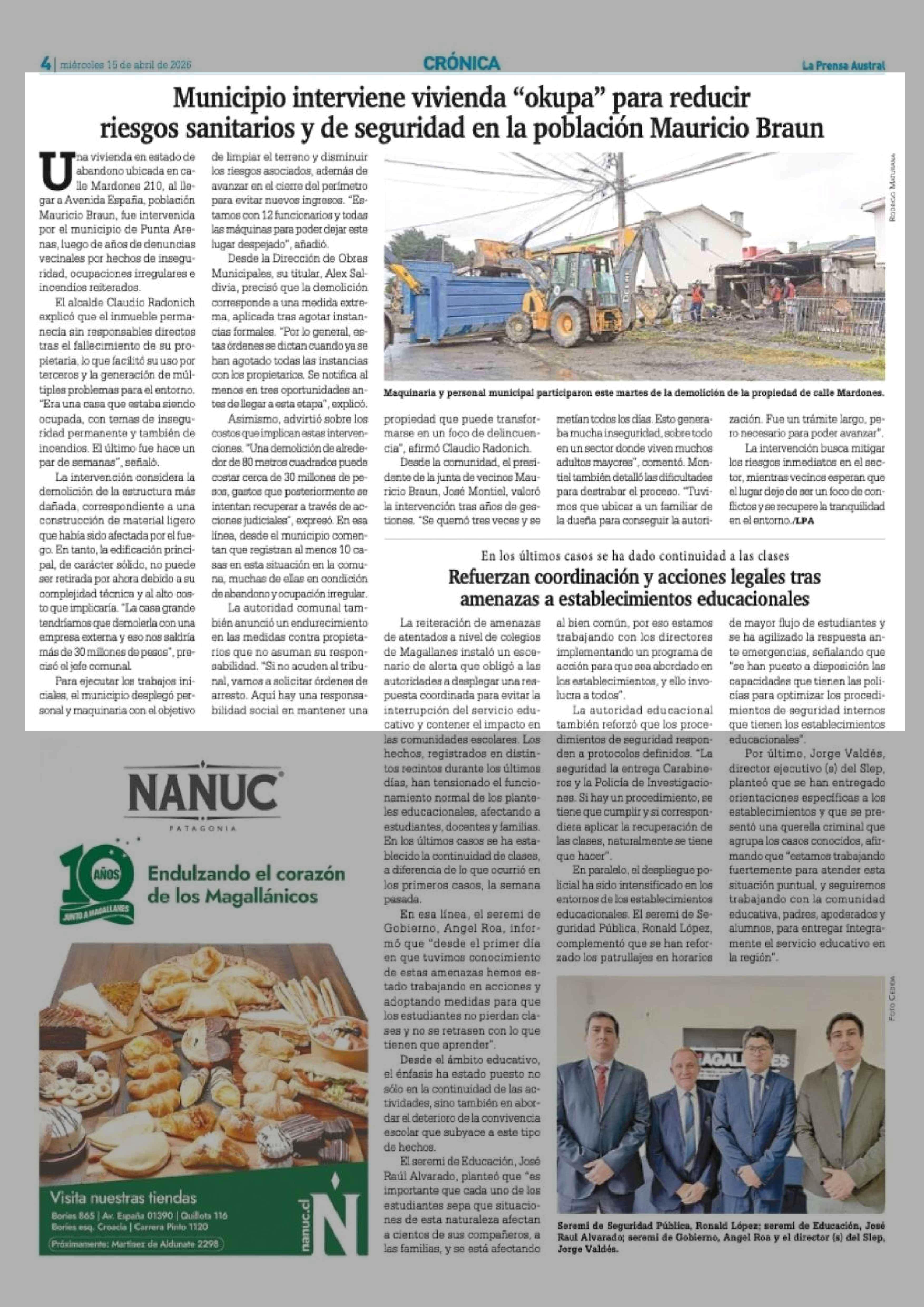 Municipio interviene vivienda "okupa" para reducir riesgos sanitarios y de seguridad en la población Mauricio Braun 15-04-2026 La Prensa Austral |