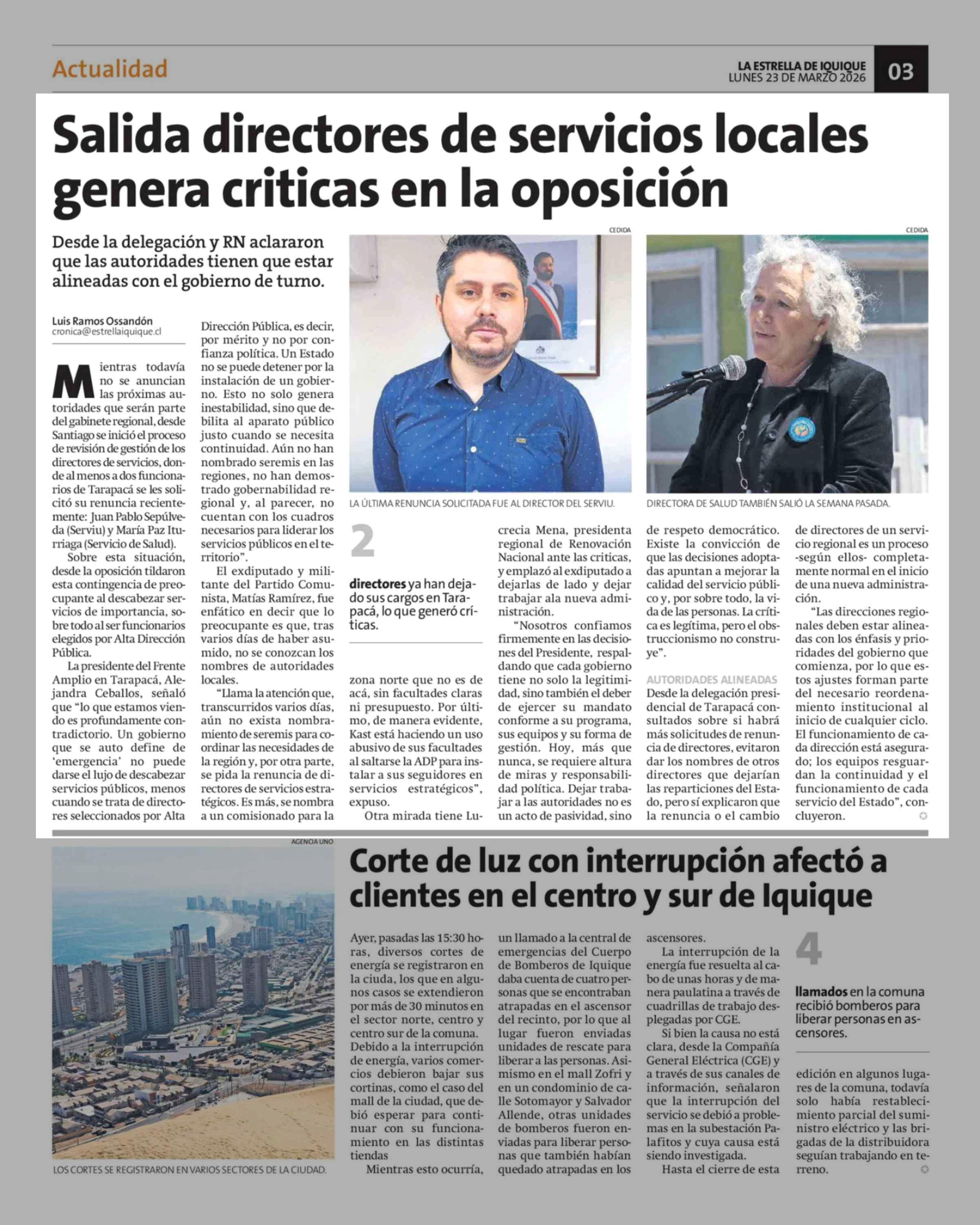 Salida directores de servicios locales genera criticas en la oposición 23-03-2026 La Estrella de Iquique |