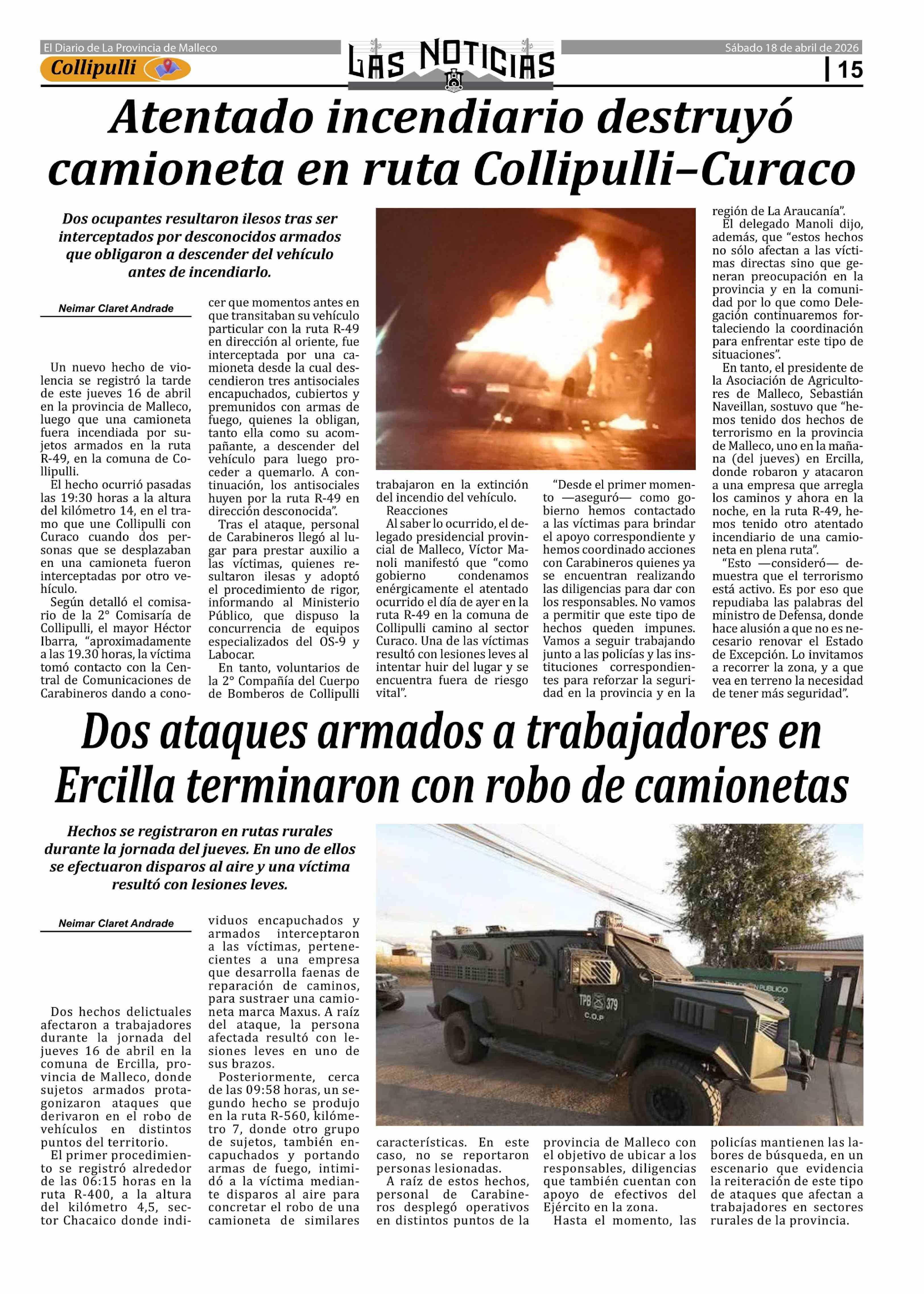 Título: Atentado incendiario destruyó camioneta en ruta Collipulli-Curaco