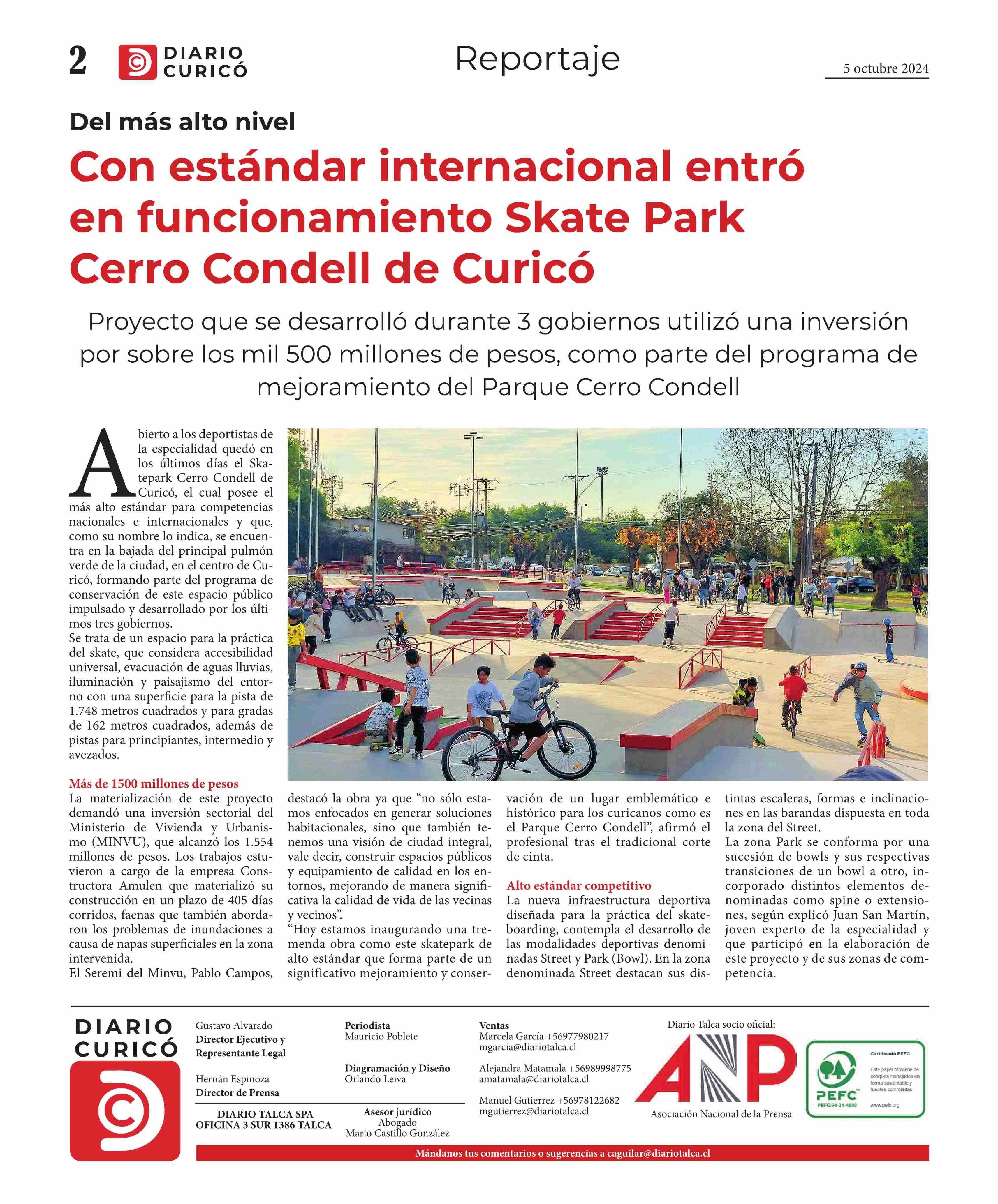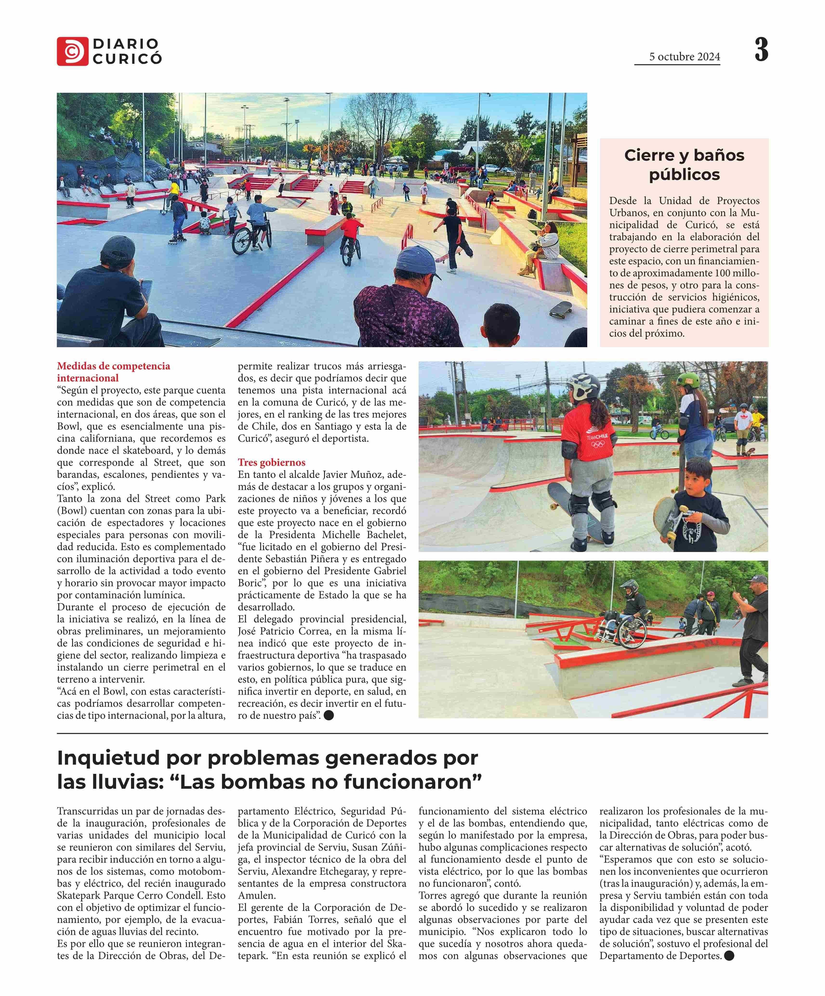 Con estándar internacional entró en funcionamiento Skate Park Cerro Condeil de Curicó 05-10-2024 Diario Talca |