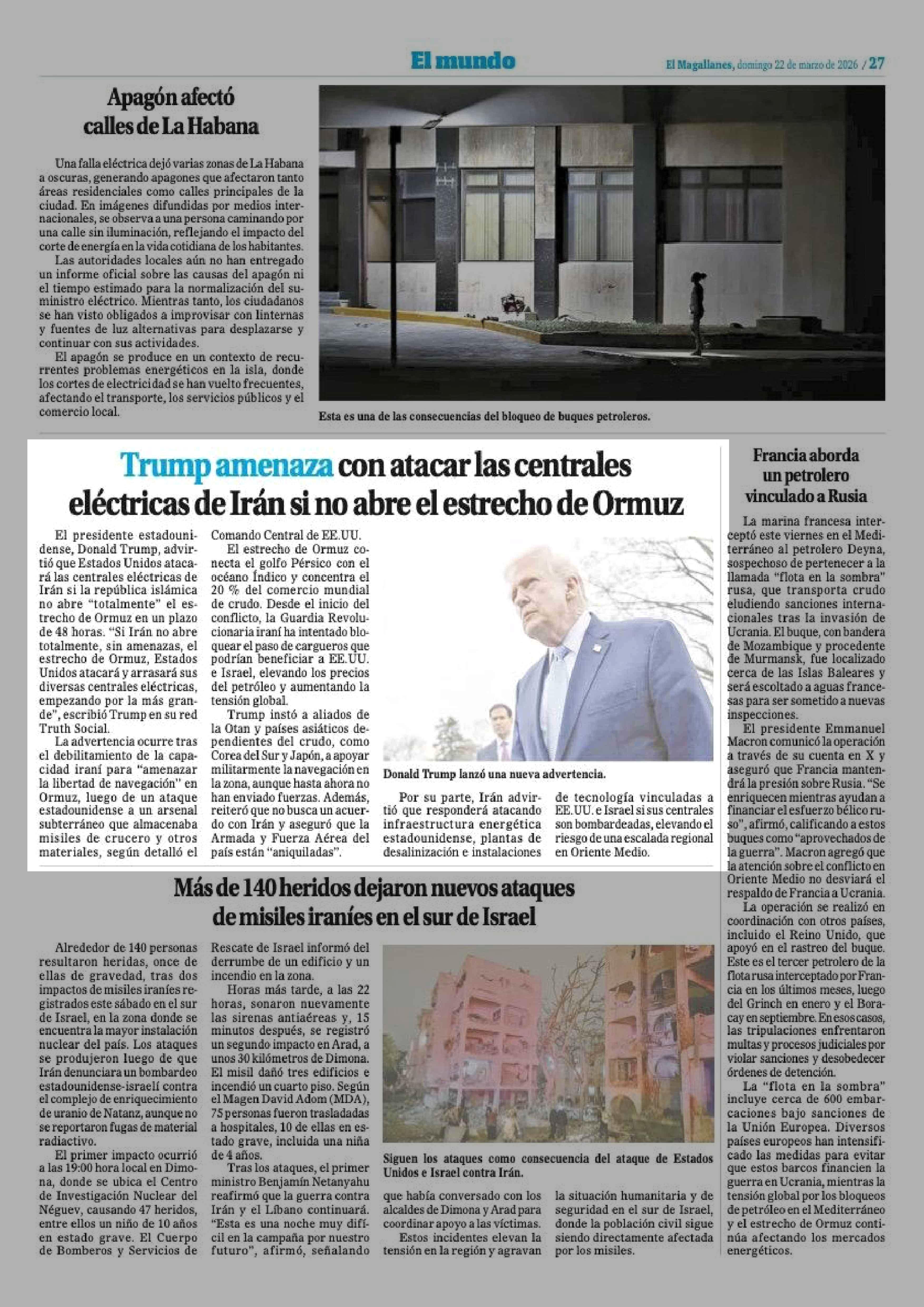 Título: Trump amenaza con atacar las centrales eléctricas de Irán si no abre el estrecho de Ormuz