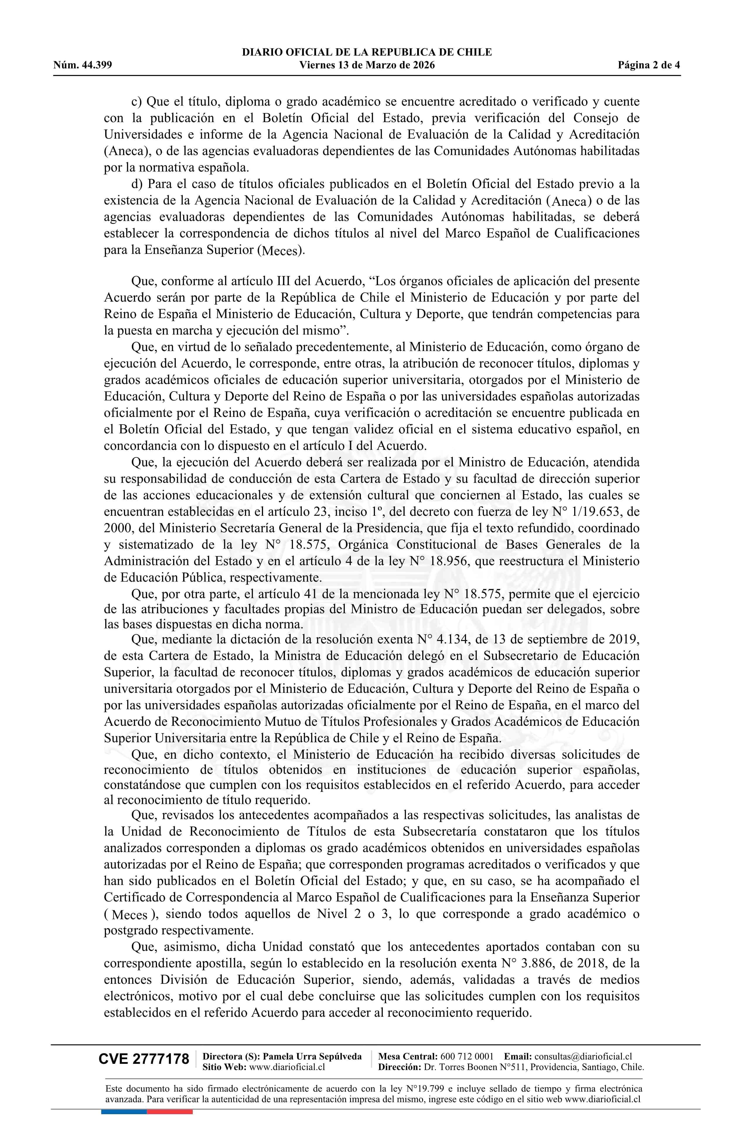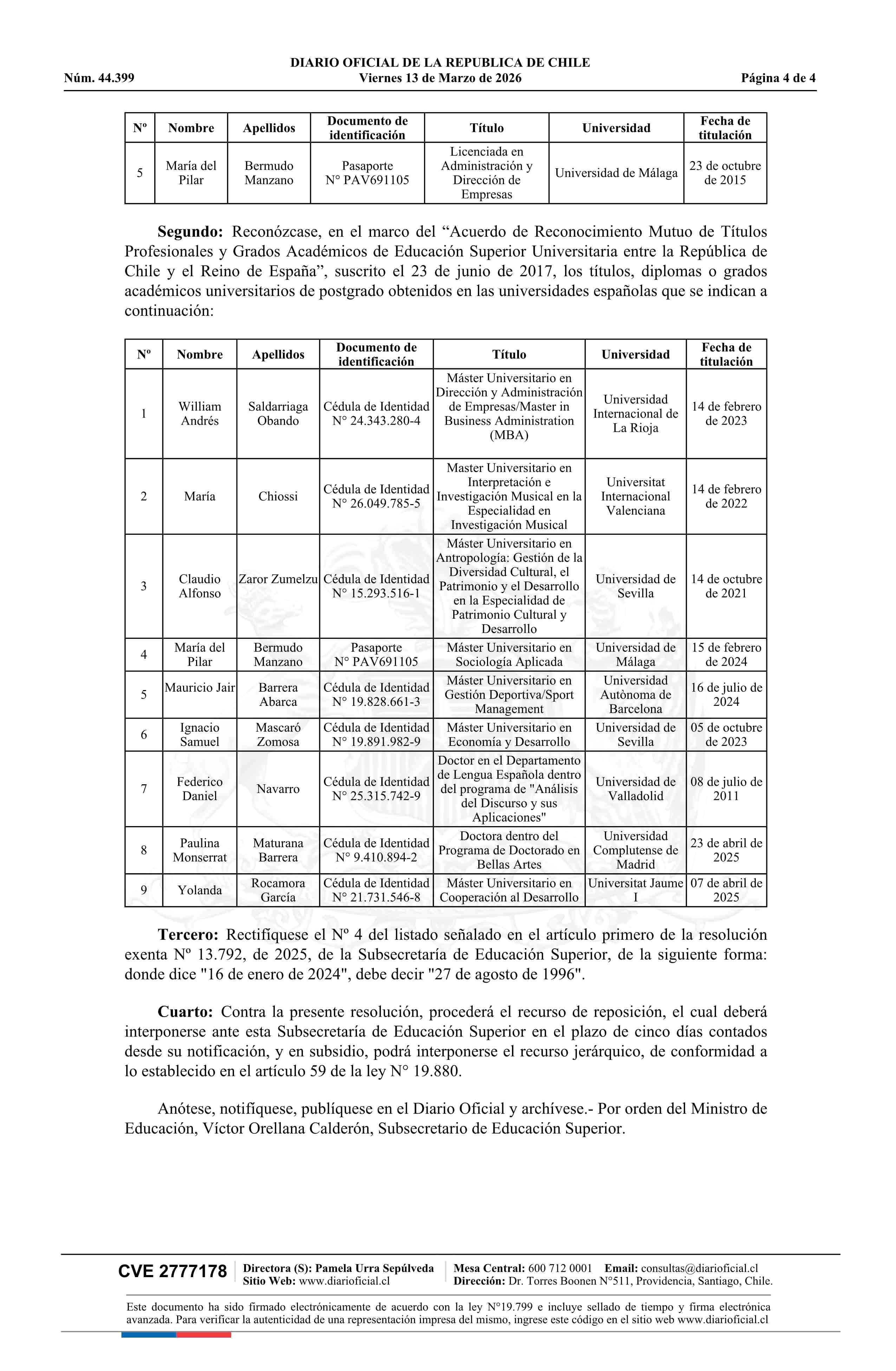 | Título: | Resolución exenta número 875, de 2026.- Reconoce títulos expedidos por universidades españolas que indica, en el marco del Acuerdo de Reconocimiento Mutuo de Títulos Profesionales y Grados Académicos de Educación Superior Universitaria entre la República de Chile y el Reino de España, y rectifica la |