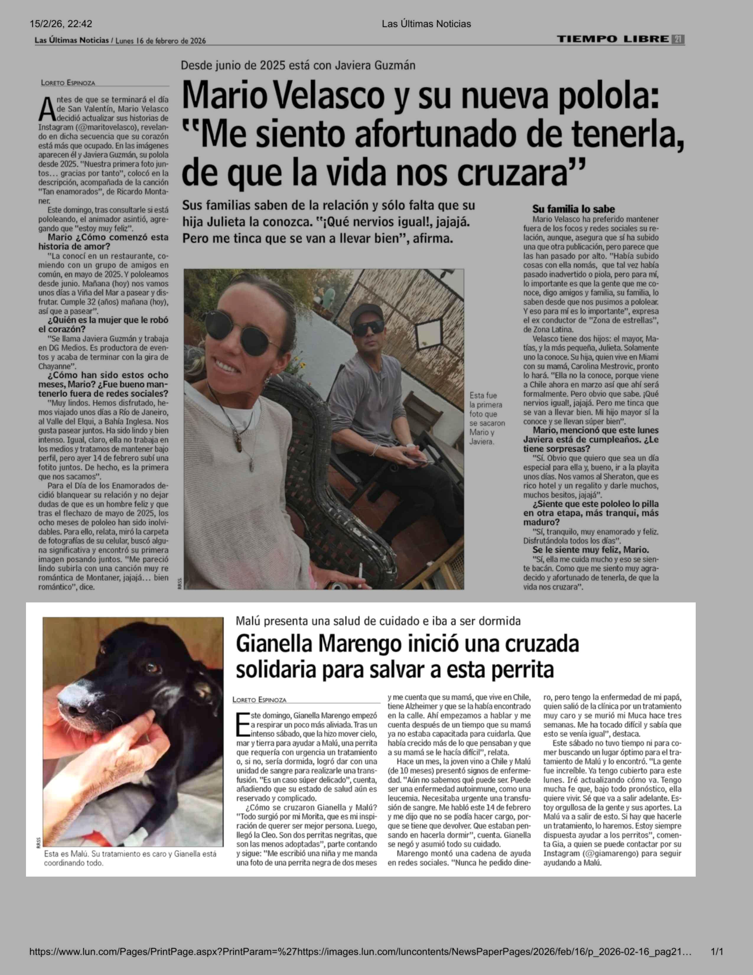 Gianella Marengo inició una cruzada solidaria para salvar a esta perrita 16-02-2026 Las Últimas Noticias |