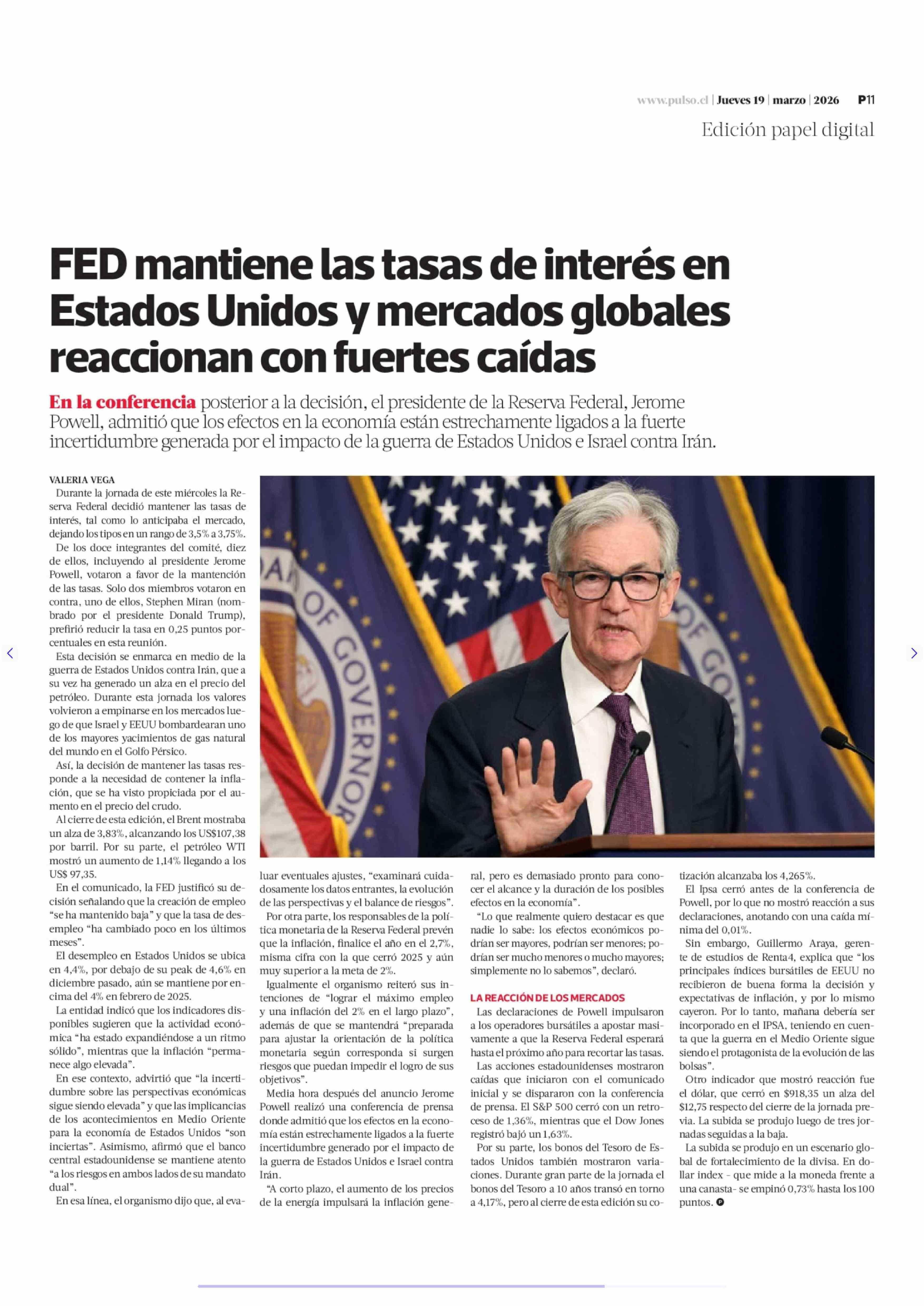 Título: FED mantiene las tasas de interés en Estados Unidos y mercados globales reaccionan con fuertes caídas