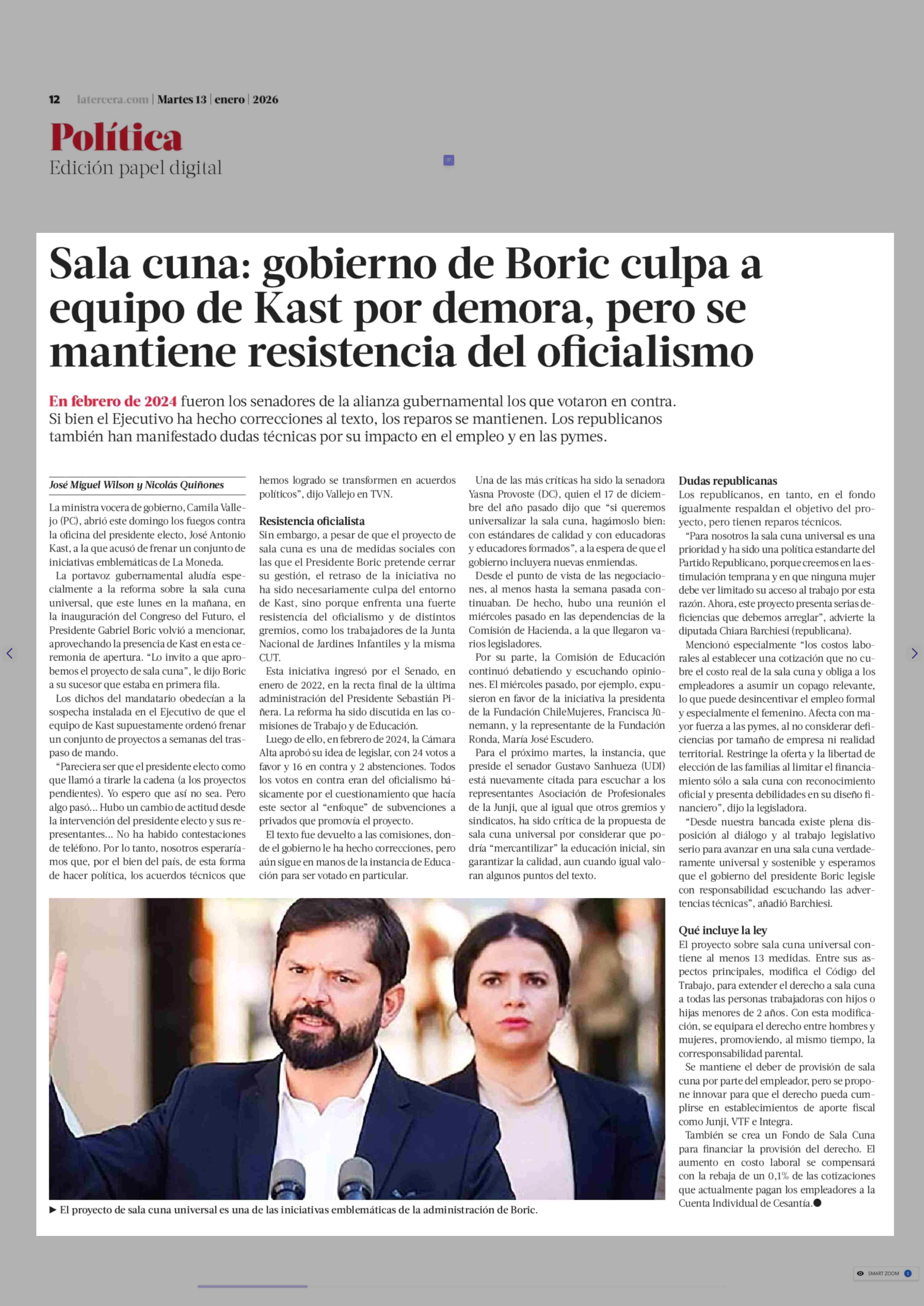 Sala cuna: gobierno de Boric culpa a equipo de Kast por demora, pero se mantiene resistencia del oficialismo 13-01-2026 La Tercera |