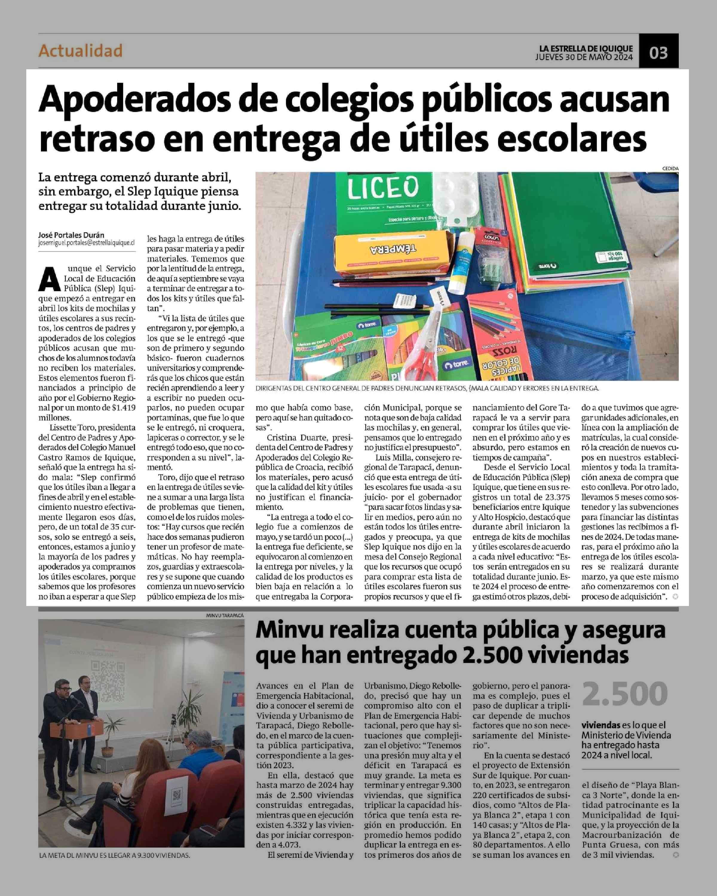 Apoderados de colegios públicos acusan retraso en entrega de útiles escolares 30-05-2024 La Estrella de Iquique |