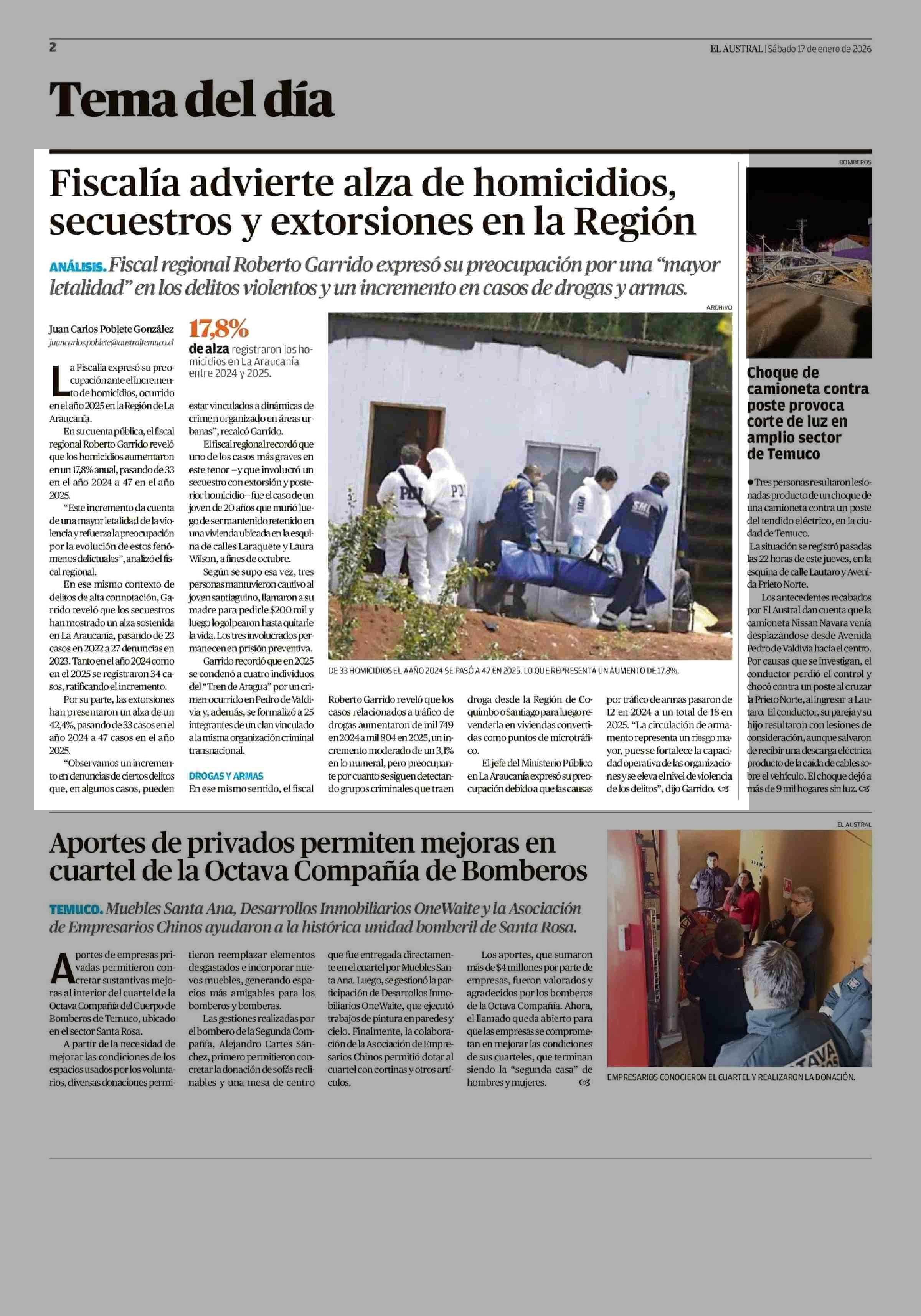 Fiscalía advierte alza de homicidios, secuestros y extorsiones en la Región 17-01-2026 El Austral de la Araucanía |