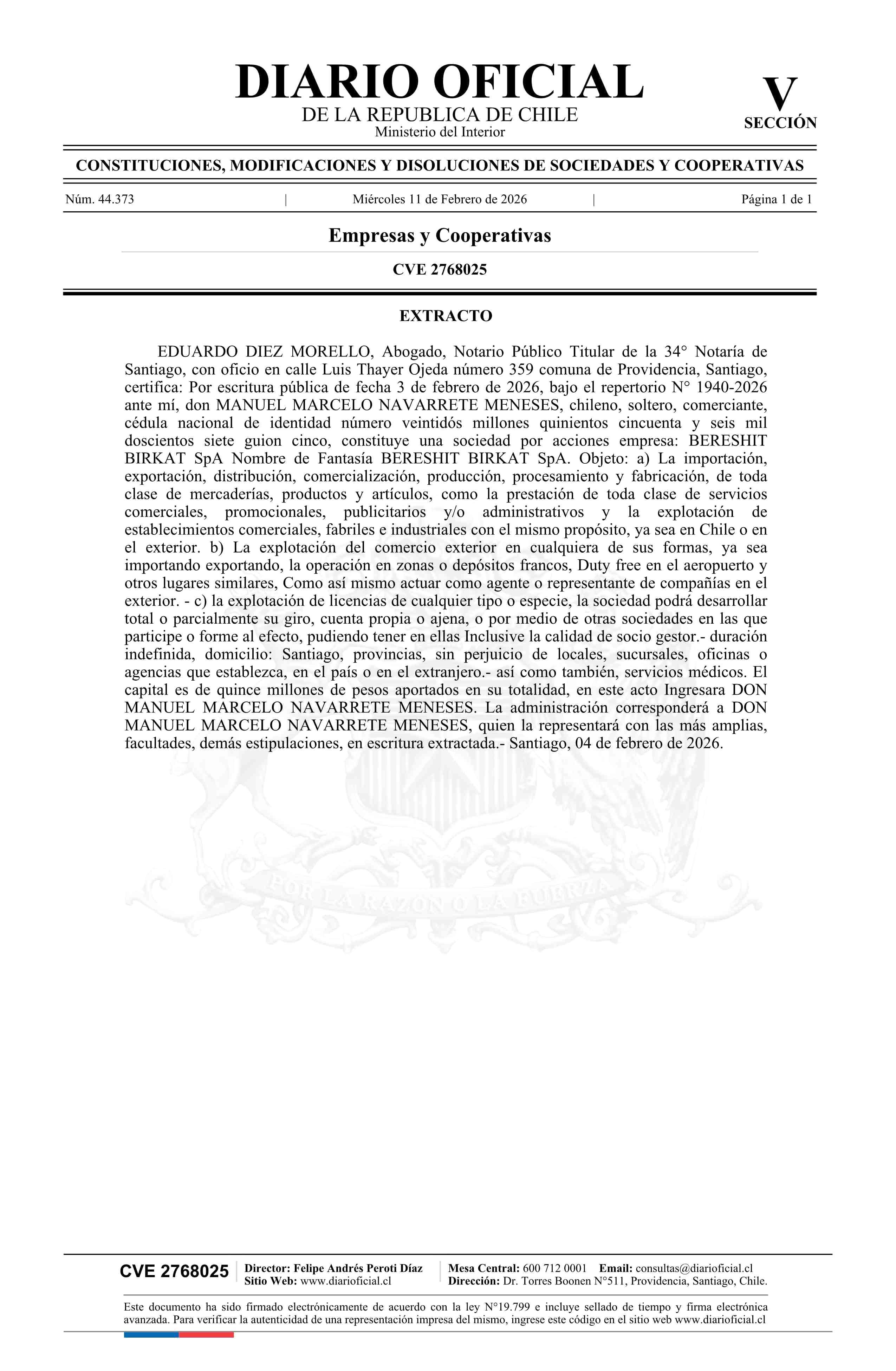 Título: Bereshit Birkat SpA